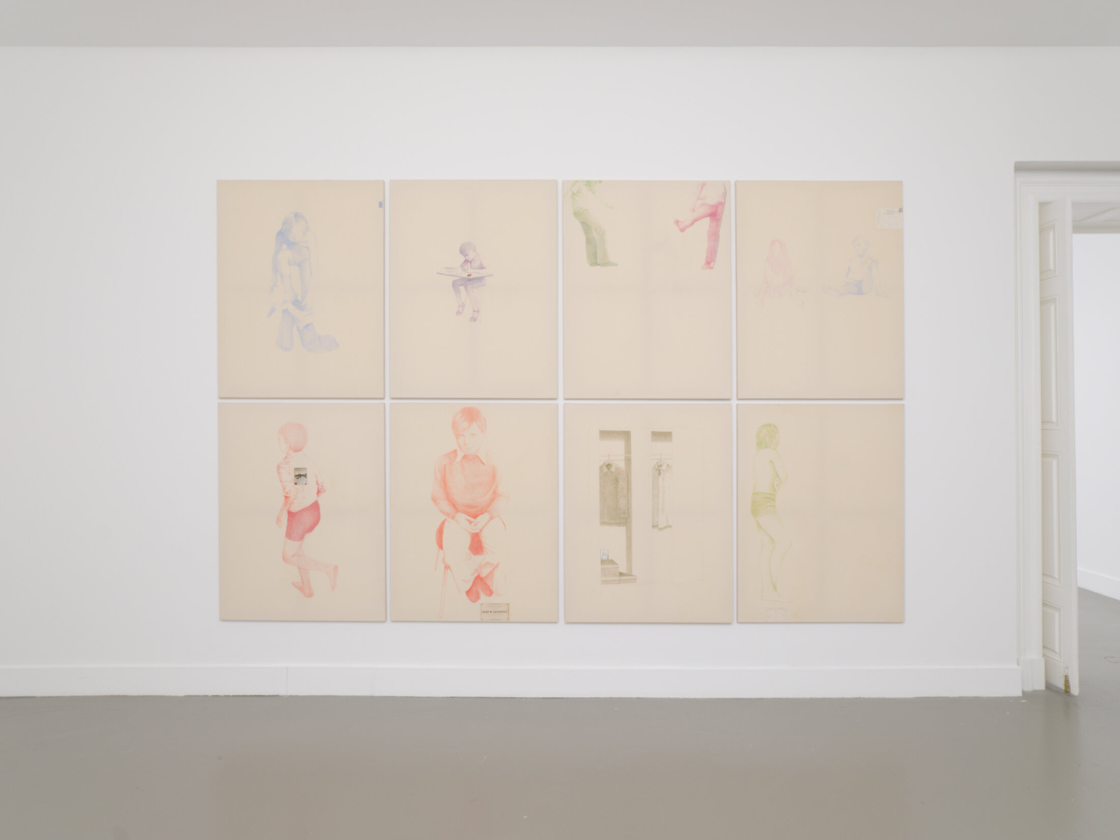 Composée de huit toiles dessinées aux crayons de couleur à la manière d’un cahier d’écolier clandestin, collages de fragments épars et animée d’une bande sonore qui murmure des secrets, l’installation « Conseils à un apprenti » (1997) n’est pas une leçon magistrale mais un strip-tease de l’âme, une archéologie sensible dans laquelle l’artiste exhume les vestiges d’une adolescence qui refuse de se taire. Montrée une seule fois auparavant, elle surgit comme un moment charnière, un seuil où l’obéissance forcée de l’enfance cède à la rage qui bout sous la peau. Chaque toile est un chapitre griffonné. Des figures humaines émergent d’un lavis crayonné qui évoque les exercices scolaires. Françoise Pétrovitch en confie l’origine : un cahier de conseils. « Il n’y a pas de gestes rapides, le temps est plus appliqué, plus observé, plus ralenti aussi, comme un apprentissage, avec un côté un peu punitif, qui demande des outils particuliers. Et à chaque fois, il y a un élément issu du réel, collé sur la toile » précise l’artiste, avant de poursuivre « Dans l’avant-dernière toile, j’ai dessiné un placard et j’ai collé un photomaton pris lorsque j’avais 13 ans, un petit autoportrait noir et blanc en équilibre sur une boîte à chaussures. Conseils à un apprenti : tu es obligé d’obéir mais tu as la rage. Enfant, on s’invente beaucoup de choses, on s’évade très facilement, on se crée des mondes ». Un placard esquissé, une porte entrouverte sur le vide, et collé là, en équilibre précaire sur une boîte à chaussures, un photomaton en noir et blanc de l’artiste à treize ans. Un autoportrait minuscule, presque enfantin, qui fixe le regard avec une intensité muette. Longtemps, Françoise Pétrovitch a pris pour point de départ de ses œuvres quelque chose d’existant. « Je remarque que la peinture n’occupe pas entièrement le format, qu’elle est toujours une réponse à quelque chose d’existant, comme si je ne m’autorisais pas, finalement, à être totalement dans le format. Un peu comme une timidité, une réserve à peindre pleinement. Néanmoins, par le jeu de collage-peinture, le napperon m’a finalement permis d’aborder la peinture ! » précise-t-elle à, propos de la série « Broderie » évoquée plus haut. « Soleil » (2020), un immense tournesol en lavis d’encre sur papier, clôture l’exposition à l’étage comme la promesse d’une peinture enfin pleinement assumée, et annonce la suite à venir.