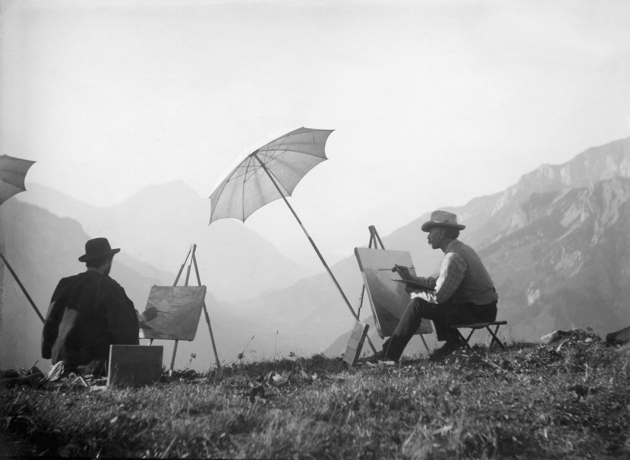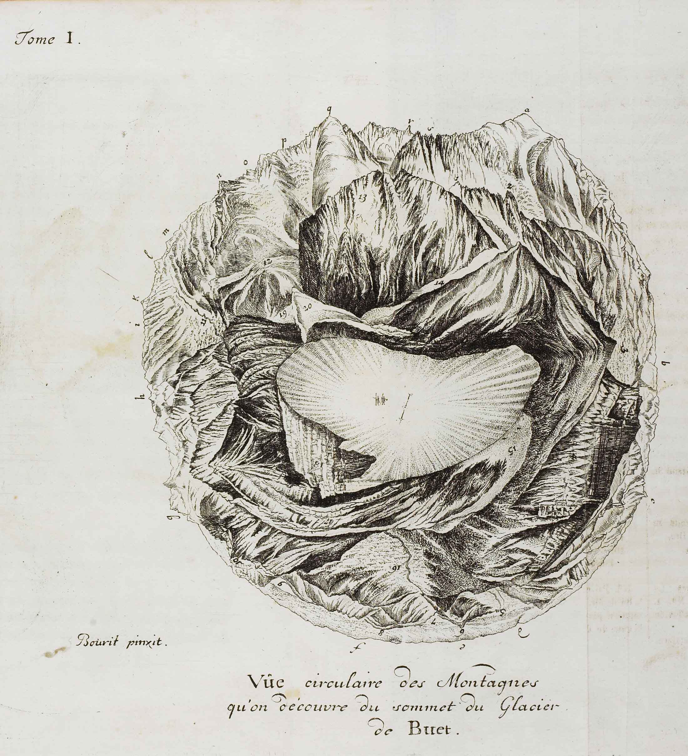 Cependant les Alpes ne regorgent pas uniquement de terres sauvages. Des espaces domestiqués sont déboisés et entretenus, accueillant un habitat rude, des prairies où paisse le bétail. Les nombreuses expéditions scientifiques organisées dans les Alpes à partir de 1750 ont rendu la montagne accessible, offrant de nouvelles perspectives aux artistes. Elle est vue et montrée depuis son sommet suivant une double volonté artistique et scientifique. Illustrant l’ouvrage « Voyages dans les Alpes » publié en 1779 par le scientifique Horace-Bénédict de Saussure, une vue circulaire des sommets autour du Mont-Buet réalisée par Marc-Théodore Bourrit inspirera de très nombreux panoramas de montagne tout au long du XIXème siècle.