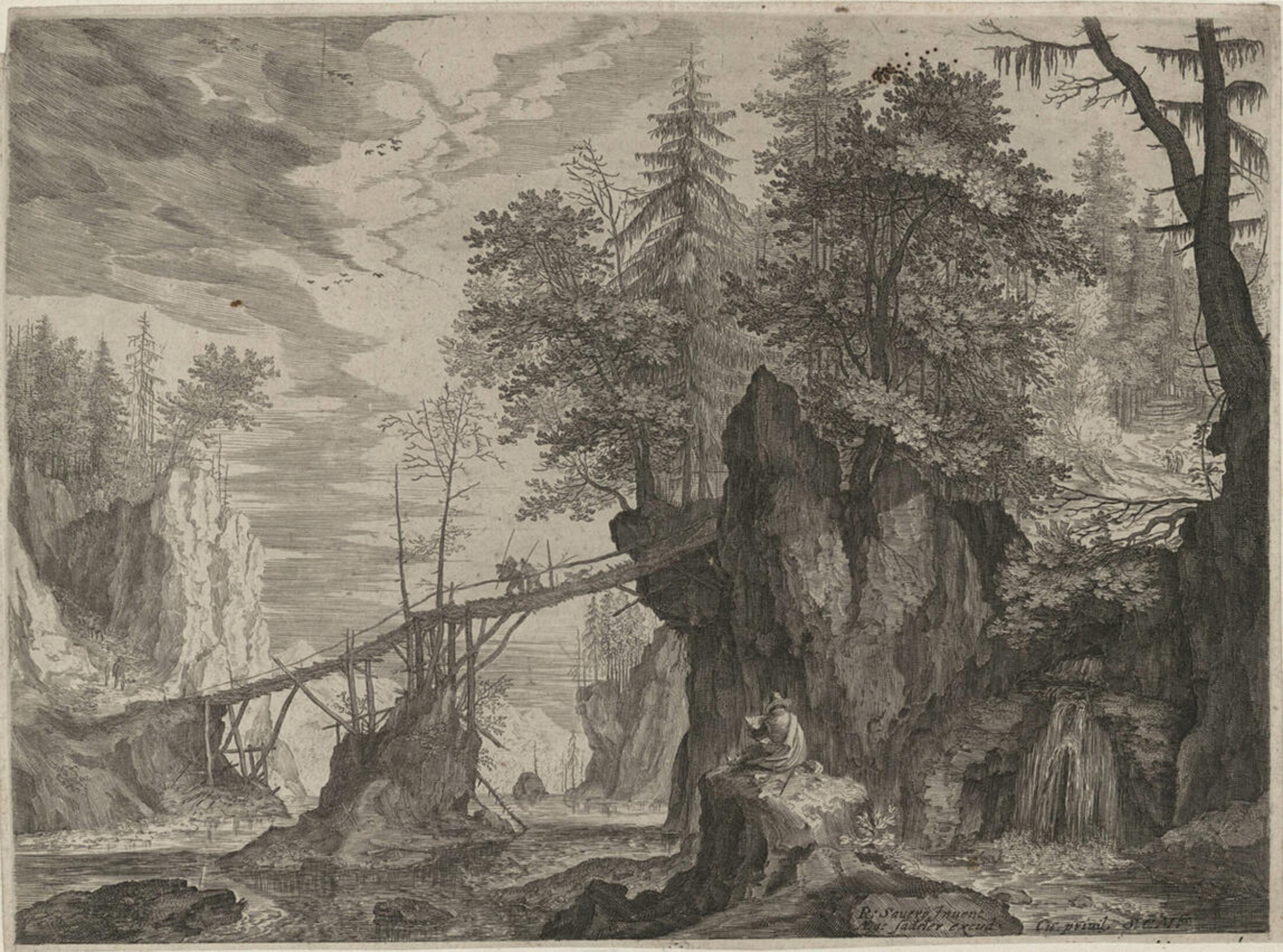 En guise d’introduction, ce sont les peintres de la montagne qui accueillent eux-mêmes les visiteurs à travers un petit ensemble de portraits et autoportraits. D’emblée, ils occupent le centre de l’exposition. Il n’est pas si facile de peindre la montagne. Au lourd et encombrant matériel qui augmente les efforts physiques d’une ascension éprouvante répond l’incertitude des conditions météorologiques qui oblige à patienter parfois plusieurs heures avant de saisir la lumière d’altitude parfaite. Au XIXème siècle, la pratique se fait en plein air avant la reprise à l’atelier. Deux gravures viennent ici rappeler l’invention du genre pictural. Le « Paysage alpestre traversé d’une vallée profonde » (après 1555) de Pieter Bruegel l’Ancien (1525-1569) illustre la traversée des Alpes que l’artiste entreprend lors de son voyage vers l’Italie entre 1552 et 1554. Dans son livre des peintres publié en 1604, Carel Van Mander écrit que Brueghel « nous apprend, comme dans les Alpes rocheuses et pointues, à représenter des vues plongeantes sur des gouffres vertigineux, des falaises escarpées, et des Pins dans les nuages, des perspectives lointaines et des ruisseaux murmurants[3] ». Le seconde, exécutée vers 1600 et intitulée « Dessinateur sur une pierre devant un pont », montre son auteur, Roelant Savery (1576-1639), de dos, dessinant dans la nature alpine tyrolienne.