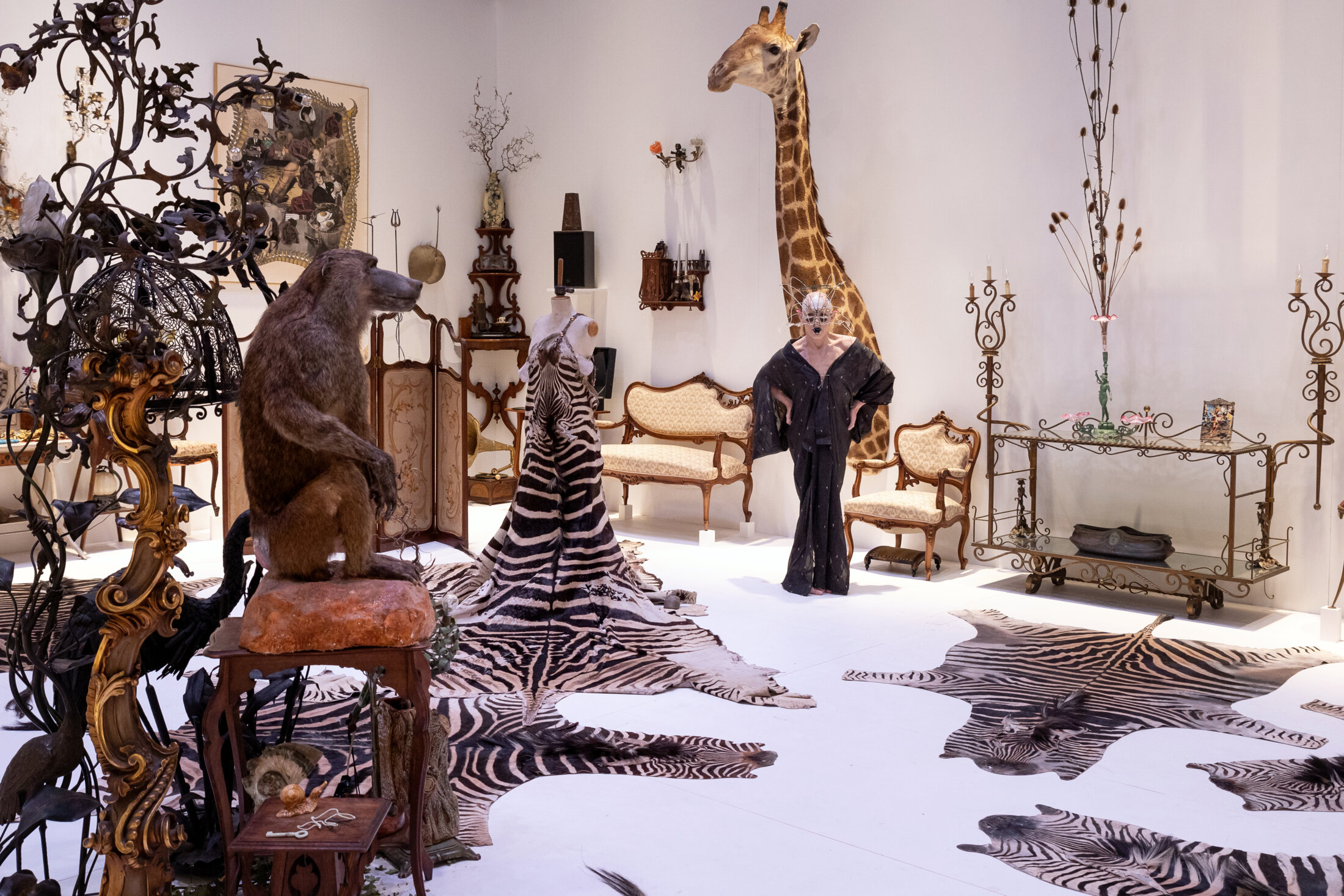 Le boudoir est une façon pour Steven Cohen de se tenir au plus près du public. Il l’expérimente pour la première fois dans l’espace du théâtre. Les objets exposés dénotent une omniprésence des signes de la violence et des guerres au XXèmesiècle, du vivant à travers les animaux empaillés, de la religion et de l’histoire de la colonisation. Quatre non-dits qui composent les bases de la société occidentale actuelle. « À travers ces objets, que l’assemblage rend hybrides, queer à leur tour, se reflètent des préoccupations éthiques liées à la vie contemporaine : l’épuisement des ressources naturelles et la fragilité des équilibres vivants, la domination des espèces, les questions de classe et l’injustice sociale, la suprématie blanche et la discrimination raciale, la persécution religieuse, la discrimination de genre, la domination cis et la masculinité toxique pleine de bravade mais qui rétrécit comme le plastique près d’une flamme[5] » précise-t-il. Le boudoir n’est autre que l’intériorité quotidienne de l’artiste, son espace mental, ce qu’il se refuse d’oublier et ce sur quoi nous sommes assis. Que sont les animaux naturalisés si non des objets pour se séduire soi-même ? À ce titre, deux culs de babouin font office de trophées inversés.