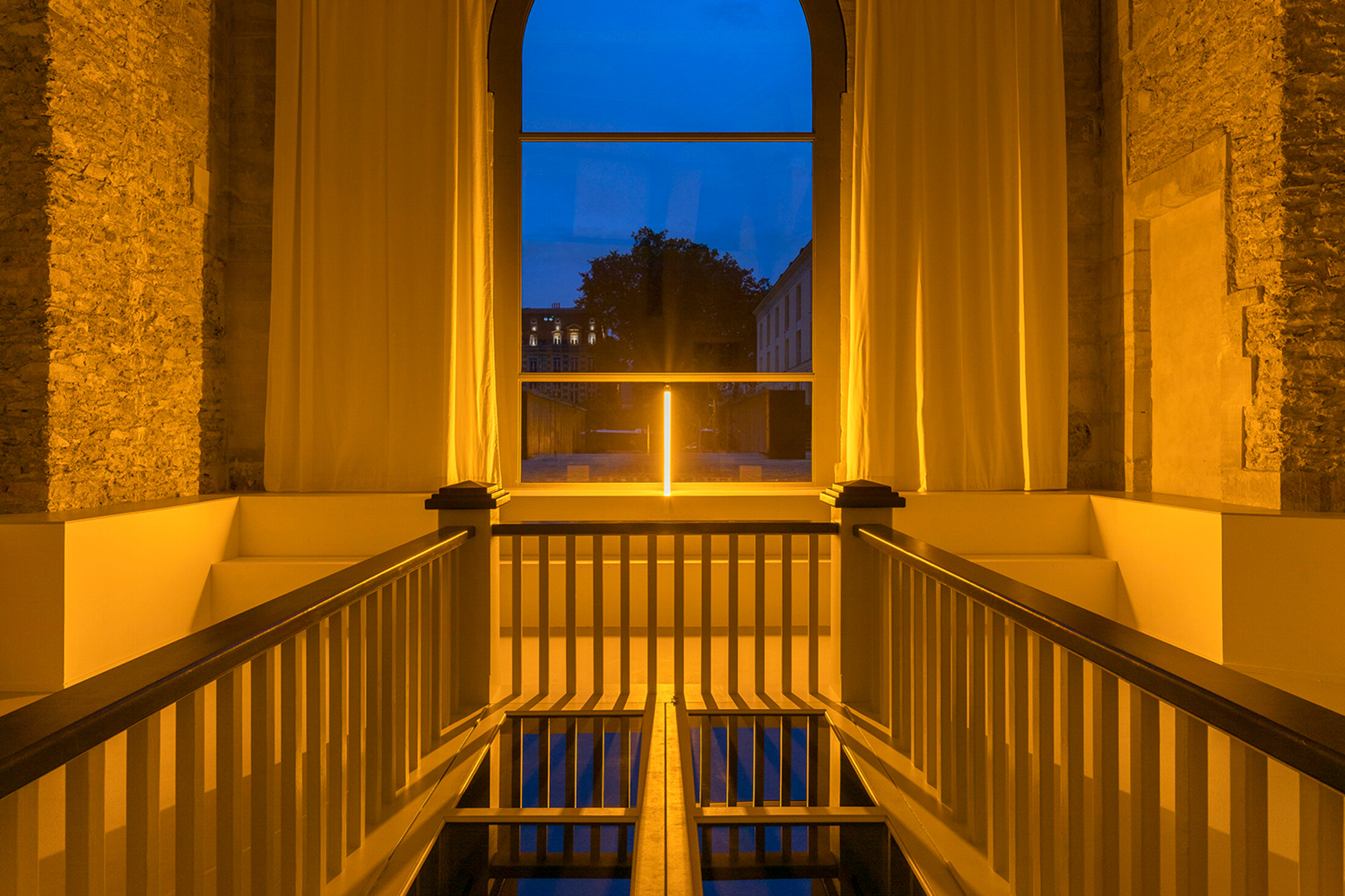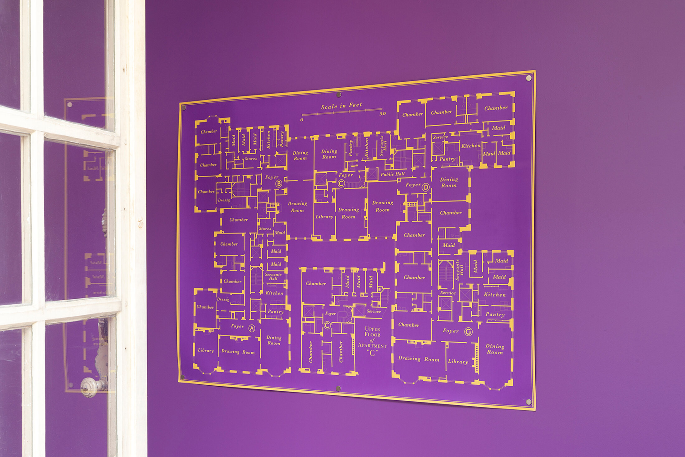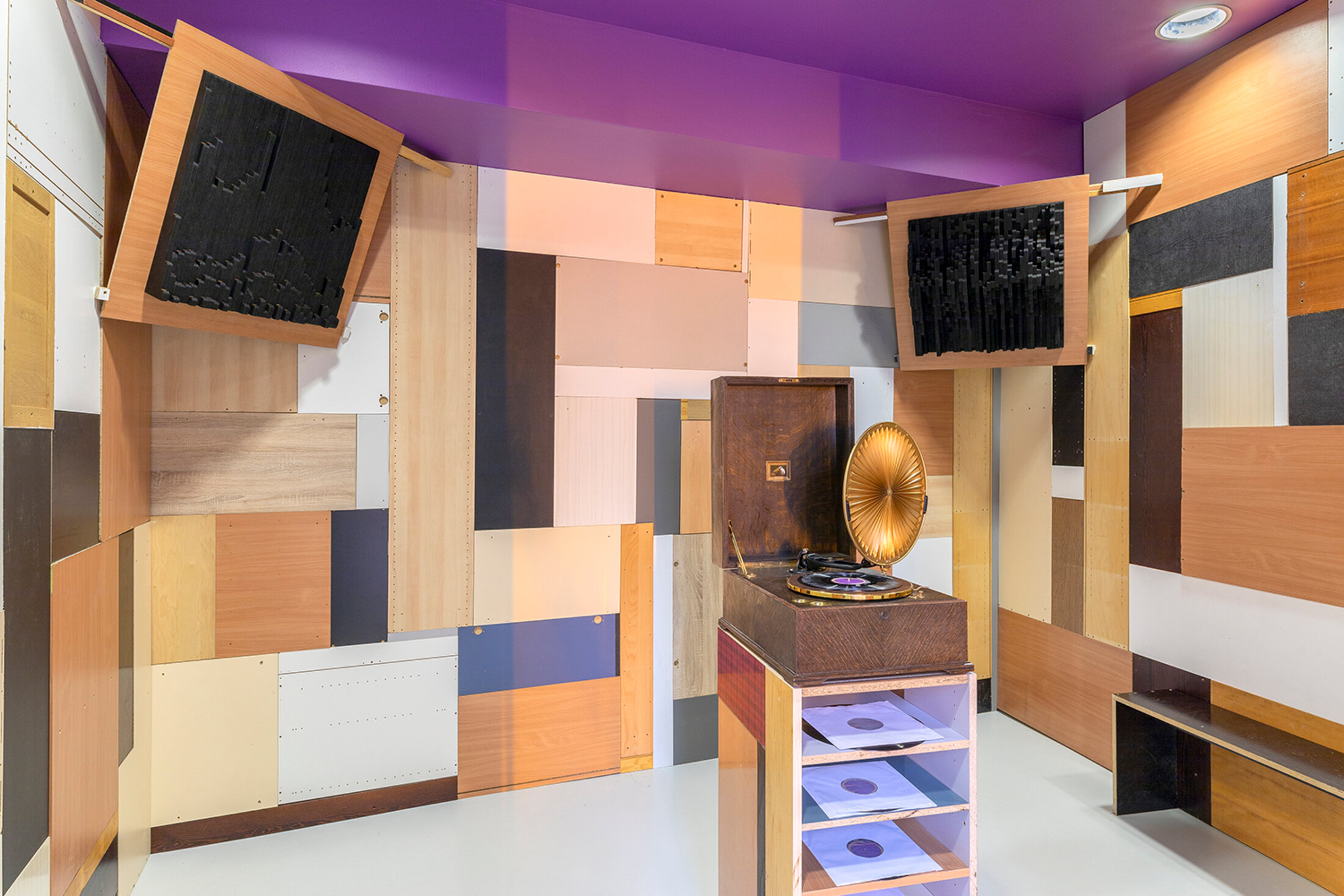 Afin de restituer cette atmosphère immersive particulière, ce caractère étrange et quelque peu inquiétant du lieu, Jérôme Poret utilise des lampes à sodium basse pression, émettant une lumière monochromatique jaune orangée, très présente dans les pays de l'est de l'Europe – Jérôme Poret a longtemps vécu à Berlin. Ces lampes, vouées à la disparition à très court terme, retirées de la commercialisation, remplacées par la LED, ajoutent à l'irréel paysage mordoré qu'elles inventent une certaine nostalgie, celle d'un monde que l'on quitte, inexorablement, un monde qui n'a pas tout à fait disparu mais dont on sait pourtant qu'il ne reviendra plus. Au fur et à mesure que les heures avancent, la lumière se modifie, passant du jaune-orangé à une lumière qui devient peu à peu noire et jaune. C'est une lumière d'appel, de celles qui soulignent les choses, les dévoilent, autorisant l'ouverture du centre d'art vers l'extérieur, au-delà de ses imposants murs qui lui donnent son statut si solennel. Sur l'un d'entre eux figure un immense plan de la Winchester House dont on ignore à quel l'étage il correspond, ni même à quelle date il a été relevé. Sans doute que la réappropriation du mythe, pour être tout à fait effective, doit d'abord passer par sa déconstruction, son abstraction. La salle attenante est transformée en "whisper room", un studio d'enregistrement dont l'isolation est réalisée entièrement avec des restes mobiliers de placards récupérés. L'artiste utilise volontairement un matériau doté d’une vie antérieure, choisit de créer un capitonnage qui contient déjà des récits préexistants. Ceux racontés plus tôt sous hypnose sont gravés sur des disques en PVC (le support plus dur en permet la lecture par l'aiguille du gramophone) ; les voix disparaissent un peu plus à chaque fois qu'on les écoute. Si les six exemplaires 78 tours sont suffisamment durs pour permettre l'écoute, ils sont aussi raisonnablement souples pour que l'aiguille, tout en lisant les sillons, les endommage inéluctablement, effaçant doucement les récits qui y sont inscrits. Sur les gramophones, le son provient du diaphragme en papier d'où il est émis, pas encore par amplification, il n'y a pas d'électricité. L'objet même, une fois déployé, fait écho à la table parlante utilisée par les adeptes du spiritisme pour entrer en contact avec les esprits. Aux six récits des six personnes différentes (trois garçons et trois filles) répondent trois sculptures formant les abat-sons (composés d'un vide d'air et un isolant). En les diffractant, ils font office de pièges à son, dans un parallèle saisissant avec la Winchester House qui servait, en les attirants par son hospitalité, de piège à fantômes. Les formes sculpturales des abat-sons reprennent le dessin des voix des récitants (amplitude, fréquence et hauteur), matérialisant leurs fréquences vocales en 3D. Non loin, un petit cabinet de curiosité enchâssé dans le coffre d'un ancien phonographe Edison de 1914, devenu pour l'occasion écrin à reliques, renferme l'empreinte de l'intérieur des oreilles de Jérôme Poret. Plonger les esprits dans de la paraffine pour en faire des moulages, l'échelle est très troublante, se situant quelque part entre une petite personne et un enfant.