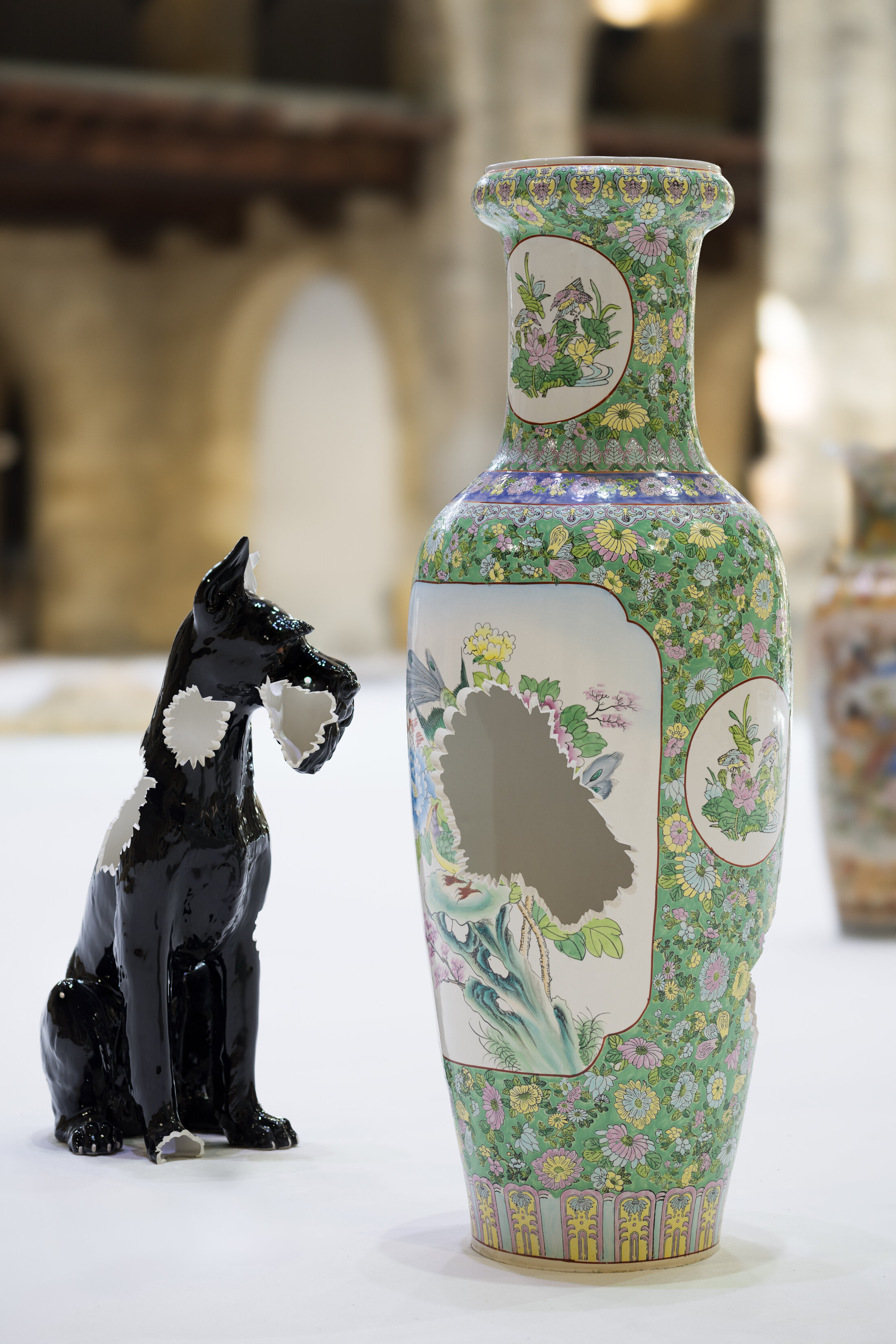 « Green » (2013) montre l’absurdité de serviettes de bain glanées dans le commerce et représentant des billets de banques, surnommés « Greens » aux États-Unis. Produites en quantité industrielles dans toutes les devises du monde, elles témoignent du mercantilisme d’une société où l’argent est roi et le touriste, l’incarnation de cette marchandisation globale. Nina Beier ramène les objets à leur statut d’image en positionnant leur valeur marchande à même la surface. En juxtaposant des feuilles de palmier sur les serviettes-billets, leur faisant emprunter le trajet inverse que celui entrepris par les touristes, en les pressant, les aplatissant, en les dévitalisant, elle les réduit à leur propre image, vague souvenir du colonialisme dans un monde aujourd’hui globalisé. Le dialogue muet entre un chien et un vase orchestré par l’artiste dans la série « China » (2015) vient confirmer son appétence pour les assemblages de prime abord absurdes. Ils ont toutefois en commun d’être en porcelaine, peints à la main – le premier en Italie, le second en Chine –, mais aussi d’être troués comme s’il avaient été attaqués, ou qu’ils souffraient de la même maladie. Oiseaux et plantes luxuriantes, symboles d’une Chine opulente fantasmée, décorent le vase, tandis que le chien, objet hyperréaliste purement décoratif et image du meilleur ami de l’homme, est la réplique domestiquée de races vendues comme chien de garde. Leurs blessures les placent sur un pied d’égalité. L’un comme l’autre n’existent que par l’image qu’ils nous renvoient.