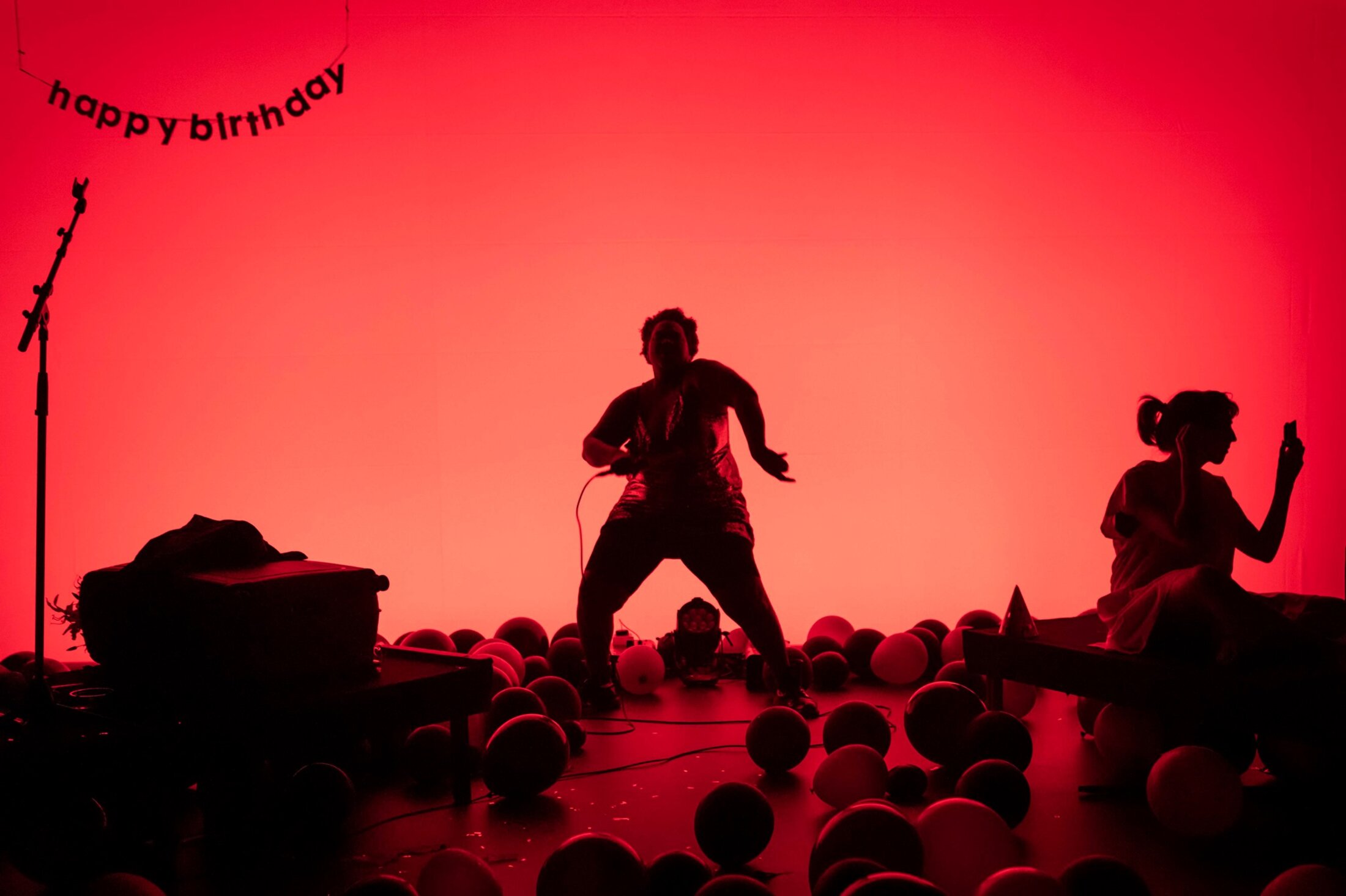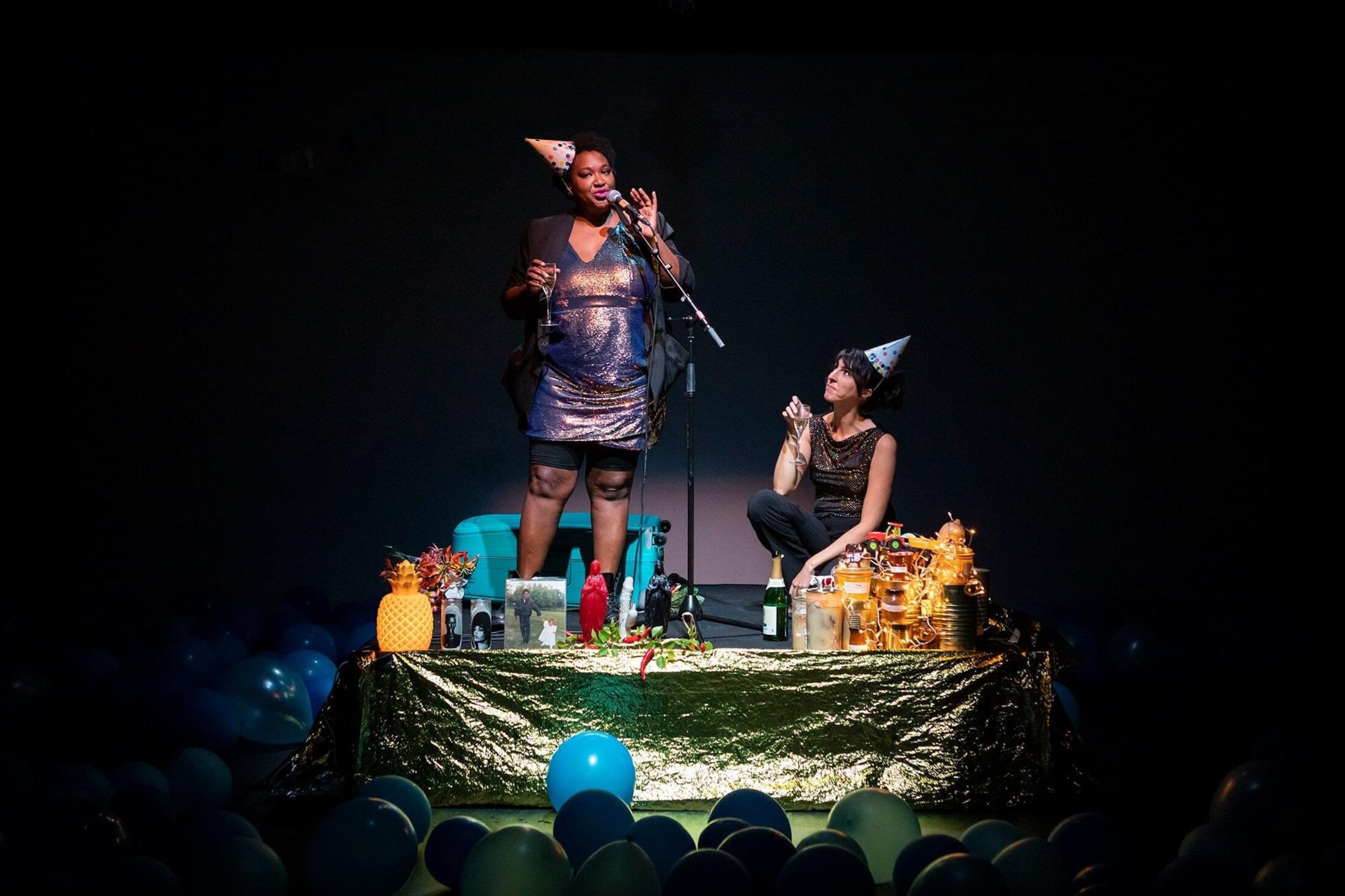 Anne et Rebecca accueillent elles-mêmes les spectateurs dès leur entrée dans la salle. L'ambiance se veut festive. Elles ont décoré le plateau en conséquence : des ballons bleus jonchent le sol, des bouteilles sont sorties, une guirlande « Happy birthday » aux lettres évidées est accrochée au plafond dans un coin. Elles ont même prévu des projections vidéo, des animations créées à partir d'un logiciel informatique très « nineties ». Sur une platine, un disque vinyle de Daniel Balavoine laisse échapper les premières notes de « L'Aziza ». Les deux artistes, qui sont nées le même jour – pas de la même année précise aussitôt Rebecca –, célèbrent pour la première fois leur anniversaire ensemble. Elles se sont rencontrées il y a quinze ans alors qu'elles entamaient leur carrière dans la même compagnie, sillonnant la France de théâtres en MJC, d'écoles en salles communales, enchainant les représentations au point d'en dépasser le nombre de celles jouées par la Comédie-Française apprend-t-on, c'est dire ! Si elles ont prévu suffisamment de bouteilles pour tous, le public en sera privé, la faute au coronavirus. Elles boiront donc seules sur scène. Gâteaux, bougies, chapeaux pointus, complètent la panoplie. Rebecca se lance dans un « blind test » musical avec les spectateurs. Cependant, les rires trop forts, les échanges trop euphoriques, les corps trop tendus, expriment une frustration, une angoisse, parlent d'une absence, de leur absence. En 2017, il n’y a pas eu de photo d'anniversaire. L'une et l'autre ont été arrachées à leur présent. « Le jour de notre anniversaire, chacune à notre manière, on est sorties du cadre, on s’est éjectées de la photo » annoncent-elles dans la note d’intention du spectacle.