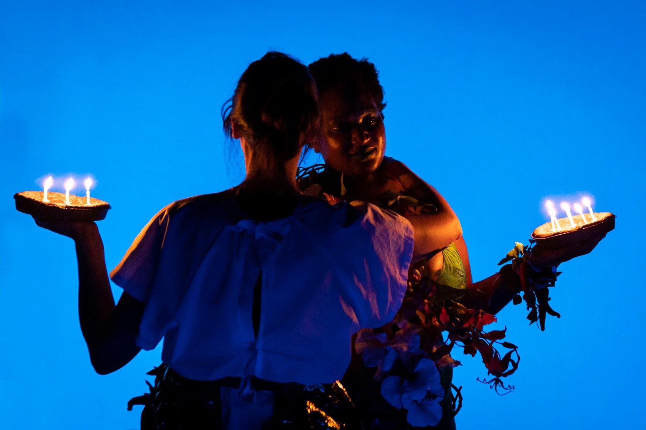 Cela faisait plusieurs années qu’Anne Contensou et Rebecca Chaillon avaient un désir de spectacle commun. Elles se connaissent depuis longtemps, se sont vues grandir comme le montrent un ensemble de photos et vidéos dans lequel elles apparaissent partageant la même scène alors qu’elles semblent à peine sorties de l’adolescence. Parmi celles-ci, une séquence vidéo donne à voir une scène extraite de « l’Odyssée » dans laquelle Rebecca Chaillon incarne Ulysse avec fougue. La question de l’exil intime devient l’axe central de leur projet. Il est abordé sous la forme d’un long voyage introspectif, une odyssée mentale qui reprend le modèle homérique, faisant de chacun des récits, vicissitudes de leurs vies respectives, l’une des stations qui jalonnent la route du retour à Ithaque. Sur scène, deux plateformes, pareilles à des ilots, assurent la fonction d’autels, de stèles, abritant des objets issus de leurs histoires personnelles. Si chaque odyssée de ces Ulysse au féminin est unique en fonction du trajet et du caractère de chacune, elles portent en elles la même interrogation : Qu’elle est ma place en tant que femme dans le monde d’aujourd’hui ? Et par extension : Quelles sont les attentes de la société à mon égard ? Quelles sont mes propres attentes ? « Elle/Ulysse » aborde de manière centrale l’émancipation féminine et la question des interdits. Certes, le spectacle est perfectible. Les histoires gagneraient à se croiser un peu plus, à faire récit commun par infiltration, à sortir de l’anecdote pour traduire l’intensité qui émane de ce moment où on est au bout de ses limites. Mais, au terme d’une bouleversante soirée d’anniversaire, il subsiste tout de même cette double mise à nu courageuse. Convoquer les affres de nos vies, prendre conscience de notre mortalité comme un enrichissement, permet de rester parmi les vivants. A défaut d’épopée, le spectacle invite le public à revisiter les moments qui composent sa propre histoire. Si l’on doute rapidement de la fête, c’est parce que les corps ne mentent pas. On est ému au refrain de « Stand by me » de B. B. King, même lorsque, joué au synthétiseur, il se teinte d’une sonorité de karaoké japonais. On pleure sur « Tout doucement » de Bibi comme on n’a jamais pleuré auparavant. Les aléas de la vie sont inhérents à tous. Nous tombons mais nous nous relevons. Au son du boléro qui rythme la chanson « Et maintenant » de Gilbert Bécaud, Anne frappe la terre d’un pied. A l’aide d’une couverture de survie et un fichu en guise de coiffe, elle s’est fabriqué un costume folklorique que l’on imagine traditionnel de l’Aveyron. Les gestes ramènent à la terre, au sol. Rebecca en bikini, valise à la main, bientôt se couvrira de fleurs au risque de la métamorphose. Il ne s’agit pas de n’importe quelles fleurs mais de celles que l’on trouve en abondance sur son ile caribéenne. Comme Ulysse sur son bateau, être mis à l’épreuve de l’absence, faire l’expérience de l’errance jusqu’à explorer ses propres limites, les limites du réel, pour enfin retourner à Ithaque.