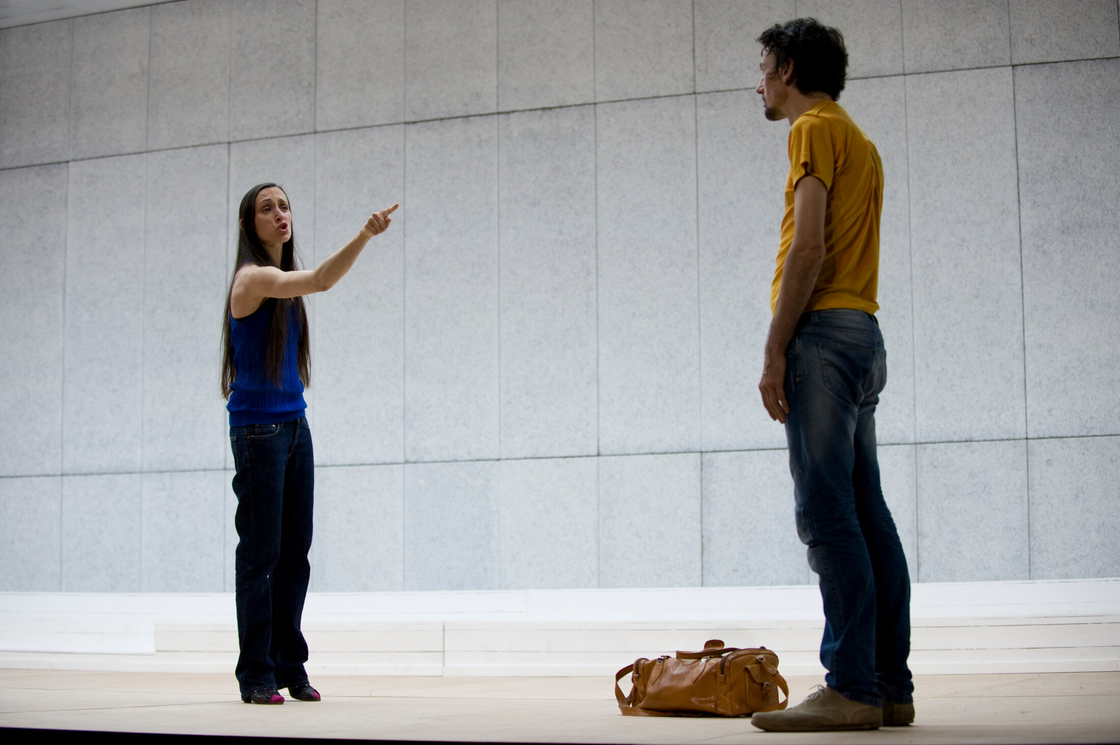 Le plateau est entièrement nu. Ils entrent, d’un pas rapide, comme pressé, surtout lui. Il commence à parler : « Je voulais te voir pour te dire que ça s’arrête, ça va pas continuer, on va pas continuer[1] ». Sans sommation aucune, il attaque, déverse maintenant sa logorrhée âpre vers elle, face au public. Tout ce qui était resté enfoui depuis tant d’années semble désormais sortir tel un torrent de boue qui, c’est évident, va tout dévaster sur son passage. Elle se tait, l’écoute, vacille quelquefois mais reste debout. Plus il vocifère, plus il se fait véhément, plus il apparait peu assuré, maladroit. Il a besoin des mots pour se donner de l’assurance, trouver la force de rompre. Il lui faudra élaborer un labyrinthe de digressions pour y parvenir. Il affirme tout de même, balance, fait mal comme pour se donner du courage : « je n’ai plus de désir pour toi, je ne peux pas le dire autrement, je te regarde et je n’ai plus de désir ». Les mots sont maintenant des armes douloureuses. « Ce sont des couteaux[2] » écrit Pascal Rambert dans sa note d’intention. Il scrute leurs effets sur le corps d’Audrey, continue : « je vais dire quelque chose d’horrible Audrey mais ta poitrine et ton regard n’allument plus rien en moi, plus rien ». Détruire dit-il. C’est la fin de son désir qui déclenche la guerre, une guerre totale qui va défaire leur monde, celui qu’ils avaient construit ensemble, le sien à elle autant que le sien à lui. On imagine le vertige qui la saisit au moment où elle entend ces mots durs, pénibles, sortir de sa bouche, celle de l’amant, l’ami, l’aimé, l’infaillible. Il ne le sait pas encore mais sa violente diatribe entraîne un cataclysme qu’il va bientôt subir. Dans un instant, comme dans une tragédie antique, le destin se retournera contre lui.