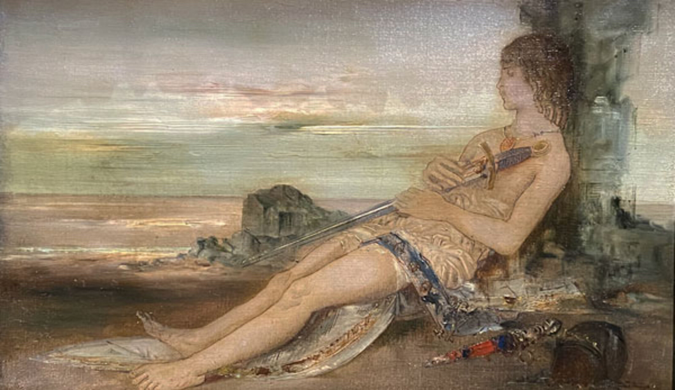 Moreau reste à Paris pendant la guerre franco-prussienne de 1870 puis lors de la Commune de Paris. Les évènements l’affectent au point d’envisager un grand polyptyque mi-peint mi-sculpté et de style médiéval, pour le Salon de 1872. Intitulé « La France vaincue » ce projet restera à l’état d’ébauche mais, séduit par le format du polyptyque, il va réaliser plusieurs dessins dans cette esthétique renaissance. Après les combats de 1870, des figures guerrières issues de la grammaire médiévale font irruption dans l’œuvre de Gustave Moreau, à l’image du croisé chrétien à la conquête de la Terre Sainte, qu’illustre dans l’exposition la « Mort d’un jeune croisé » (1871). Ce tableau de petite dimension représente un jeune homme appuyé contre un arbre, les yeux clos, son épée entre ses bras. Les quelques accessoires médiévaux discrets permettant de l’identifier sont inspirés d’illustrations de l’ouvrage de Nicolas Xavier Willemin[4], lui conférant une certaine vérité historique. Il s’empare aussi de la figure de Jeanne d’Arc qui connait un regain d’intérêt au cours du XIXème siècle. Hérauts, chasseur au faucon, amour courtois, Moreau s’intéresse également aux thèmes chevaleresques dont la traduction en peinture est caractérisée par l’ambiguïté et l’entremêlement des sources et des époques propres à l’esthétique du peintre, à l’image de « La mort offre des couronnes au vainqueur du tournoi », toile dans laquelle se mêlent les arts orientaux et occidentaux, antiques, médiévaux et renaissants.