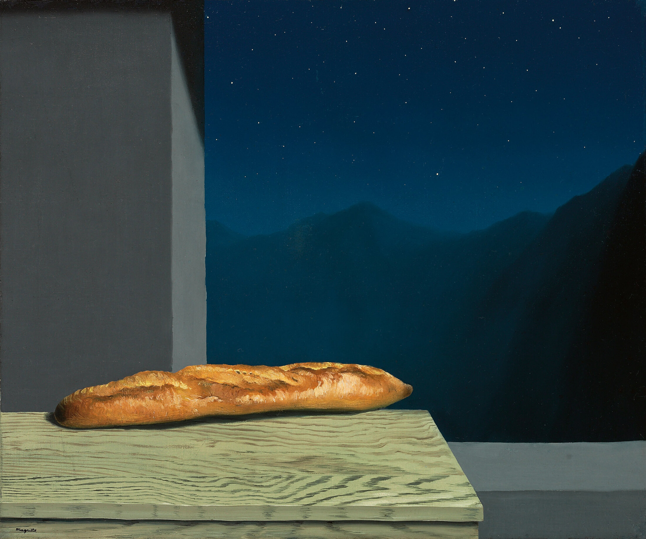« Ceci n’est pas une pipe (La Trahison des images) », avec ses jeux de mots et d’images, incarne la quête inlassable et parfois conflictuelle de Magritte, l’essence même de son art : une trahison des apparences, un refus de la représentation littérale. Si le célèbre tableau est absent de l’exposition anversoise, il est évoqué à travers la présence de « La trahison des images » (1952), sous-titré « Ceci continue de ne pas être une pipe », reprise tardive et humoristique du motif iconique de 1929. Magritte dessine une pipe accompagnée de l’inscription « Ceci continue de ne pas être une pipe », insistant avec ironie sur le fait que l’image n’est toujours pas l’objet réel. Cette œuvre souligne le paradoxe persistant entre représentation et réalité, jouant sur la continuité de l’énigme visuelle. « L’Avenir » (1936) est l’un des tableaux les plus énigmatiques et les plus poétiques de la période dite « pré-guerre » de Magritte, une œuvre qui, comme souvent chez lui, joue sur l’euphémisme pour faire surgir le vertige. Elle appartient à une série de compositions minimalistes dans laquelle l’artiste semble tester les limites du mystère avec le moins d’éléments possible. Le titre est chargé d’ironie subtile. L’avenir serait-il cette baguette immobile face à l’éternité nocturne ? Ou bien le pain, humble et terrestre, est-il la seule chose tangible qui nous reste quand nous regardons vers demain ?