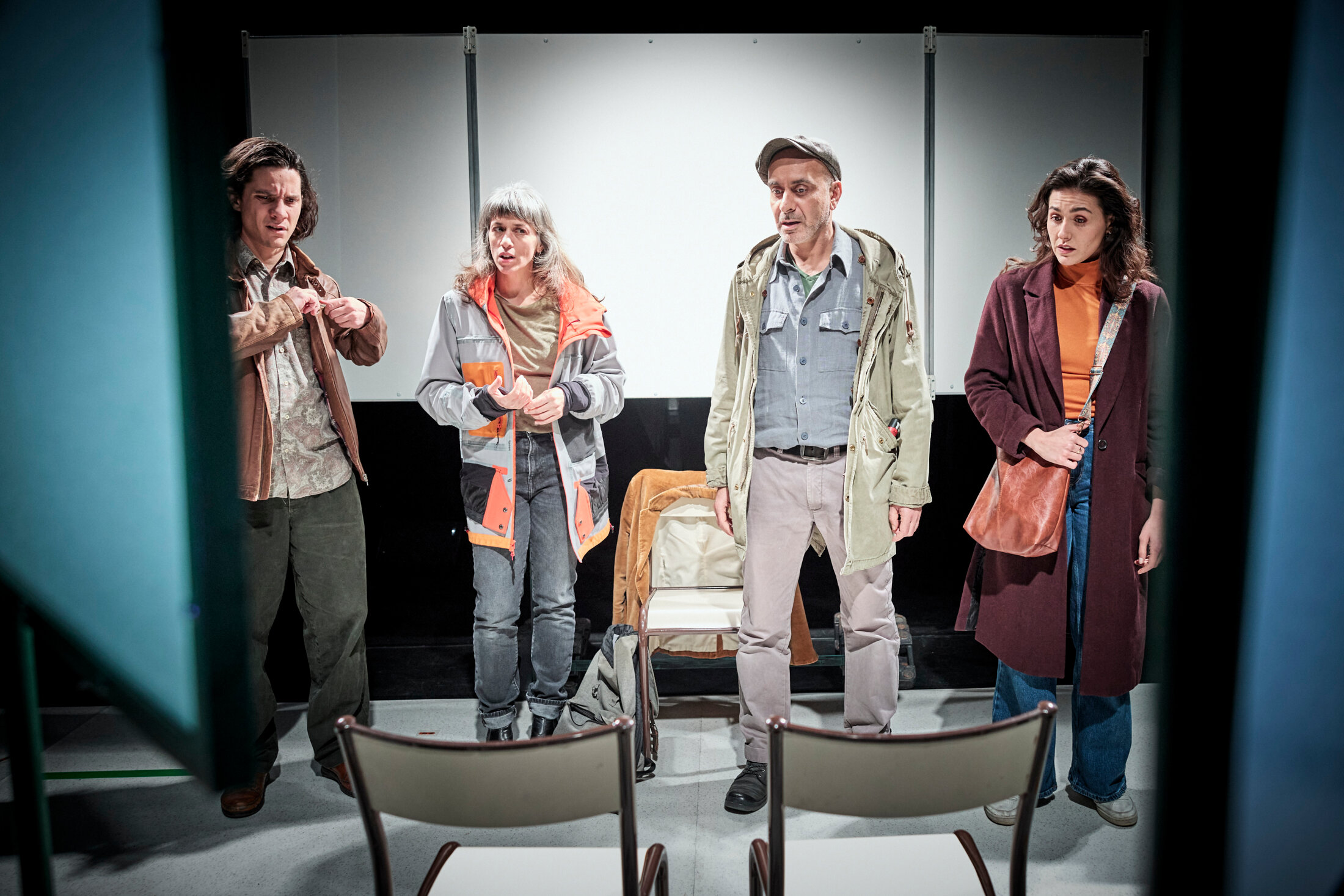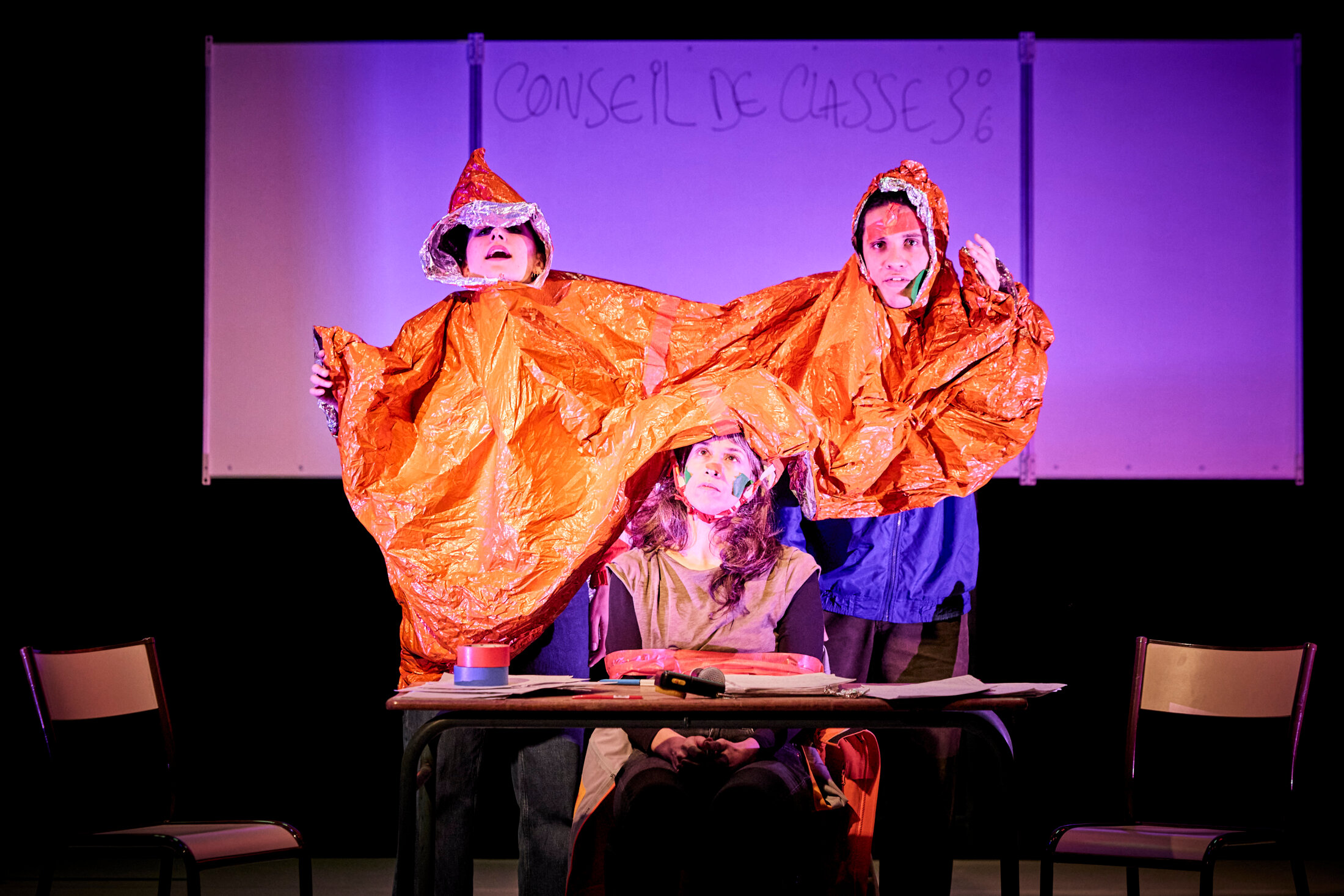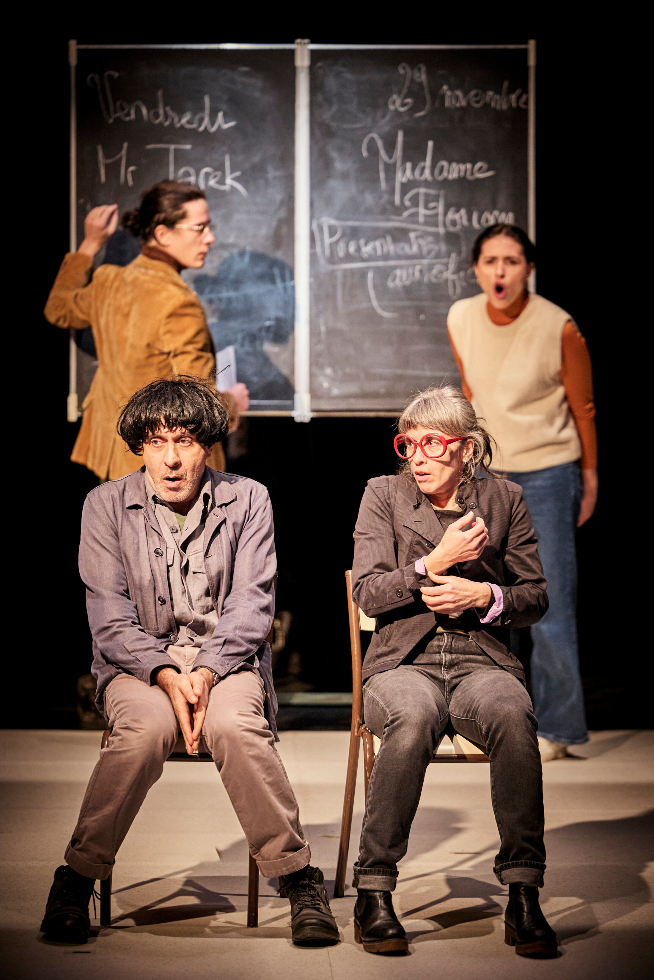 « NOTRE ÉCOLE (TRAGI-COMÉDIE) » - Conception, dramaturgie, mise en scène : Jana Klein & Stéphane Schoukroun. Écriture Jana Klein. Avec Baptiste Febvre, Pierre Fruchard, Ada Harb, Jana Klein, Stéphane Schoukroun et Wilfrid Roche. Assistanat mise en scène Elie Vince Regard dramaturgique Marion Boudier. Conception lumière et vidéo Loris Gemignani Scénographie Margaux Folléa. Création musicale et sonore Pierre Fruchard. Création vidéo Frédérique Ribis. Création costumes Séverine Thiébault. Réalisation coiffes Séverine Thiébault & Solène Truong. Construction décor Yohan Chemmoul & Jeanne Roujon. Conception graphique Lucie Jean. Régie son Paul Buche. Régie plateau, conception accessoires Wilfrid Roche. Régie générale Maëlle Payonne / Wilfrid Roche. Production Compagnie (S)-Vrai. Coproduction Les Bords de Scènes - Grand-Orly Seine Bièvre, Lieu unique - Scène Nationale de Nantes, Théâtre André Malraux à Chevilly-Larue, Théâtre Romain Roland - Scène Conventionnée à Villejuif, Théâtre des Quartiers d’Ivry - CDN du Val- de-Marne, la Manekine, scène intermédiaire des Hauts-de-France, Centre culturel Houdremont - La Courneuve, CCAM - Scène Nationale de Vandoeuvre-lès-Nancy. Avec la complicité de la ville de Gonesse, L’atelier du Plateau, le théâtre Studio - Cie Christian Benedetti, le Théâtre Dunois, le Beffroi de Montrouge. Soutiens Ministère de la Culture - DRAC et Région Île-de-France, EPT Grand-Orly Seine Bièvre, Ville de Paris au titre de l’aide à la résidence. Spectacle créé le 15 novembre 2024 au théâtre Bords de Scènes Grand-Orly Seine Bièvre de Juvisy.