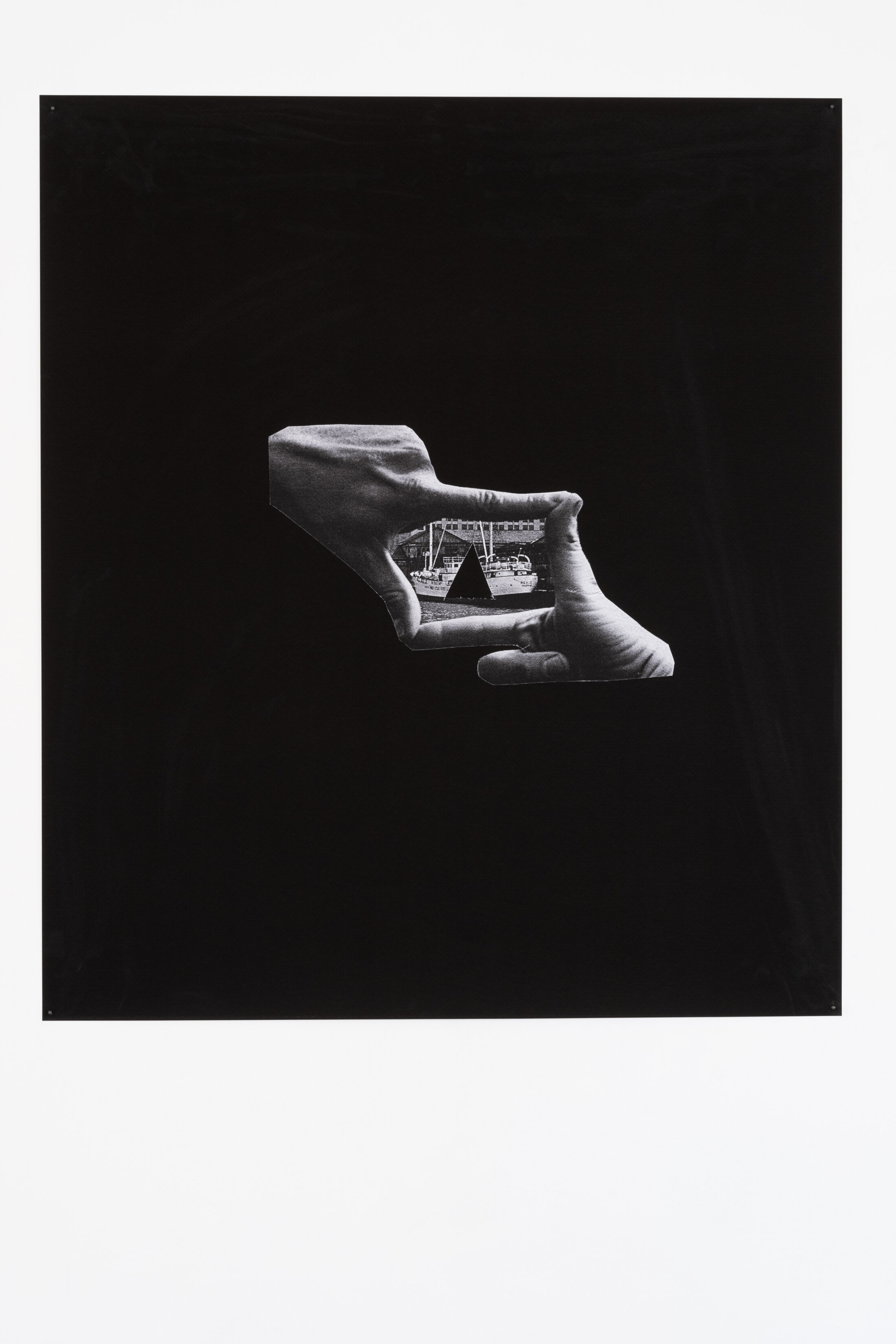 Marraine du projet, l’artiste Louisa Babari est née en 1969 à Moscou d’une mère russe et d’un père algérien, et a grandi entre Alger, Moscou et Paris. Son travail ne porte pas sur les camps. Le collage est ici envisagé comme une ouverture. Il est extraite de la série « Æsthetics of the Antrum » (2014) et donne à voir un bateau qui semble coupé en deux en son centre, comme éventré par collage d’un triangle noir, sorte de « triangle des Bermudes » imaginaire. Dans cette image étrange, onirique, à l’intemporalité lointaine, l’irréalité est accentuée par la représentation métaphorique du cadre d’une caméra que dessine la réunion du pouce et de l’index des deux mains. S’inscrivant à l’intérieur de ce cadre, le bateau fait encore le lien entre deux rives qui pourraient être ici celles de la Méditerranée, un pont entre l’ENSA de Bourges et l’ESBA d’Alger. L’image appartient au monde des rêves, au monde obscur de la nuit, le triangle incarnant le possible point de départ d’un voyage intérieur vers un imaginaire insoupçonné, une mémoire oubliée.