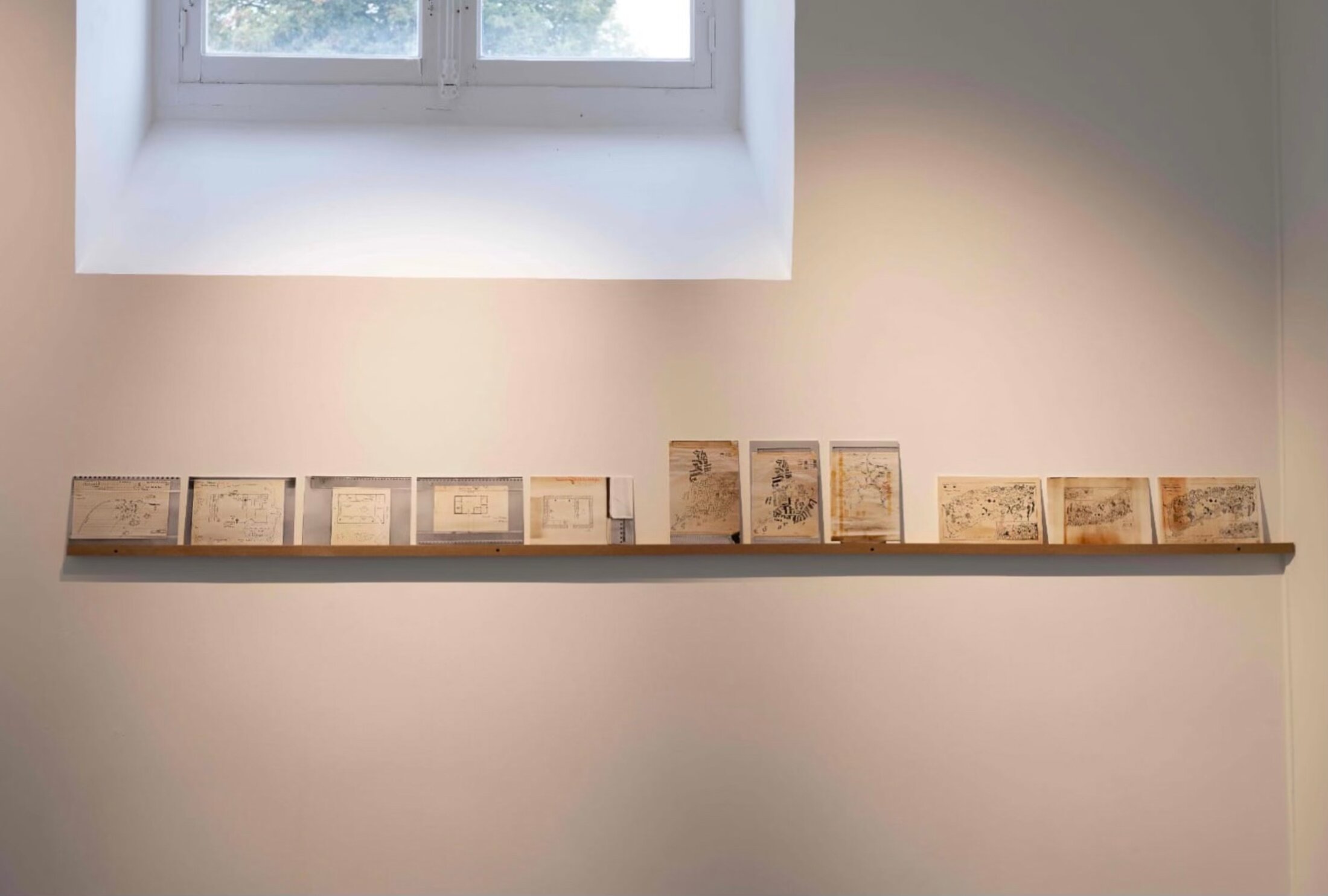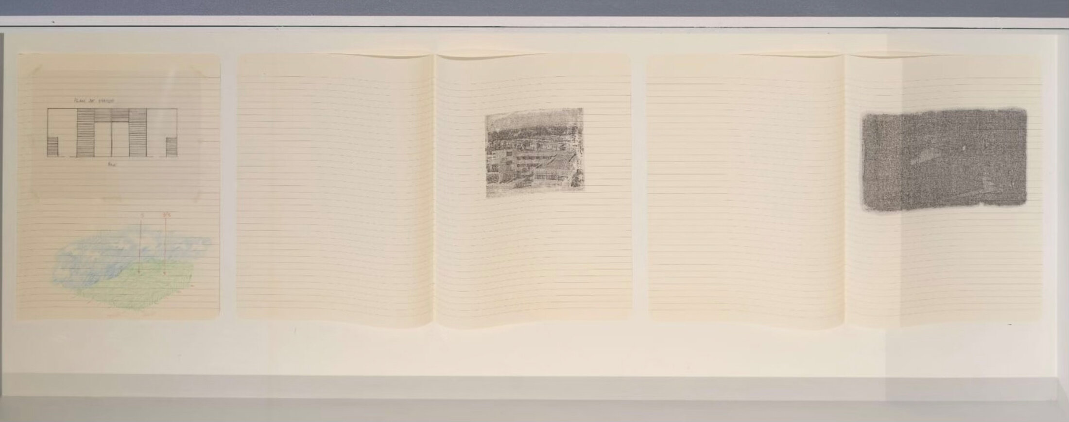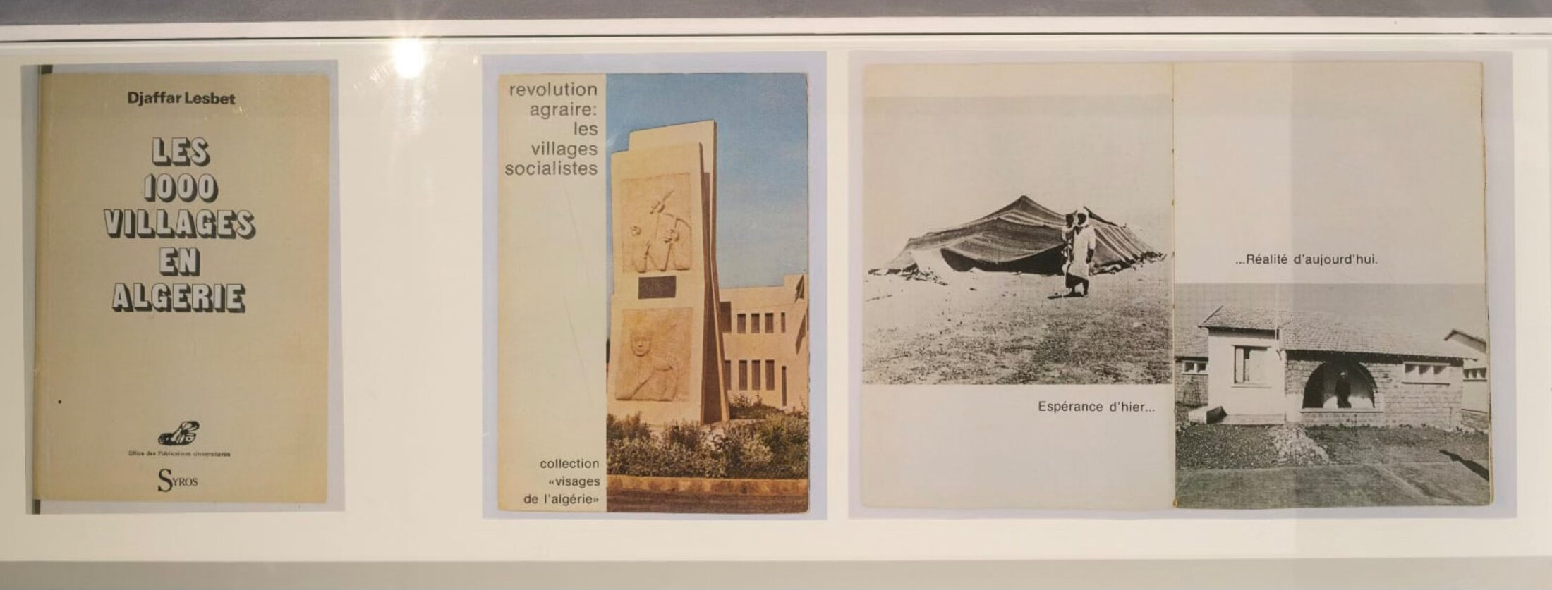 Massimissa Selmani (né à Alger en 1980, vit et travaille à Tours), dont le travail interroge la structure de l’histoire contemporaine, aborde les mille villages sur une autre strate. Dans les années soixante-dix, Boumédiène lance un gigantesque plan agraire déterminé cette fois par la construction de mille villages socialistes dont le but louable est de sortir de l'isolement et de la précarité la population rurale, de lui rendre ses terres spoliées pendant la colonisation, et de la mener vers une agriculture moderne. Les « Travaux préparatoires pour l’œuvre 1000 villages » (2015) de Selmani, dont six des vingt doubles pages de cahier avec impressions et dessins qui la composent sont présentés dans deux vitrines, trouvent leur origine dans une archive de coupures de presse autour de ce projet d’aménagement urbain initié par le gouvernement algérien sous l’égide de la « Révolution agraire ». Reproduites selon la technique du transfert, les images perdent de leur lisibilité à mesure que la série s’avance vers l’effondrement de cette utopie, jusqu’à devenir fantomatiques. La légende imprimée sur du papier calque devient alors la seule façon de pouvoir les lire à l’aune de leur contexte.