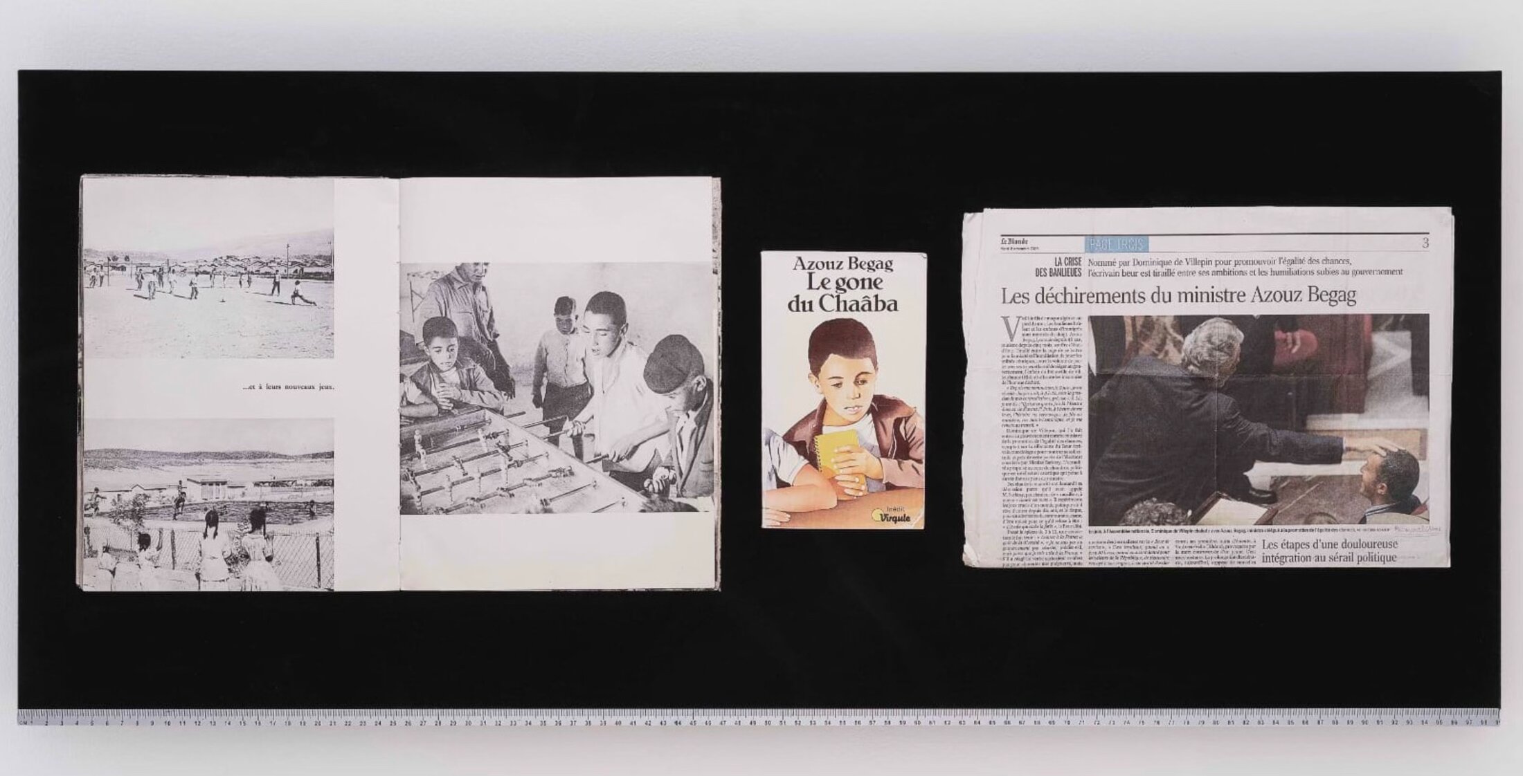 Fille d’ouvrier, l’artiste franco-algérienne Dalila Mahdjoub (née en 1969 à Montbéliard, vit et travaille à Marseille) se saisit de l’histoire des camps de regroupement en mêlant archives personnelles et institutionnelles ou médiatiques. Elle renouvelle ici une approche à la fois biographique, esthétique et historique, entre intime et politique. Dans « Ils ont fait de nous du cinéma » (2023), large panneau dont le titre reprend la formule employée par sa mère qui, se remémorant les prises de vue mises en scène destinées à la propagande, lui déclarait : « Ils ont fait de nous du cinéma pour les femmes de colonels », elle reprend formellement la constellation des mille villages à travers la structure du livre de propagande de l’armée française, superposant photographies d’archives et dessin vectoriel.
