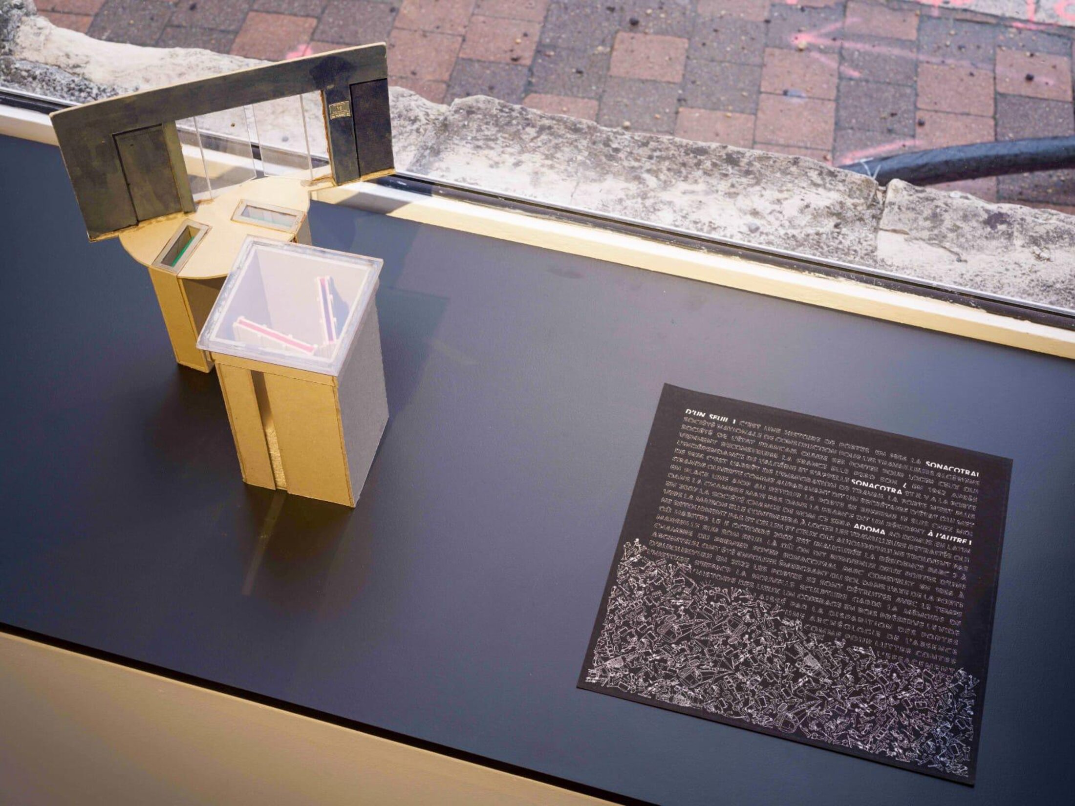 Très tôt, l’ARC imagine un système de vitrines qui sont autant de maquettes de camps. Elles prennent la forme de baraquements, puisant dans l’ouvrage de Samia Henni, « L’architecture de la contre-Révolution[7] », qui explore le rôle du bâti et de l’urbanisme dans le contrôle de la population et du territoire de l’Algérie. Entre 1954 et 1962, les autorités civiles et militaires ont profondément remodelé le territoire algérien afin de garantir le maintien de l’Algérie sous domination française. Les vitrines présentent des documents d’archive parmi lesquels des Archives militaires en provenance de l’Établissement de communication et de production audiovisuelle de la Défense (ECPAD) au Fort d’Ivry, des extraits de journaux de l’époque, mais aussi « Le Déracinement » (1964) de Pierre Bourdieu et Abdelmalek Sayad, observation statistique et ethnographique d’un des déplacements de populations rurales les plus durs et les plus massifs de l’histoire permettant de saisir, au moment même de leur destruction, les structures les plus fondamentales de l’économie et de la pensée paysannes.