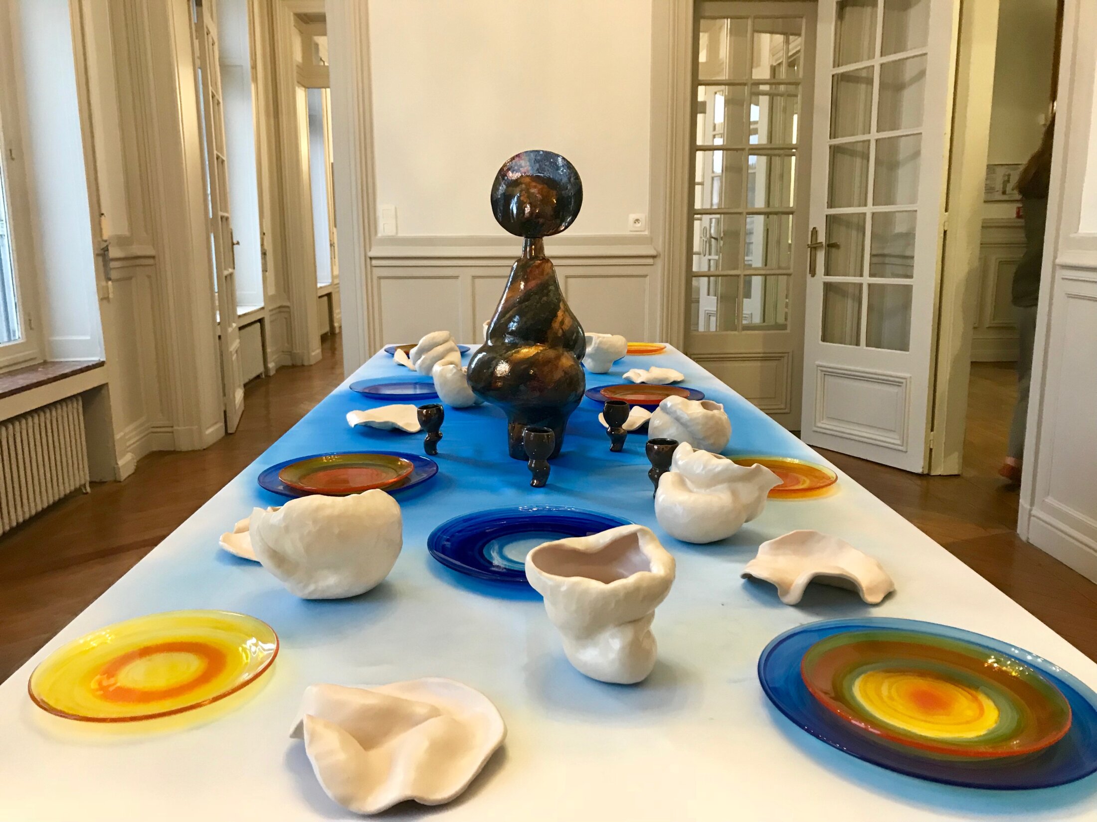 La salle attenante, ancienne salle à manger, abrite les souvenirs du repas organisé lors du montage de l’exposition, réunissant artistes, techniciens et personnel du centre d’art. Au milieu de la table, la Vénus ivre, sculpture en céramique, pièce maitresse du service imaginé par Sabrina Vitali, contenait un rhum parfumé au myrte. « L'éternité c'est la mer allée avec le soleil » emprunte à une citation de Rimbaud liée à l'extase pour mieux décrire l'exaltation et l'ivresse qui se sont emparées des convives, traduisant un vertige de chair, putatif péché de gourmandise. Plus loin, des bougies votives recouvrent de leur cire des masques de sommeil, bandeaux occultant la vue, entravant les yeux pour mieux faire le vide. Ces installations occupent les espaces méditatifs aménagés par l'artiste libanais Charbel-Joseph H. Boutros, dont les « sept orifices de l'exposition », sept sphères en béton, résidus d'une maison en ruine dans la montagne libanaise, sont dispersées de façon aléatoire dans l'exposition, en devenant ainsi le fil conducteur. L’une d’entre elles est cependant absente : déposée anonymement dans une exposition parisienne, elle prolonge en la contaminant l’odyssée bataillienne qui s’achève à Béthune.