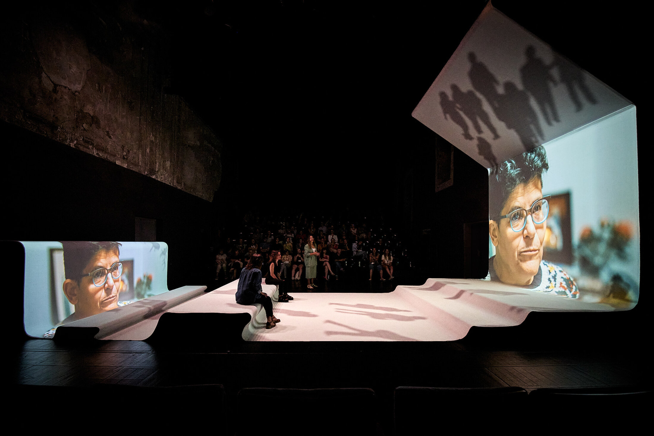 Les entretiens filmés apparaissent par bribes, soudain des mains se manifestent, des gestes, parfois des visages, jamais en continu. Ces fragments projetés ne sont pas là pour illustrer. Ils instaurent un autre regard sur la parole. Ce découpage filmé, ce montage, agit en écho au travail des comédiens qui la rendent vivante sur le plateau, le choix étant de respecter cette parole d’origine « au mot près », avec ses hésitations, ses ruptures, ses silences. Ce réalisme discursif est renforcé par la relative neutralité du jeu, évitant le pathos, laissant souvent la parole se suffire. Certains entretiens sont dans leur langue d’origine, en espagnol, en portugais, en italien. Sans avoir recours au surtitrage, ils sont traduits en direct par des interprètes remarquables, reproduisant la situation d’entretien avec la metteuse en scène. Si ce choix alourdit parfois le rythme, il ajoute une épaisseur. La parole est enracinée. Elle ne circule pas toujours facilement. Il y a des tensions de compréhension, de distance, et cela fait partie du propos. Le matériau est solide, convaincant : des entretiens vérifiés, des cas contrastés, une amplitude géographique qui permet de montrer non seulement ce qui divise, mais aussi ce qui rapproche, ce qui progresse ou recule selon les contextes. Ce théâtre documentaire n’est pas neutre. Il représente une contestation silencieuse mais réelle des ordres établis, aussi bien judiciaires que sociaux. Il interroge, critique. Et c’est dans ce trouble, dans ce lieu de discussion, que se tient toute sa valeur. La sobriété – dans les lumières, dans les costumes, dans le jeu – évite la grandiloquence, permettant aux témoignages de parler d’eux‑mêmes. Le spectateur est invité à écouter, à regarder, à ressentir l’inconfort, la lenteur, les zones d’ombre. Parfois la lenteur devient une force. Elle donne au public le temps de respirer, de rassembler ses pensées.