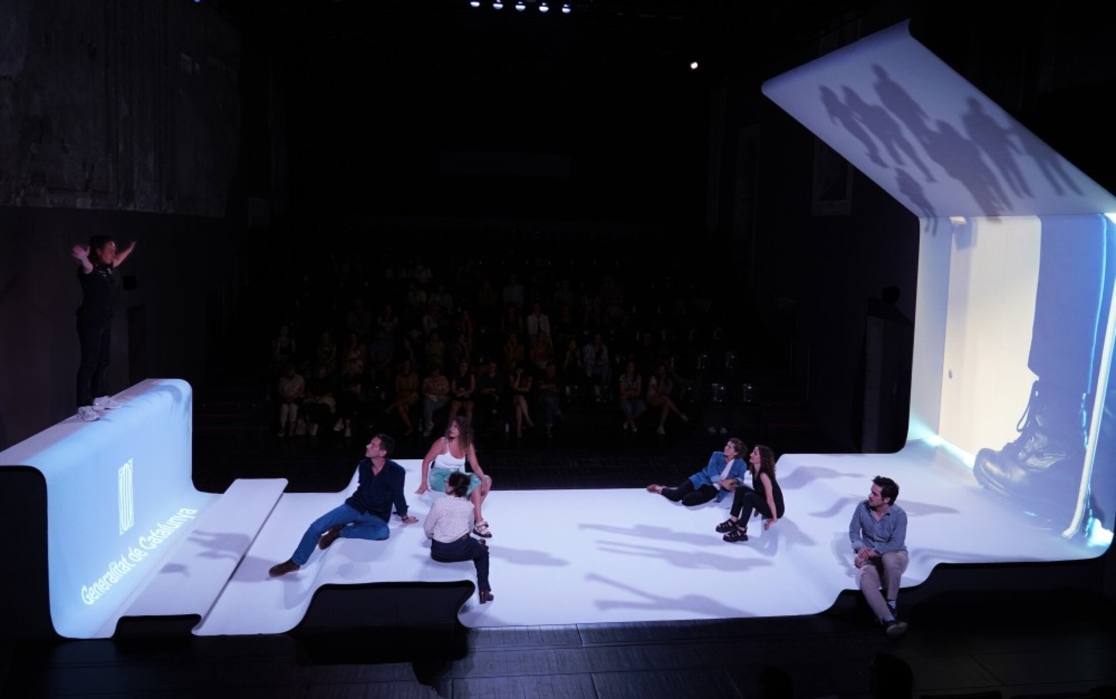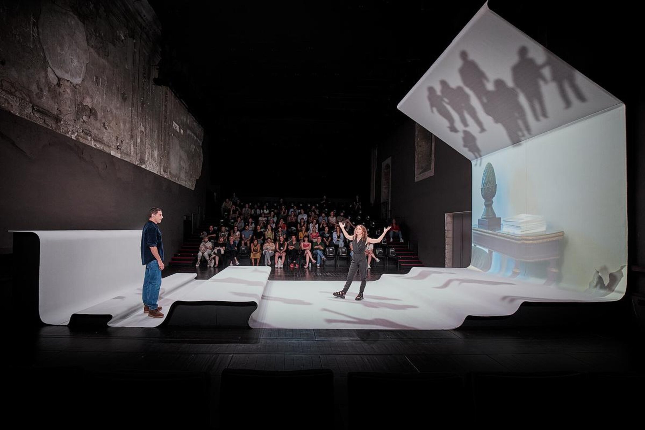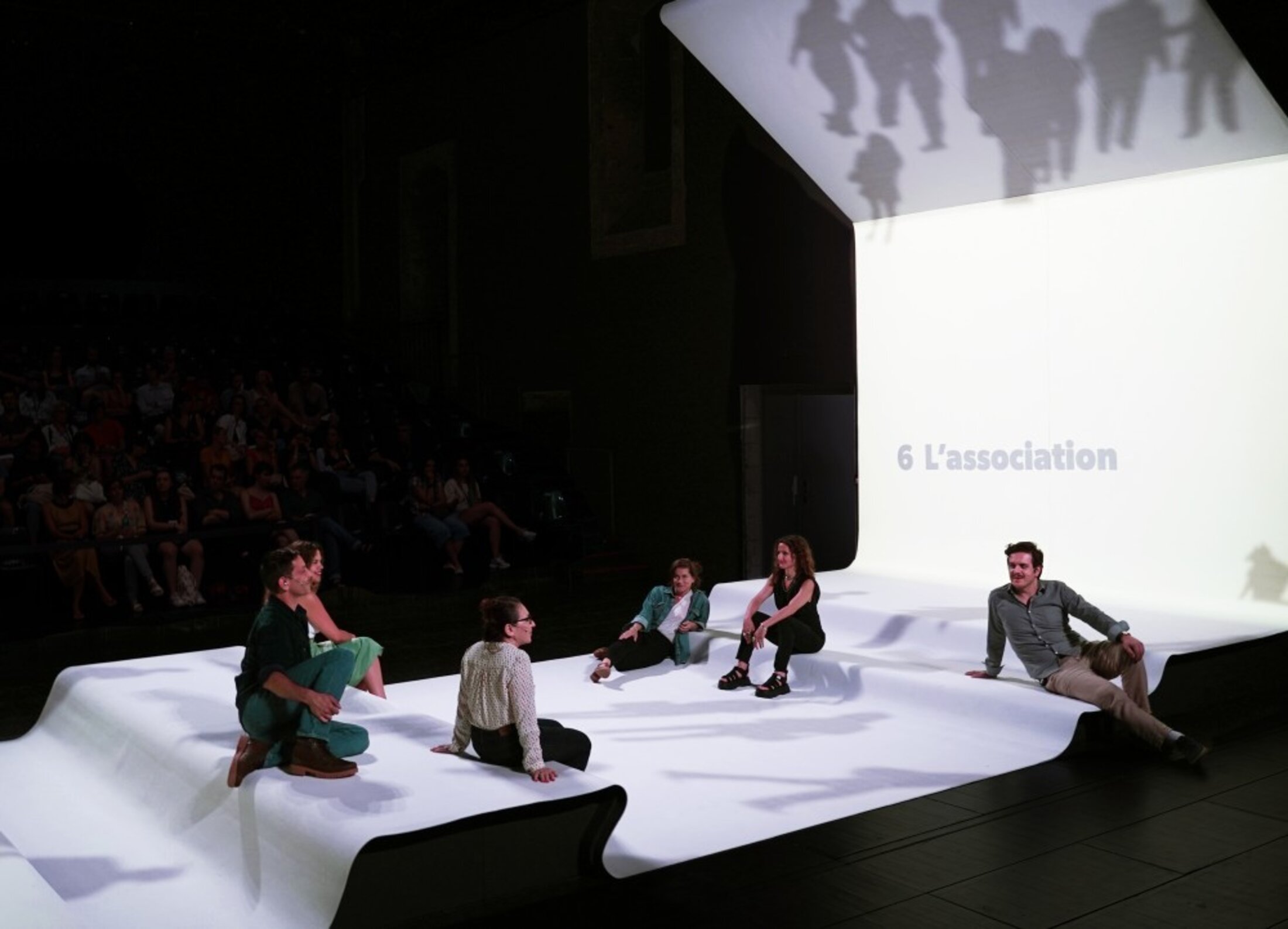 Un dispositif scénique bifrontal, imaginé par la scénographe Nadia Lauro, installe le public de part et d’autre de la scène, créant à la fois une proximité et un effet de tension qui forcent les spectateurs à devenir en même temps témoins et jurys, observateurs et complices, de ce qui va suivre. D’emblée, un pont entre l’intime et le juridique, entre le public et la parole, est ainsi instauré. Le plateau est entièrement occupé par un podium blanc ondulant comme une vague figée, « une page blanche[1] » explique Émilie Rousset, « une topologie habitée par les interprètes, les récits ». Une lumière crue, signée Manon Lauriol, baigne l’espace, révélant sa nudité clinique. Pas de décors superflus, ni de costumes clinquants – Andréa Matweber opte pour une neutralité qui efface les égos au profit des voix –, juste ce plateau nu et la surface de la structure comme réceptacle de fragments vidéo qui superposent les visages réels aux visages scéniques, dans un effet de miroir brisé. La musique de Carla Pallone, bourdonnement sourd et minimaliste, s’élève doucement, inquiétante. La pièce s’ouvre dans cette tension. Émilie Rousset, fidèle à son esthétique documentaire, compose un théâtre qui rejoue, avec une précision d’orfèvre, des entretiens réels collectés auprès d’avocats et avocates européennes spécialisés en droit de la famille et de justiciables européens. Les sept interprètes – Saadia Bentaïeb, Antonia Buresi, Teresa Coutinho, Ruggero Franceschini, Emmanuelle Lafon, Núria Lloansi, Manuel Vallade – entrent ensemble sur scène, sans cérémonie, avant de regagner leur place dans le public. Chacun porte une oreillette, outil clef du dispositif de « re-enactment » d’Émilie Rousset, qui garantit une fidélité absolue aux enregistrements originaux. En neuf tableaux qui sont autant de récits intimes, la pièce prend le pouls d’une Europe familiale déchirée, dans laquelle l’amour se mue en dossier, et le corps en preuve. La famille, ce sanctuaire présumé, s’impose judiciairement comme une machine à broyer les chairs, là où le viol conjugal n'est pas un crime mais une « faute » à négocier, et l’inceste, un murmure étouffé par le déni judiciaire.