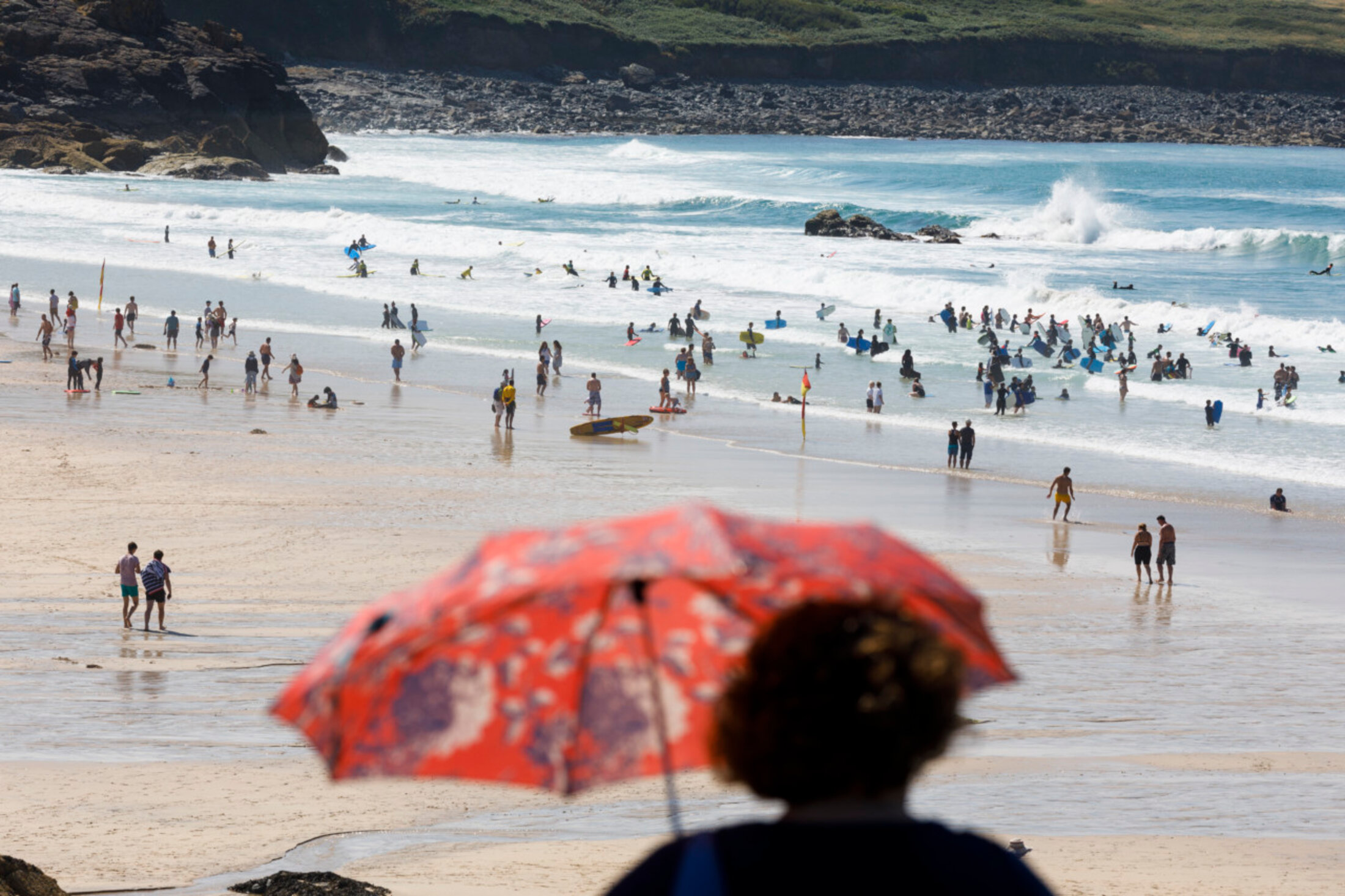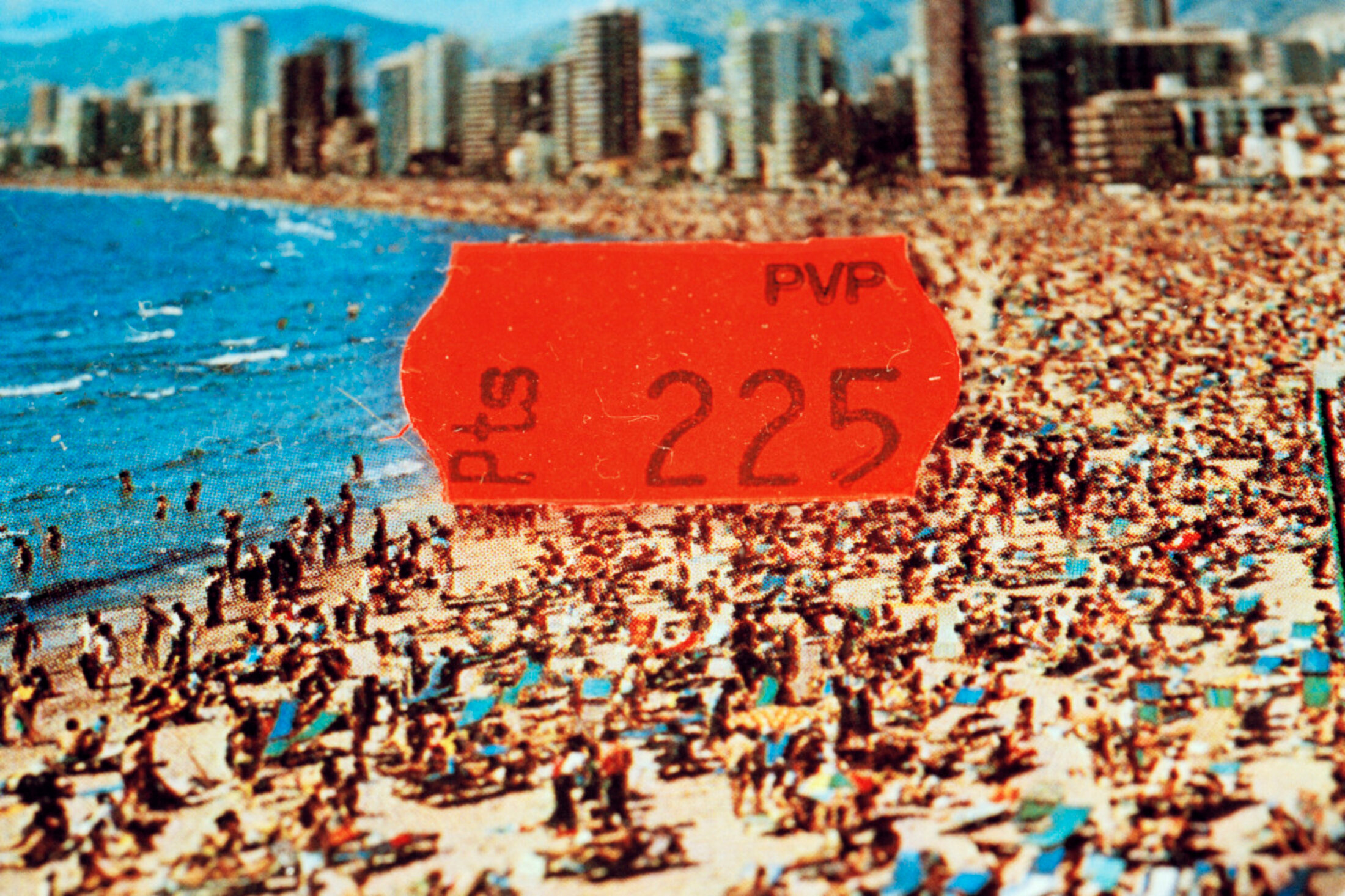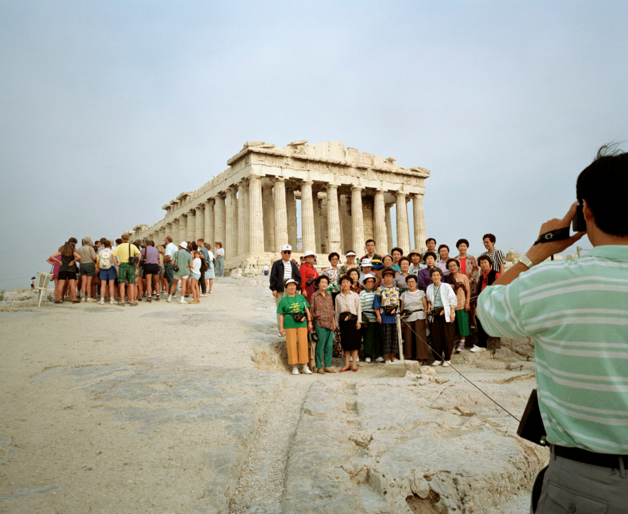 Martin Parr consacre la série « Small World », qu’il débute dans les années quatre-vingt, au tourisme international. Les images qui la composent figurent parmi les plus emblématiques du photographe britannique, et l’ouvrage paru en 1996, est l’un des plus populaires et des plus importants qu’il ait publié. Dans l’introduction, on y apprend que si l’industrie touristique était un pays, ce serait le troisième plus grand au monde. Parr explore le tourisme de masse, traquant avec humour ses dérives. Il s’intéresse aux habitudes et maladresses liées aux photographies touristiques, notamment aux portraits de visiteurs devant des sites culturels, un exercice qui fait partie de l’expérience, servant de souvenir du moment. Les biens matériels, les idées de liberté et de culture, le fait d’avoir assez d’argent pour croire qu’on en profite, sont autant de thèmes abordés dans les images de la série, à l’instar de « Seagaia Ocean Dome, Miyazaki, Japan, 1996 ». Le parc aquatique Ocean Dome, une gigantesque piscine de 300 m de long et 100 m de large, construite en 1993 et à la température constante de 30°C, était le plus grand au monde avant sa récente fermeture. Surtout, il était situé à quelques kilomètres à peine du rivage. Face à une telle absurdité, Parr réalise une véritable parodie de carte postale où tout, des rochers aux couleurs du ciel, semble faux.