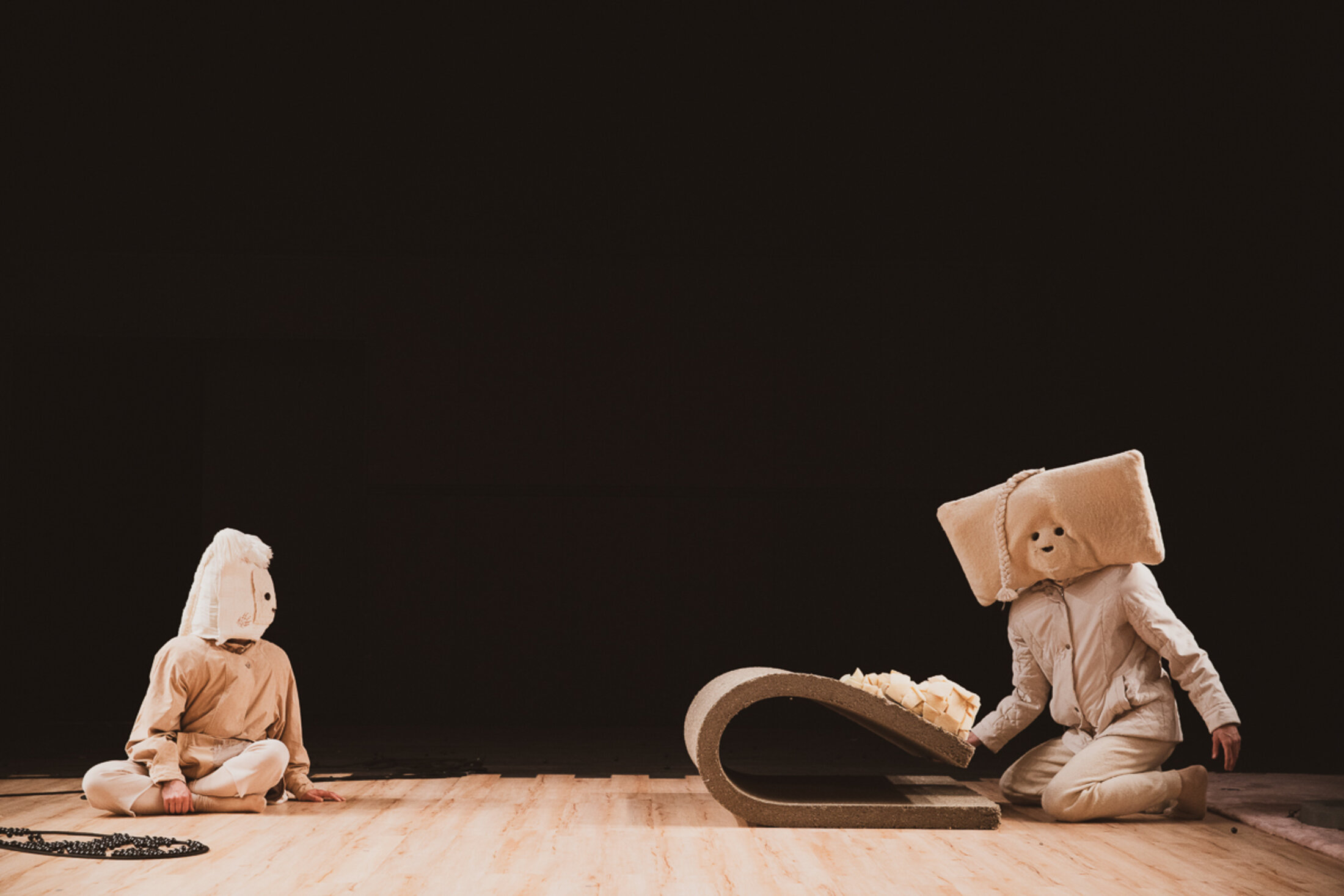 Lorsque la musique s’arrête, un premier protagoniste, étrange créature à tête d’oreiller, entre en scène sur un plateau nu bordé, à cour et jardin, de deux bandes de réserves d’accessoires qui seront utilisés tout au long du spectacle. Le premier a déjà récupéré une sorte de grand plateau quand la seconde fait son apparition, prenant au passage un sac plein de billes que les deux acolytes, assis en tailleur l’un en face de l’autre, vont s’amuser à faire rouler sur la surface du grand plat avant de le secouer, créant un mini-tremblement de terre qui va éjecter les billes et les répandre partout sur le sol. Sans un mot, ils se positionnent alors sur les bords du fond de scène et commencent délicatement à tirer le fil qui entoure l’espace de jeu, ramenant ainsi toutes les billes vers eux. La scène, d’une grande beauté tant plastique que visuelle, est caractéristique du travail scénique du collectif Old Masters[1] qui, depuis 2014, s’approprie et réagence « les discours et les pratiques les plus variées, banales ou expertes, qu’elles soient artistiques, scientifiques, politiques ou quotidiennes[2] ».Marius Schaffter, Jérôme Stünzi et Sarah André, proposent de déconstruire les rhétoriques scientifique et artistique par la convocation de la beauté dans l’anodin et le dérisoire. Les deux amis, bientôt rejoints par un troisième, s’amusent toute la journée à faire des trucs. Kim, Cleub et Mauro font des choses avec des objets. Lorsque Jonathan, le cousin de Cleub, leur rend visite, il trouve incroyable ce qu’ils font, alors que tout ce qu’il fait, lui, il trouve ça nul. Alors, tous l’encouragent à « faire son truc ». Un trois plus un qui devient vite quatre dans cette « performance jeune public d'expérimentation de l'autonomie et de la liberté par l'émerveillement ».