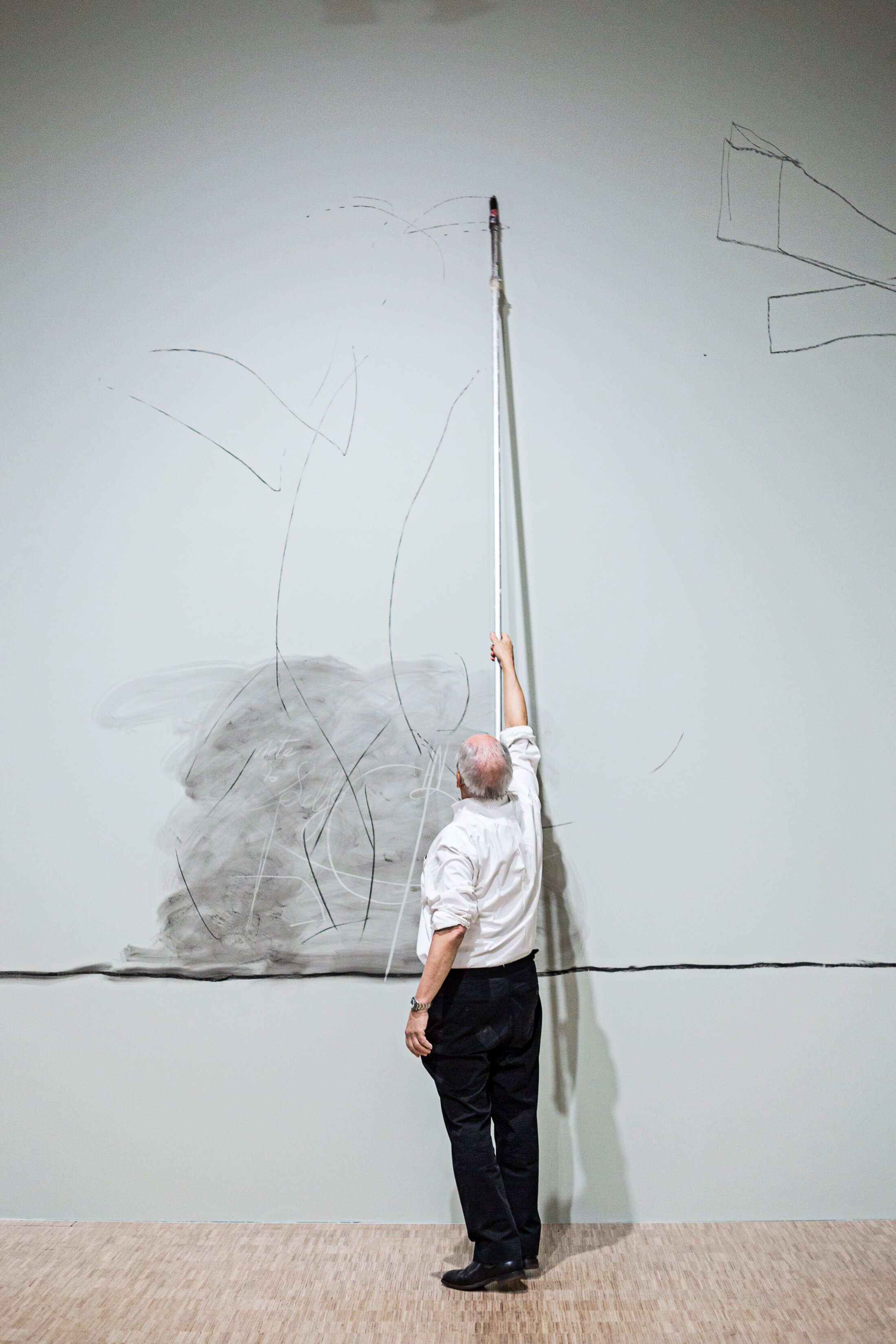 Une pièce entière est consacrée à l’espace de l’atelier qui est fondamental pour Kentridge. C’est le lieu névralgique de la création de son œuvre. Si l’exposition est envisagée comme un corps vivant, l’atelier en est le cerveau. La diversité des objets présentés atteste du foisonnement de pensée de l’artiste. « Man with hat », suite indissociable de cinq grands dessins (1999, Frac Picardie, Amiens), dont l’accrochage rythme l’espace mural, figure de façon très cinématographique le propre corps de l’artiste, nu, dans une mise en scène fortement inspirée par le travail du photographe américain d’origine britannique Eadweard Muybridge (1830 – 1904) qui décompose les mouvements du corps en photographiant une action à l’aide de plusieurs appareils à déclenchement automatique[5]. La hauteur de ces autoportraits grandeur nature diffère en fonction des positions que l’artiste doit adopter dans l’acte anodin de ramasser son chapeau tombé au sol pour le remettre sur sa tête. De part et d’autre, sur les murs latéraux, les représentations d’une constellation et d’une lune, sont des clins d’œil à Georges Méliès, pionnier du cinématographe moderne, dont le travail occupe une importance considérable dans le processus de création de William Kentridge. Dans la salle suivante, neuf écrans servent de réceptacles aux images de « 7 fragments for Georges Méliès, Voyage dans la lune » (2003), installation vidéo immersive, tournée en noir et blanc, qui alterne images réelles et dessins au fusain dont Kentridge efface certaines parties avant de les redessinées, si bien que dans l’animation finale chaque image porte les traces des effacements antérieurs, conférant à l’œuvre une mélancolie douce. La pièce est une mise en abime, à la fois enchantée et poétique, un hommage au maitre dans lequel le « Voyage dans la lune » (1902), revisité, prend des allures d’autoportrait. Kentridge déambule dans l’atelier, métaphore cosmique, laissant libre cours à son imagination artistique, le voyage de la terre à la lune s’incarne dans le cheminement onirique de la pensée créatrice de l’artiste.