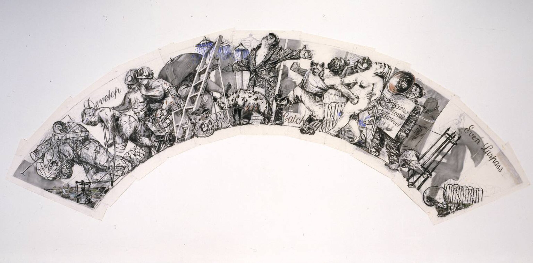 « Arc / Procession: Developp catch Up even surpass » (Tate, Londres, 1990), l’immense éventail dessiné par Kentridge marque sa première procession à l'intérieur de laquelle sont figurés un certain nombre de protagonistes que l'on va retrouver de façon récurrente dans tout son travail. Il est composé de onze feuilles de papiers formant un arc sur lequel une procession de personnes se déplace de droite à gauche. Il y a là des mineurs sud-africains noirs torse nu, casqués avec lampe torche frontale, un unijambiste en béquille, un homme croulant sur le poids matériel, un homme en casquette criant dans un mégaphone, une femme nue entourée de deux mineurs, deux hyènes, d’autres mégaphones, des barbelés. Au centre, un homme nu sous un manteau de tweed triomphe, les bras levés au ciel, dans une sorte d'extase proche de l'iconographie religieuse. A ses pieds l'une des hyènes nous fixe du regard, derrière lui des douches, et des personnes non identifiées cachées sous des parapluies. Le mineur de gauche porte, emmailloté dans le dos, la seconde hyène, comme on porterait un nouveau-né. L'image est à dominance noire et grise. Seule l'eau bleue jaillissant des douches offre une touche de couleur atténuant quelque peu l’aspect sombre de l’ensemble. Trois verbes sont mis en exergue : « Développer »; « Rattraper »; « Même dépasser ». Ils occupent les espaces gauche, central et droit de l’œuvre. Ils sont tirés d'un discours d’Haile Selassié (1892-1975), alors empereur d'Éthiopie[3], juste avant sa chute. Trois mois clefs censés galvaniser la population en promettant au pays la modernité et la richesse de l’opulent Occident. Développer, rattraper et même dépasser les pays occidentaux. Au lieu d’inscrire cet élan, Kentridge imagine une parade d’estropiés, de dépossédés, une sorte de carnaval des gueux avançant à marche forcée vers le développement économique, la transition capitaliste, celle-là même qui avait inspiré au dramaturge allemand Bertold Brecht son « Opéra de Quat’sous » en 1928, mis en musique par Kurt Weil, « une œuvre sociale et politique. Une sorte de satire à charge contre le capitalisme[4] ». A la fin des années 1980, une grande partie du travail de William Kentridge tourne l'idéalisme politique en satire. Il réalise ses premiers films d’animation pour lesquels il met au point une technique cinématographique réunissant photographies, dessins au fusain et collages, qu’il nomme « animation du pauvre ».