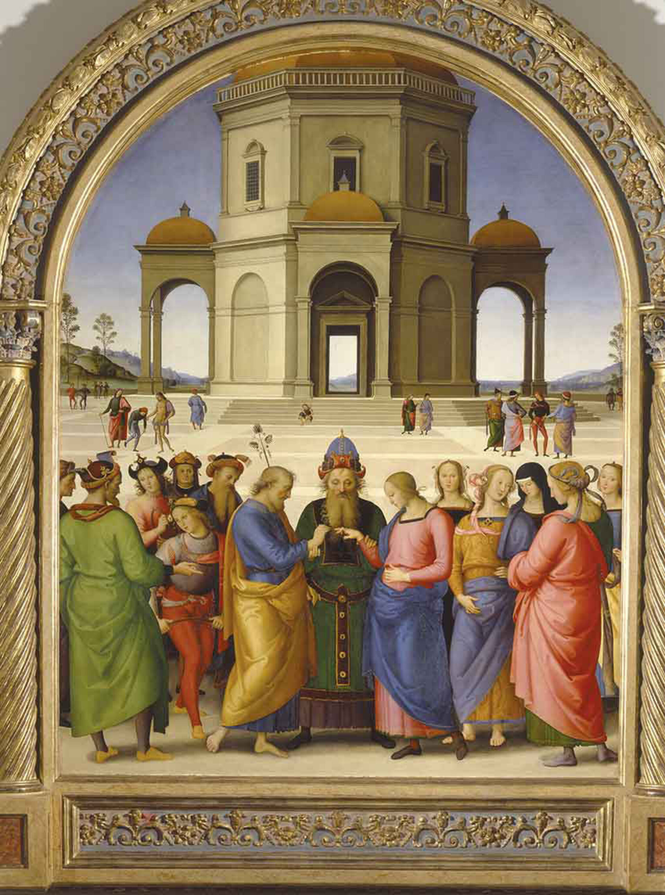 Le parcours s’ouvre sur « Le Mariage de la Vierge » (1504) du Pérugin, chef-d’œuvre des collections du musée dans lequel l’horizon semble se découper comme une promesse divine, une perspective renaissante héritée de Brunelleschi et d’Alberti, qui place l’humain au cœur de l’espace, entre le temple terrestre et le ciel infini. La porte ouverte de ce bâtiment octogonal qu’est le temple laisse entrevoir un paysage lointain, une ouverture sur l’horizon qui marque le point de fuite, point unique vers lequel convergent toutes les lignes du tableau, suivant les règles de la perspective centrale. La ligne bleue, ce paysage toscan idéalisé qui sépare la foule nuptiale du divin, apparait comme l’invention même de l’horizon, cette illusion optique qui transforme la peinture en fabrique des rêves. Cette première section, intitulée « Horizon et perspectives », pose les fondations d’une exploration séculaire de l’horizon dans l’art, en s’ancrant dans l’invention de la perspective à la Renaissance. Elle met en lumière la façon dont la ligne d’horizon, placée à la hauteur des yeux du regardeur, et née des théories géométriques de Brunelleschi et d’Alberti, a transformé la peinture en un outil de maîtrise de l’espace et de l’infini. Un ensemble de traités sur la perspective, premiers lieux de théorisation artistique de l’horizon, allant de Piero Della Francesca à Abraham Bosse et William Hogarth, illustre cette révolution visuelle et les recherches menées sans discontinuer depuis son invention.