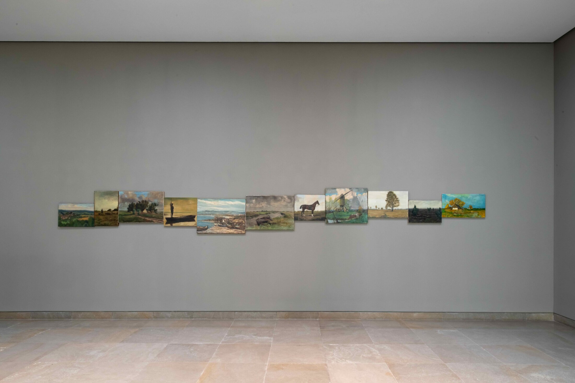 En guise de préambule, les « 11 horizons » d’Hans-Peter Feldmann (1941-2023) accueillent avec humour et poésie les visiteurs dès le hall du musée. Cet assemblage de onze peintures à l'huile, toutes des paysages, réalisées par plusieurs artistes à différentes époques, est emblématique de l’approche visuelle de l’artiste allemand qui utilise ici ces paysages comme des études topographiques. Sans cadre, accrochées bord à bord malgré leurs dimensions différentes, ces peintures, trouvées dans des vide-greniers ou des brocantes, sont alignées sur leur horizon visible afin de tracer une ligne continue à travers les différentes images, construisant un panorama ininterrompu.