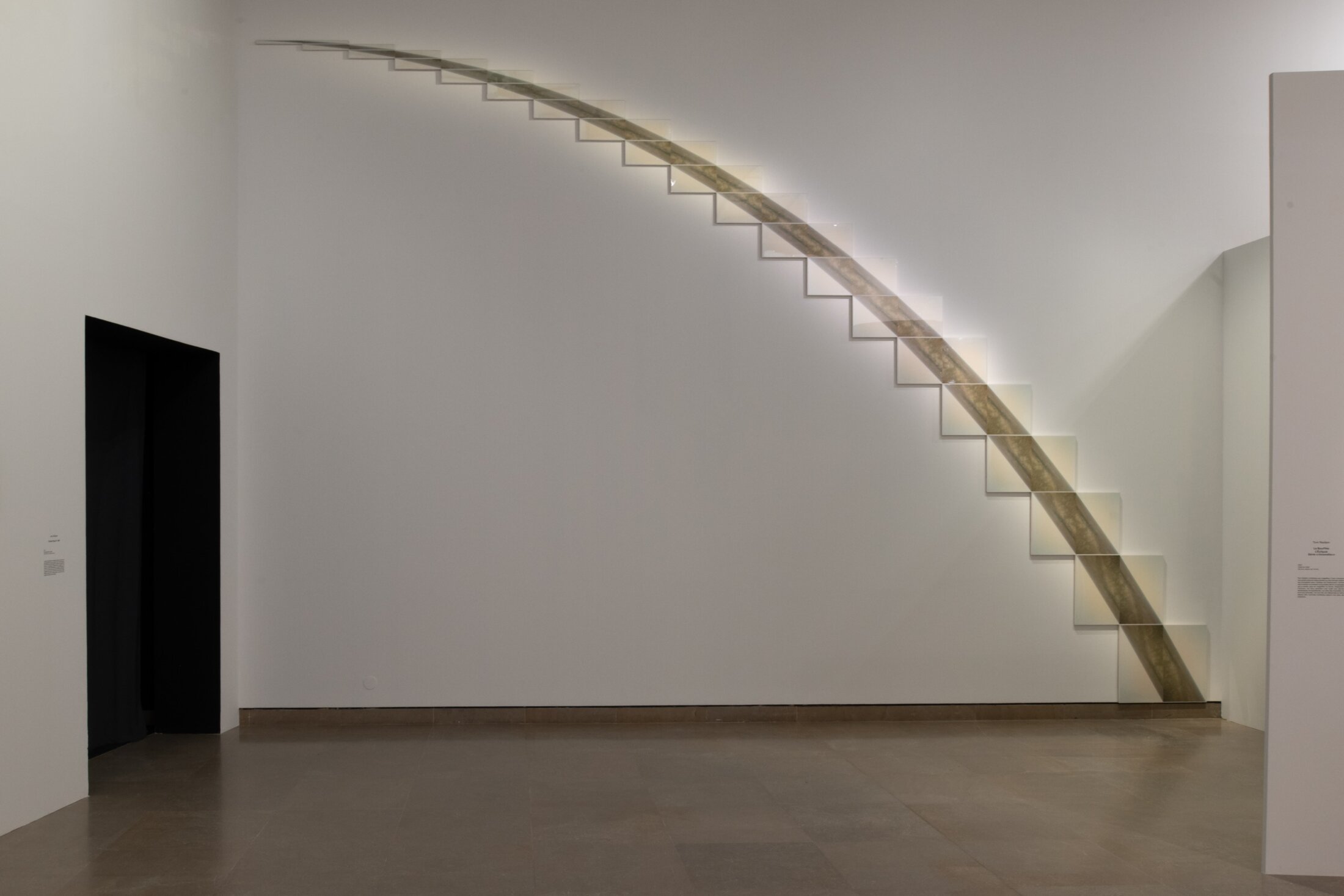 Intitulée « Suite sans fin. Devenirs abstraits de l’horizon », la quatrième et dernière section explore l’évolution de la représentation de l’horizon dans l’art moderne et contemporain, où il se détache de sa fonction figurative pour devenir un concept abstrait, poétique et philosophique. L’horizon, libéré des contraintes de la représentation réaliste, se transforme alors en un espace d’expérimentation formelle, spirituelle et conceptuelle. Il cesse d’être une ligne littérale pour devenir un champ d’exploration artistique dans lequel les notions de limite, d’infini et de perception sont réinterprétées à travers des formes, des couleurs et des textures abstraites. Les artistes déconstruisent l’horizon traditionnel pour en faire un espace de réflexion sur le temps, l’espace et l’expérience humaine, souvent en lien avec des questionnements métaphysiques ou cosmiques. Il devient enfin une métaphore de l’illimité, un lieu où se croisent le tangible et l’intangible, invitant à une méditation sur l’existence, l’univers et les nouvelles frontières technologiques ou spatiales. Ce déclinaisons de l’horizon se reflètent dans les travaux d’Anna-Eva Bergman, dont les compositions minimalistes transforment les horizons en rythmes métalliques et minéraux, mêlant abstraction, spiritualité et contemplation épurée de la nature, évoquant des paysages intérieurs ou cosmiques, mais aussi dans « Votre Émergence Privée (Jaune à Bleu) » (2012) de l’artiste islando-danois Ólafur Elíasson, qui explore l’émergence subjective de la couleur et de la perception, rendant palpable l’idée d'un horizon sans fin, à la fois physique et métaphysique, ou encore dans « Le Mont Stetind, enveloppé de brouillard » (1864) du peintre norvégien Peder Balke, figure emblématique du romantisme scandinave, dans lequel l'horizon est bas, dominé par la masse verticale du pic qui semble défier les vagues du fjord en contrebas, créant un contraste saisissant entre la fragilité humaine – représentée par de minuscules figures au premier plan et un navire lointain – et la grandeur impitoyable de la nature.