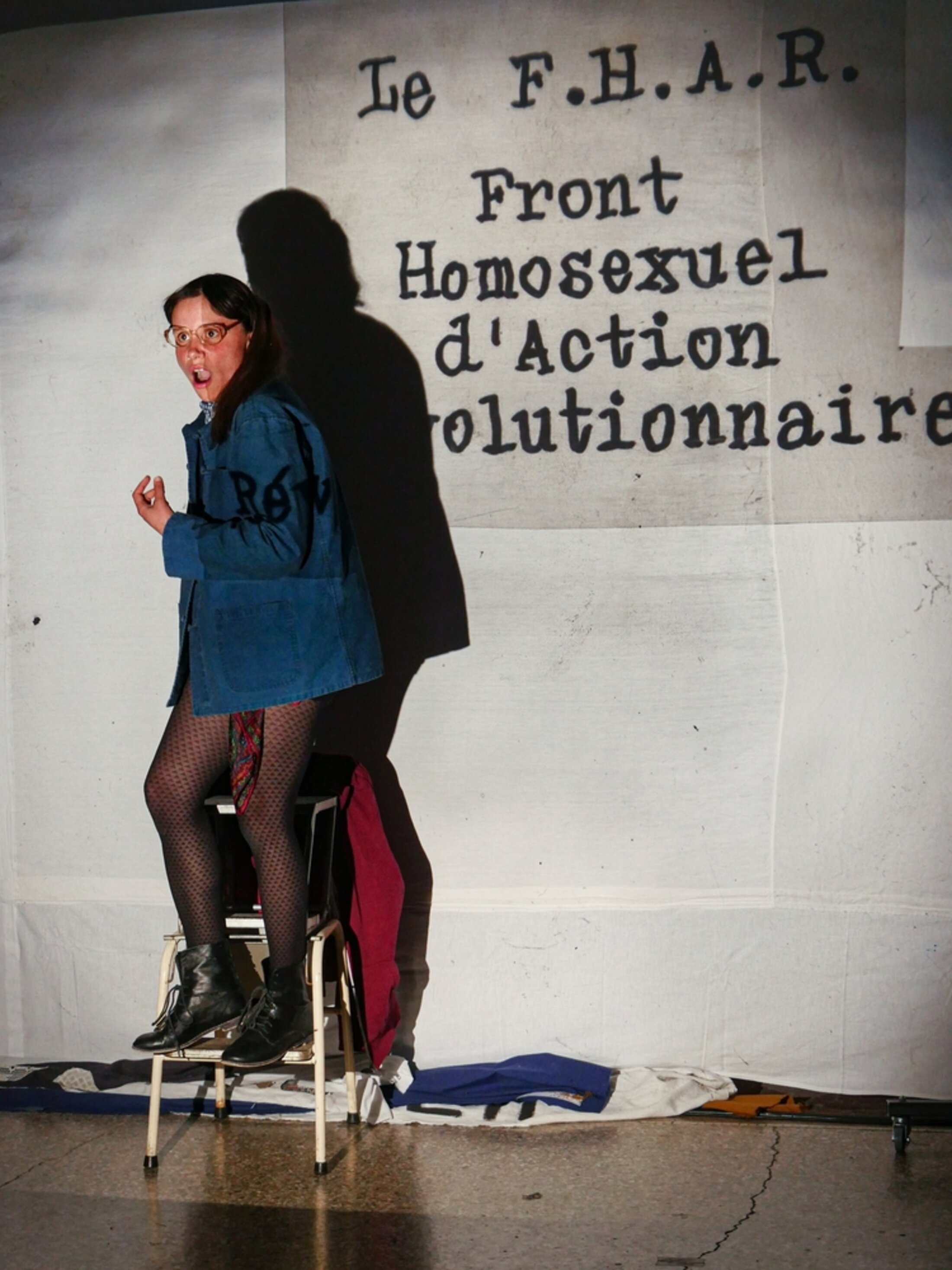 Pour l’occasion, le théâtre devient le lieu de la prise de parole directe, les comédiennes prenant à la lettre l’expression « vidéo d’intervention » pour laquelle Carole et son mari Paul Roussopoulos font figures de précurseurs avec la fondation de « Vidéo Out », premier collectif de vidéo militante. « L’intérêt de la vidéo c’est qu’elle se situait précisément entre le tract papier traditionnel et le média télé ». L’adresse au public est continue, qu’il s’agisse des comédiennes – Aurelia Lüscher et Marie-Ange Gagnaux en alternance avec Itto Mehdaoui, ces deux dernières étant les autrices de la pièce – ou des personnes qu’elles incarnent : Carole à la régie et les protagonistes des luttes qu’elle enregistre sur la pellicule. Ainsi le spectacle commence comme une conférence sur l’œuvre engagée de la vidéaste avant que le temps ne glisse lorsque la comédienne interviewe les personnes filmées par Carole Roussopoulos, se confondant un instant avec elle, vivante à nouveau à travers elle. Le public se retrouve alors projeter dans les mouvements et les luttes de l’époque. Comme toujours avec le Collectif Marthe, plusieurs temporalités se croisent. La mise en abime est permanente.