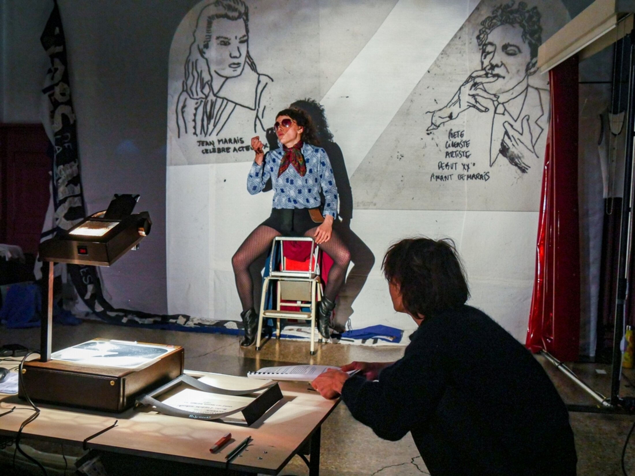 Sur la scène de la salle Christian-Bérard, écrin de quatre-vingt-dix places au dernier étage du Théâtre de l’Athénée Louis Jouvet, deux comédiennes du Collectif Marthe accueillent le public lors de son entrée en salle. L’une tiendra une régie à vue installée au bord du plateau, tandis que l’autre, aidée d’un portant et de quelques accessoires, interprètera certaines des personnes filmées par Carole Roussopoulos[1], féministe et réalisatrice franco-suisse, pionnière de la vidéo qui s’attachera toute sa vie à relayer la parole d’anonymes ayant fait l’histoire politique et sociale de son temps. À son arrivée à Paris, elle travaille pour le magazine Vogue qui, en la licenciant quelques années plus tard, ne sait pas – et elle non plus – à quel point il va changer sa vie. Nous sommes en 1970.