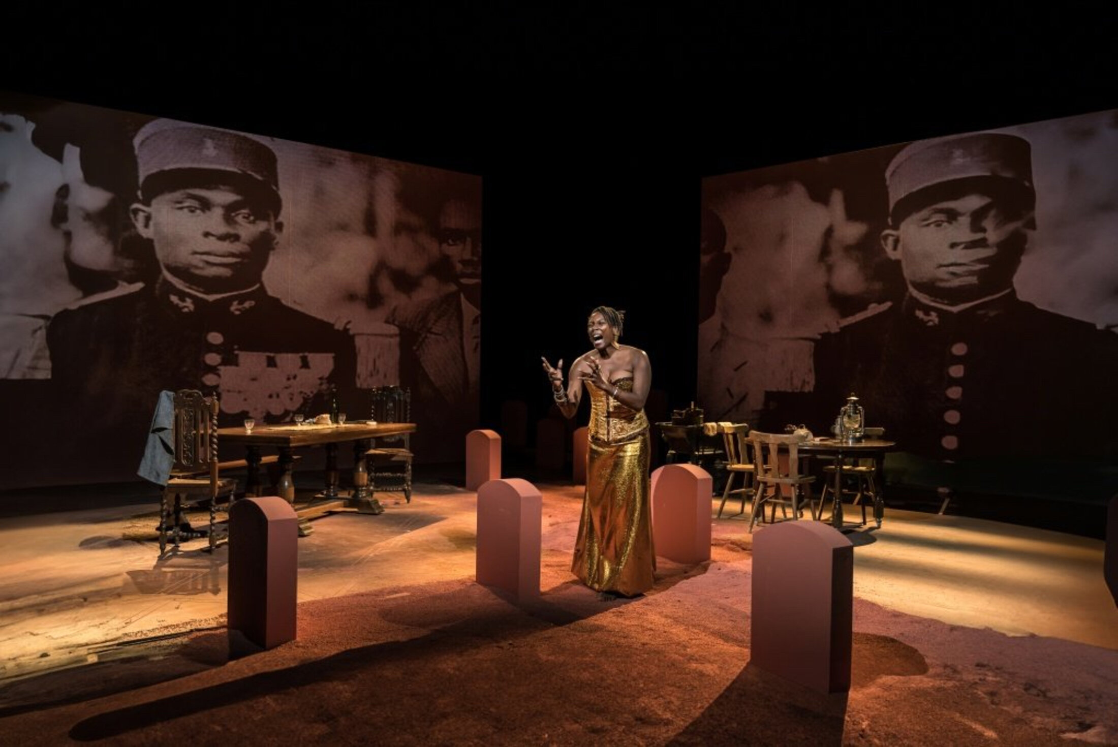 Un cimetière. La scène, recouverte de stèles rouges sur une terre ocre, figure un cimetière, ou plus exactement, un Tata[1], un cimetière érigé à la manière des enceintes sacrées sahéliennes. Celui-ci est flanqué de deux cimaises, deux hauts murs qui dessinent une ligne oblique ménageant une ouverture. Si les tombes annoncent le drame, côté cour, un joueur de kora et un pianiste mêlent déjà les sonorités de leurs instruments faisant se rejoindre les cultures européenne et africaine, comme un bon présage pour aujourd’hui. L’autrice sera le fil rouge de la pièce, le lien entre notre présent et ce passé occulté qu’elle révèle d’emblée. Elle est celle qui fait surgir l’histoire pour mieux comprendre notre temps. Éva Doumbia pourtant n’incarnera pas son propre rôle cette fois. C’est à la comédienne Mata Gabin qu’est confiée le personnage. Habillée en robe d’apparat, elle raconte, dit qu’elle ne se souvient pas des circonstances qui l’ont conduite à prendre connaissance du Tata de Chasselay, nécropole située à vingt-et-un kilomètres au nord de Lyon où reposent cent-quatre-vingt-huit tirailleurs sénégalais du 25e Régiment des Tirailleurs Sénégalais (RTS) morts pour la France sur les cent-quatre-vingt-seize tombes qui le composent. Elle rappelle au passage qu’ils n’étaient pas tous sénégalais, que le terme désignait l’ensemble des soldats d’Afrique subsaharienne se battant sous le drapeau français, le différencient ainsi des unités d’Afrique du Nord, tels les tirailleurs algériens.