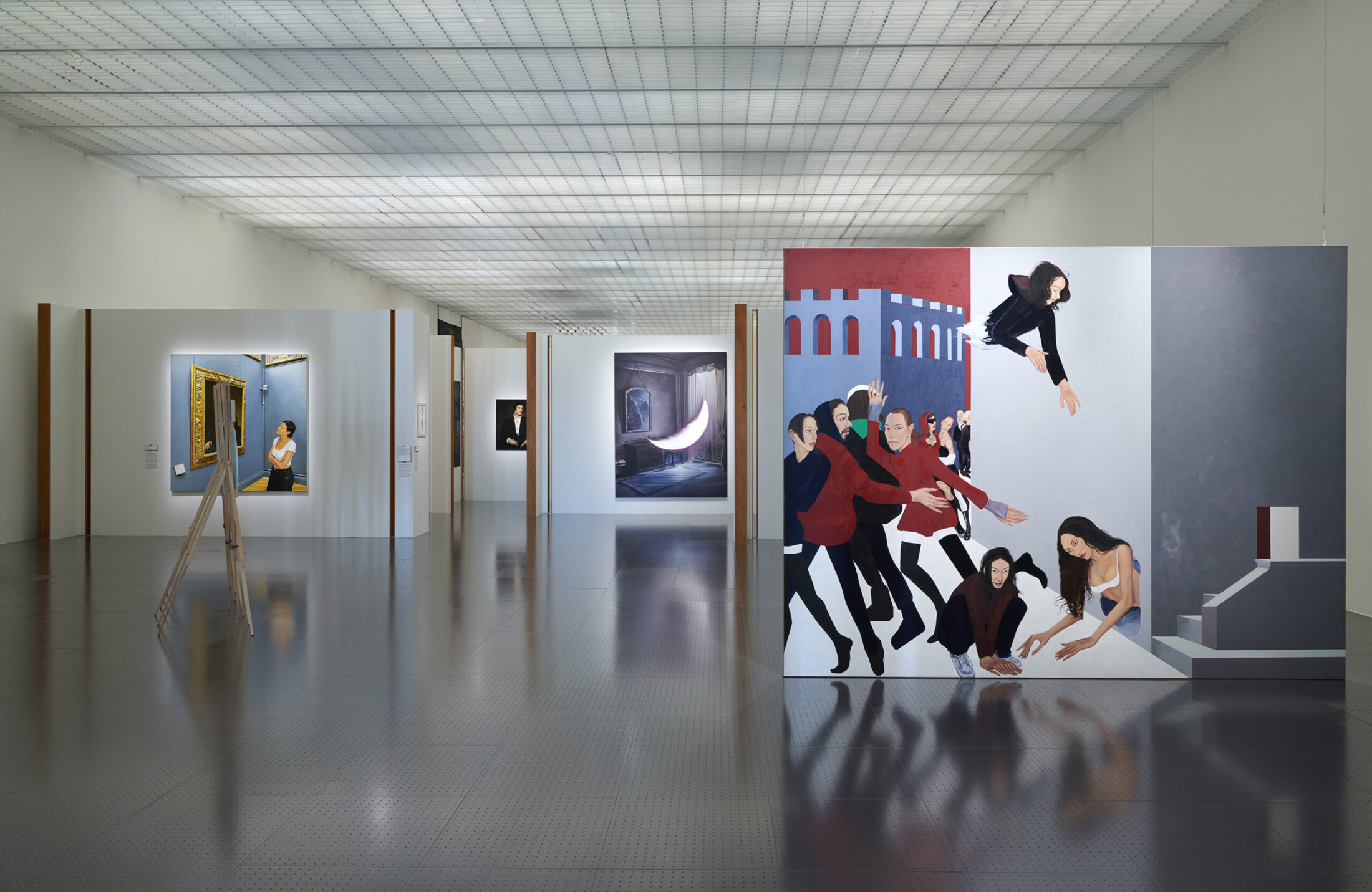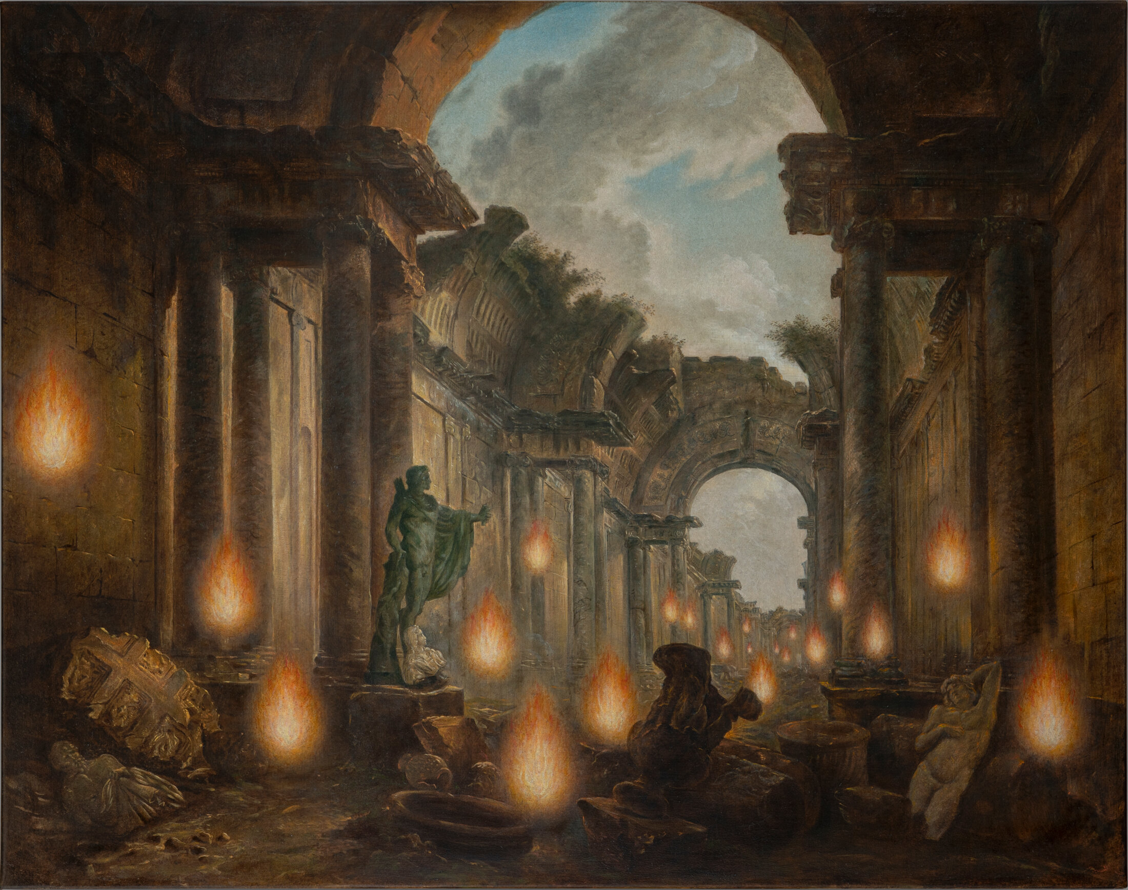D’autres artistes, comme Anri Sala qui, avec « Echoes of the Oath » (2025), revient à la peinture à fresque de ses débuts, entreprenant de copier un détail d’une fresque du Quattrocento italien représentant le Calvaire exécuté par Fra Angelico, ou Laurent Grasso, qui introduit des éléments perturbateurs dans sa copie d’une vue fantasmagorique du musée en ruine (1796) d’Hubert Robert, déplacent le statut de l’image pour mieux l’analyser. D’autres encore, comme Madeleine Roger-Lacan, qui reprend le célèbre « Bain turc » (1863) d’Ingres, tondo combinant sexualisation des corps féminins et fantasme d’un exotisme oriental, dans son « Crépuscule du désir », en prenant soin de substituer aux figures féminines des corps masculins hypersexualisés et lascifs, ou Neïla Czermak Ichti qui inverse les récits et les rapports de force en réinterprétant « Roger délivrant Angélique » (1819) du même Ingres, soulignent combien l’interprétation est susceptible de varier en fonction du cadre dans lequel est fabriquée la copie.