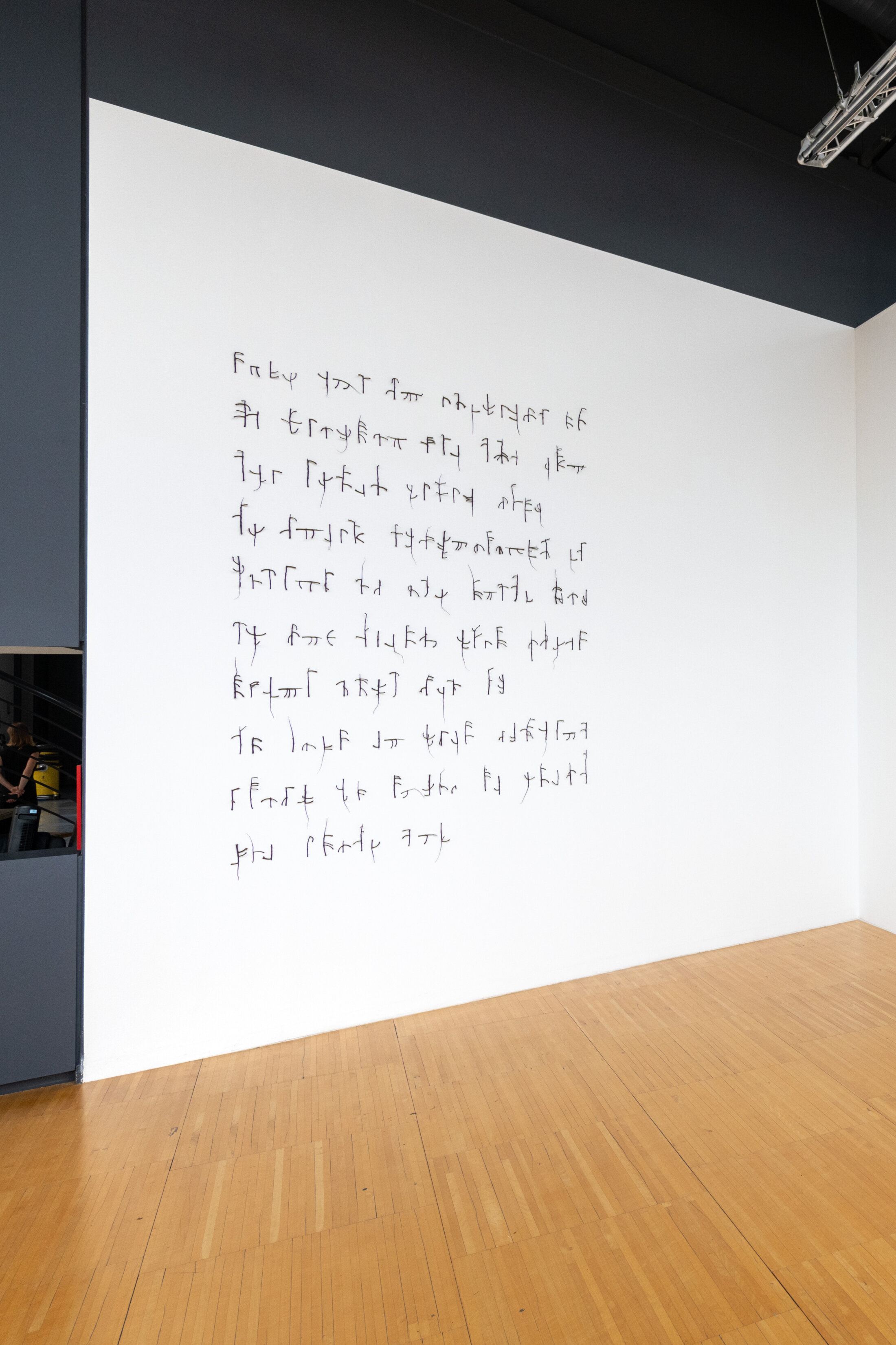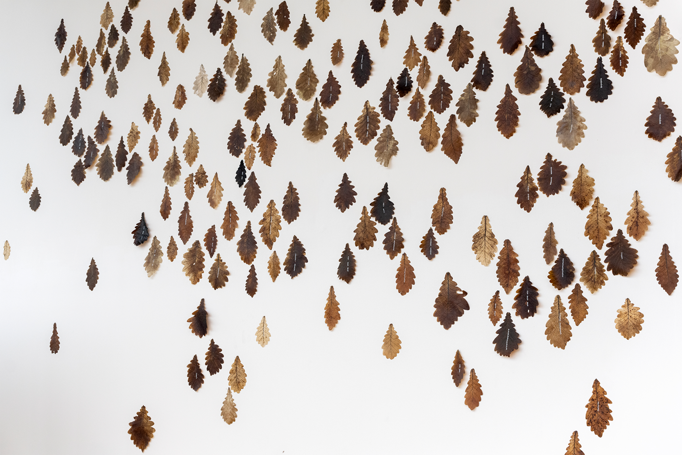 L’exposition s’ouvre sur une œuvre inédite de Claudie Hunzinger qui, du haut de ses quatre-vingt-trois ans, fait figure de doyenne. Romancière autant que plasticienne, elle travaille, pour l’installation « L’heure des oiseaux », sur des feuilles de chêne qu’elle fait bouillir à l’aide de produits chimiques, selon le même procédé que la fabrication du papier, pour en obtenir la même texture, les mêmes propriétés. Sur ces pages en feuilles de chêne, elle inscrit des glossolalies qui, une fois agencés sur la grande façade vitrée du Frac, correspondent à des chants d’oiseaux pouvant aussi être lus comme des partitions. L’œuvre est une tentative de traduire leur langage.