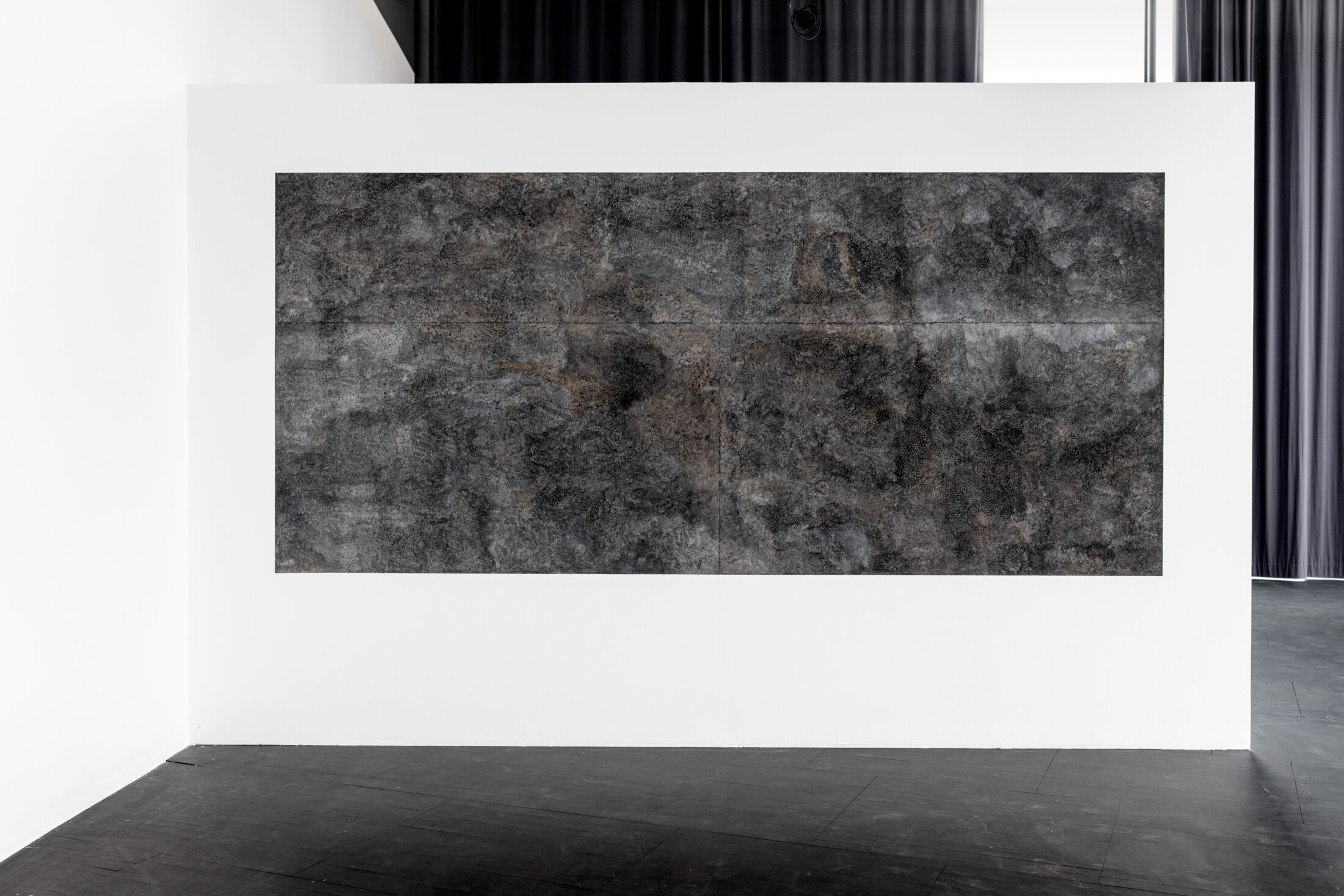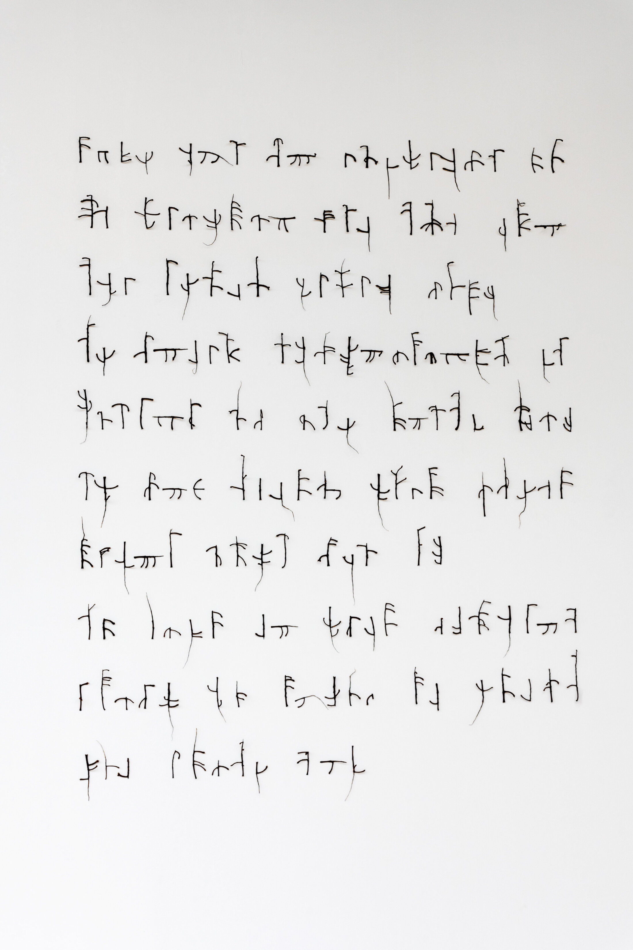 Fils d’écologues, François Génot développe une démarche artistique qui emprunte à la résistance et à la prolifération du vivant. Il aime à investir les friches qu’il aborde à la manière d’un atelier éphémère à ciel ouvert dont il crée, dans un mode de production vertueux et biodégradable, la « mémoire carbone ». Génot produit ses propres outils à dessin à partir de l’histoire de ces écosystèmes qu’il arpente en glanant les plantes qui s’y trouvent. Il les transforme alors en fusain qui va servir, d’une part, à alimenter une bibliothèque infinie de ces réminiscences, et d’autre part, à produire des monochromes dont les infimes variations donnent l’ADN, à chaque fois unique, de ces friches. Pour l’exposition, il a exploré celle dite de « Celluloïd » située juste derrière le Frac Alsace, et qui est déjà en voie de disparition. Jusque-là laissée libre, la parcelle est désormais en cours de bétonisation. L’artiste transmute des branches d’ailanthus altissima en craie noire avec laquelle il recouvre en partie une cimaise de l’espace d’exposition, donnant l’illusion d’un très grand tableau horizontal au camaïeu anthracite qui rend sensible, en les fusionnant, la mémoire matérielle de la cimaise et le souvenir de la friche. Du même artiste, « La piste » (2017, collection du Frac Alsace) est une œuvre protocolaire qui consiste à agencer sur un mode textuel des branches de marronnier ramassées à l’automne. Celles-ci sont épinglées sur le mur et composent des phrases qui appartiennent au monde végétal tout en lui échappant. Ce « texte évocateur, reconnaissable et indéchiffrable, comme le socle d’une écriture appartenant à tous comme des indices d’un monde à lire[2] », renvoie aux recherches zoopoétiques[3].