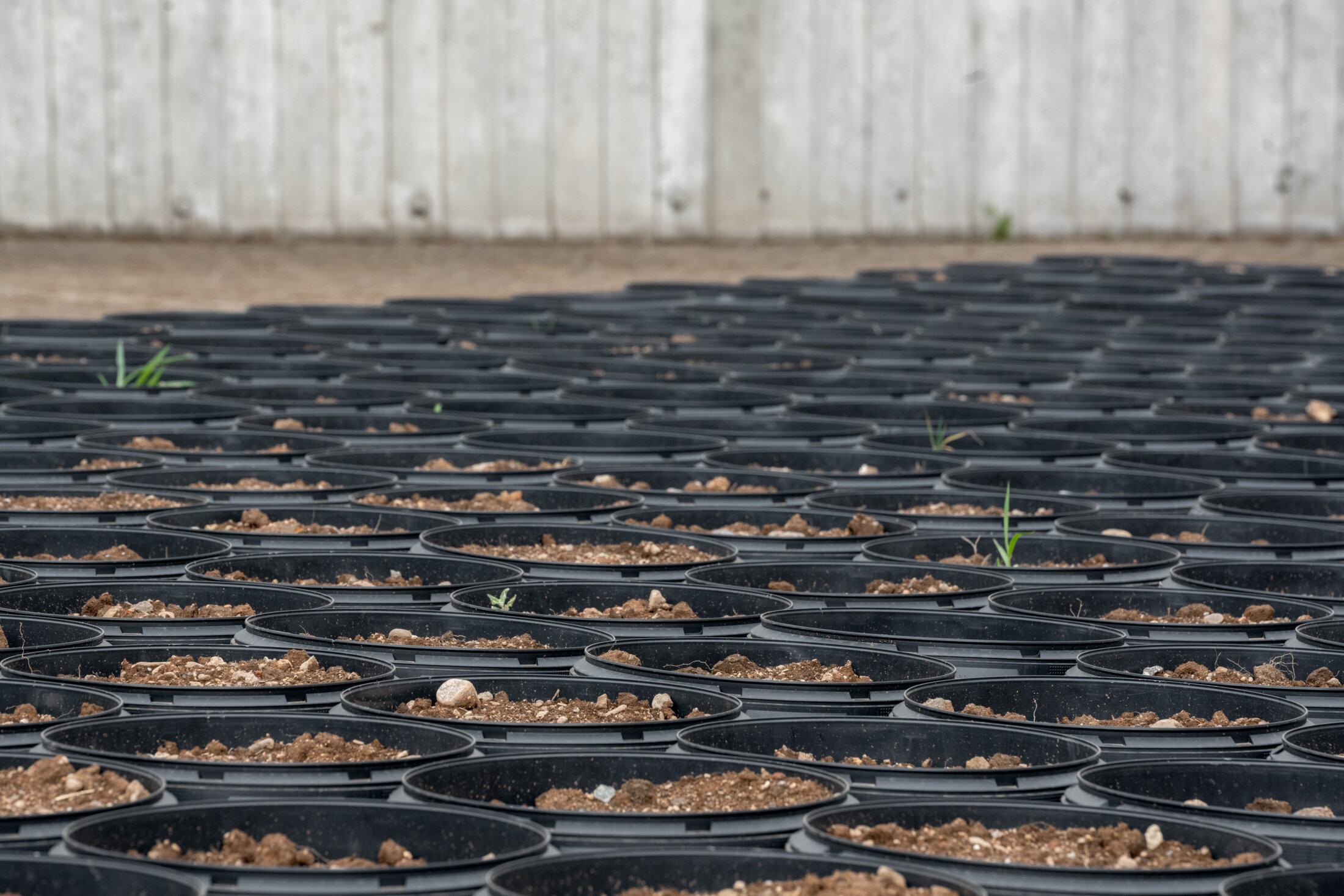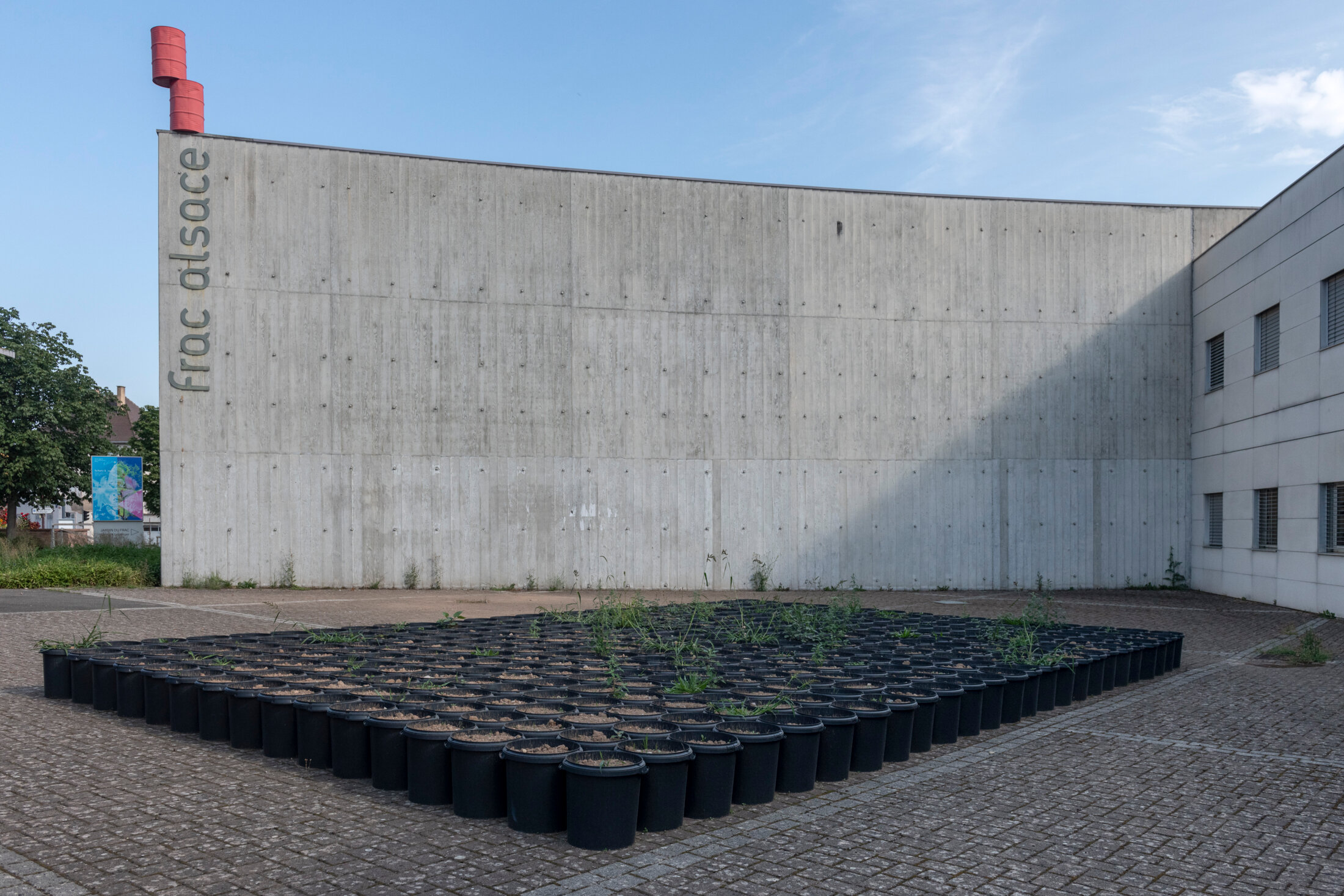 L’artiste autrichien Lois Weinberger (1947-2020), qui place la nature et la société de consommation au cœur de ses œuvres, s’intéresse lui aussi aux friches. Sa démarche botaniste et écologue s’organise autour de la société des plantes qu’il tient pour l’exacte miroir de celle des humains[4]. Révélateur des espaces marginaux, il s’attache à libérer les rudérales, autrement dit, les soi-disant « mauvaises herbes ». L’installation « Garden »se compose de quatre-cents pots en pvc recyclé remplis de terre provenant des friches alentour. À l’abris de toute intervention humaine, ils accueillent rapidement une végétation spontanée à la faveur des vents, des oiseaux ou des petits mammifères. La démarche anti-décorative de Weinberger se situe à l’opposé des pots de fleurs ornementaux, plantés en général de végétaux forcés aux engrais. Il déplace ainsi nos habitudes de domination en libérant les rudérales de leur domestication, nous apprenant simplement à laisser vivre le vivant.