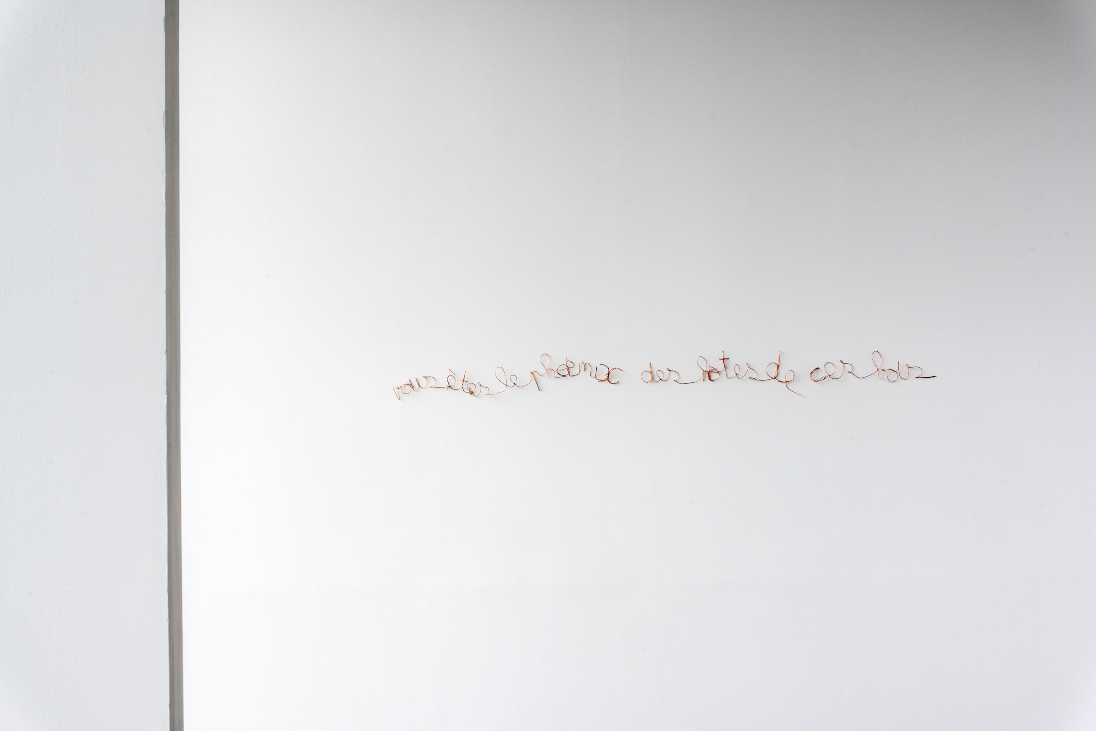 Sur le mur, gravé en fils de cuivre, le vers de La Fontaine « Vous êtes le phœnix des hôtes de ces bois » est l’œuvre de l’artiste franco-gabonaise Myriam Mihindou. Pour les Dogons, le cuivre correspond à la parole. Il permet l'enracinement des pensées et des savoirs des figures des ancêtres. Pour les (néo)colonisateurs, il s’agit d’une ressource à exploiter, nécessaire à la production de l’horlogerie, des ordinateurs ou des câbles permettant l'électrification des rails de train. Elle questionne notre capacité à transformer nos usages prédateurs.