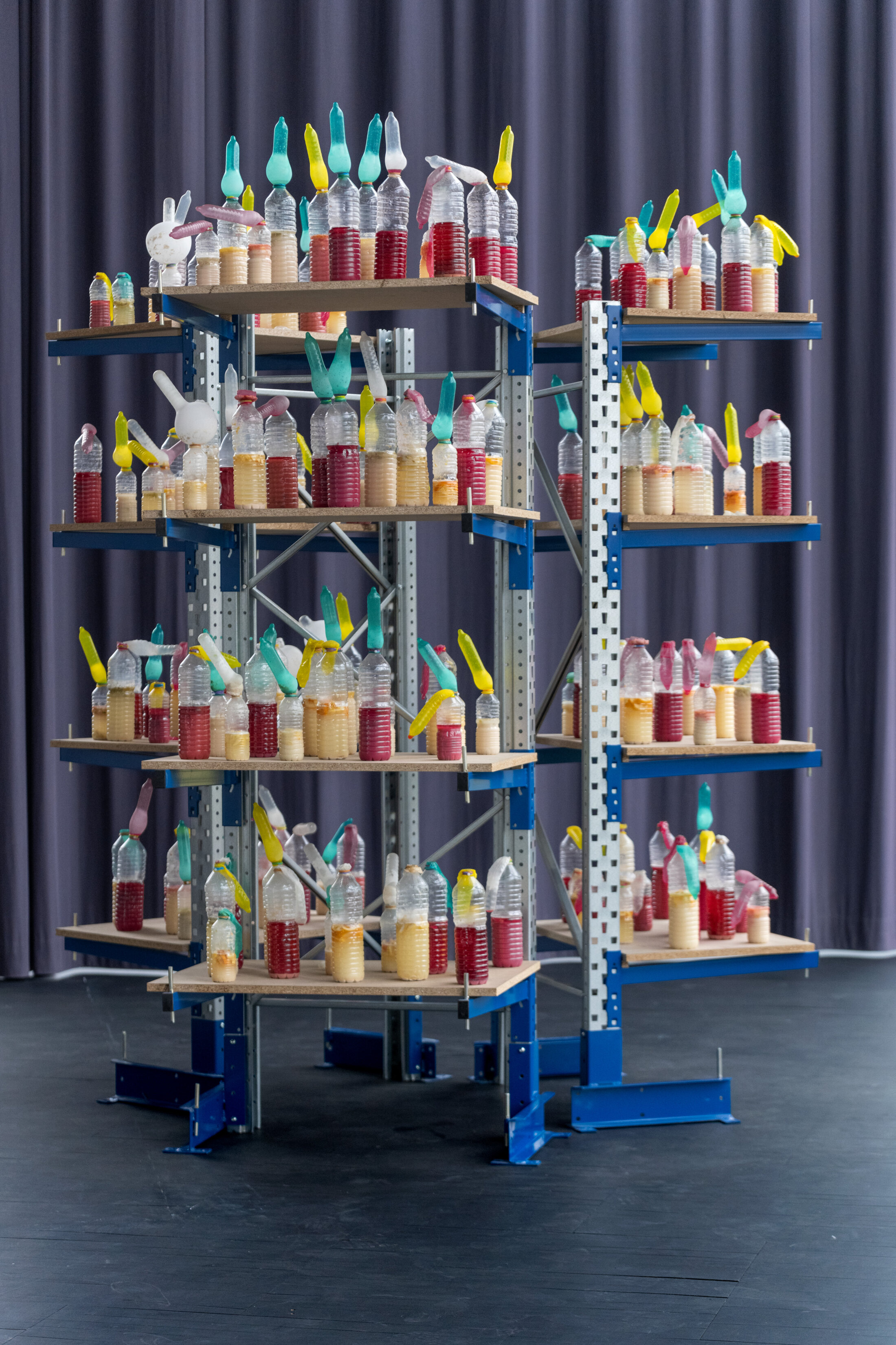 Avec l’installation protocolaire « Prohibition », Nicolas Daubanes rejoue une pratique usitée en milieu carcéral, une manière de faire de l’alcool à l’aide de bouteilles en plastique renfermant un mélange qui s’alcoolise par fermentation lorsqu’il est clos, ici par des préservatifs – distribués en grand nombre dans les prisons et pour la première fois en couleurs. Gonflés par le CO2 et l’éthanol des levures, les capotes se font érectiles. Les bouteilles sont présentées sur des étagères installées en carrousel. Il s’agit aussi pour l’artiste d’une métaphore sur l’enfermement : si on tente de contenir la vie, il est possible qu’elle explose.