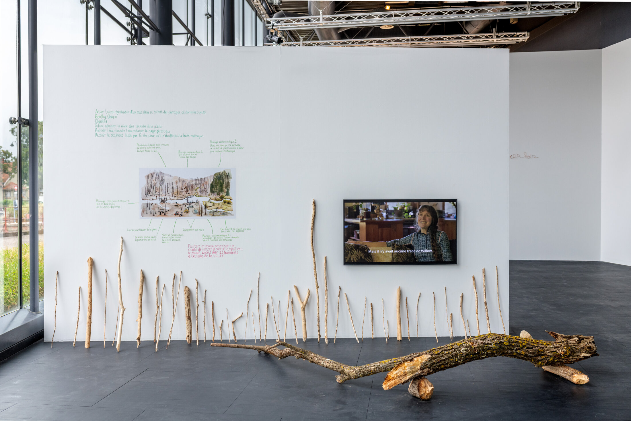 L’agriculture conventionnelle tue les sols à force de retourner la terre, de domestiquer à tout prix en se battant contre le sauvage. Nous détruisons la terre en l’épuisant. L’utilisation d’engrais chimique compensant la perte des champignons, des insectes et des bactéries, dont il faut encore expliquer qu’ils sont nos alliés, peut être compris comme un biocide. Suzanne Husky réussit à mêler ses activités d’horticulture, de permaculture et d’agroforesterie. Elle érige le peuple castor en ingénieur qui fait revenir les forêts, favorisant des naturalités – terme préféré à celui, trop polysémique, de biodiversité – nouvelles, en retenant des millions de tonnes d’eau dans les nappes phréatiques. L’artiste franco-américaine propose que nous apprenions des castors, tout comme le préconise également le rapport 2022 du GIEC dans le cadre de la lutte contre le dérèglement climatique.