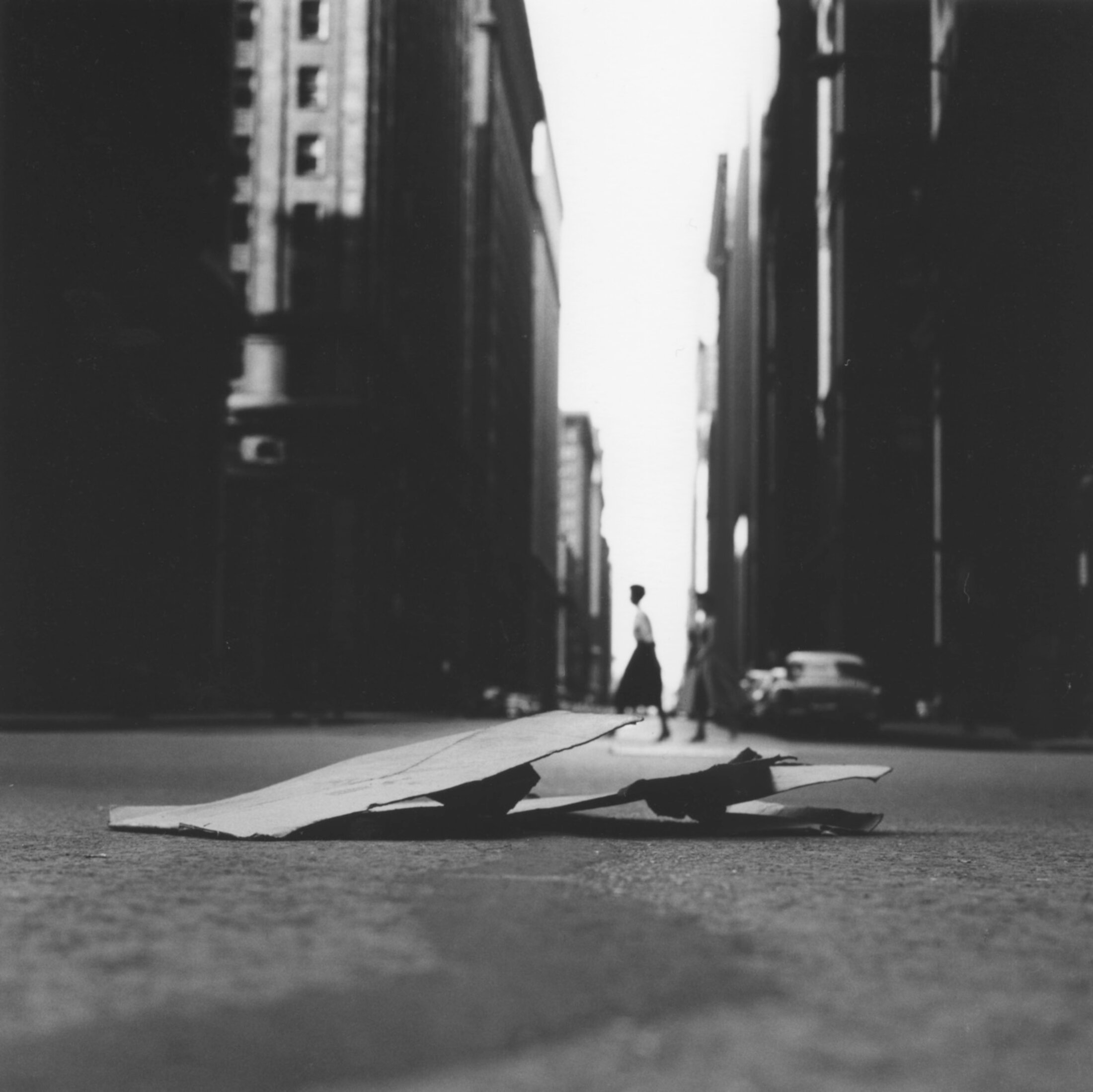 Peu connu en France, le travail exclusivement noir et blanc de Ray K. Metzler semble dominé par la géométrie comme en témoignent les lignes horizontales et verticales qui composent chacune de ses images de la ville dont les raies de lumière omniprésentes en font presque une signature. Le sens du détail, ici un pli de papier égaré sur l'asphalte d'une rue laisse deviner deux silhouettes féminines, renvoie au jeu formel que l'on trouve dans les compositions photographiques d'Harry Callahan et d'Aaron Suskind qui enseigne également à l'Institute of Design, ici réinterprété par Metzker.