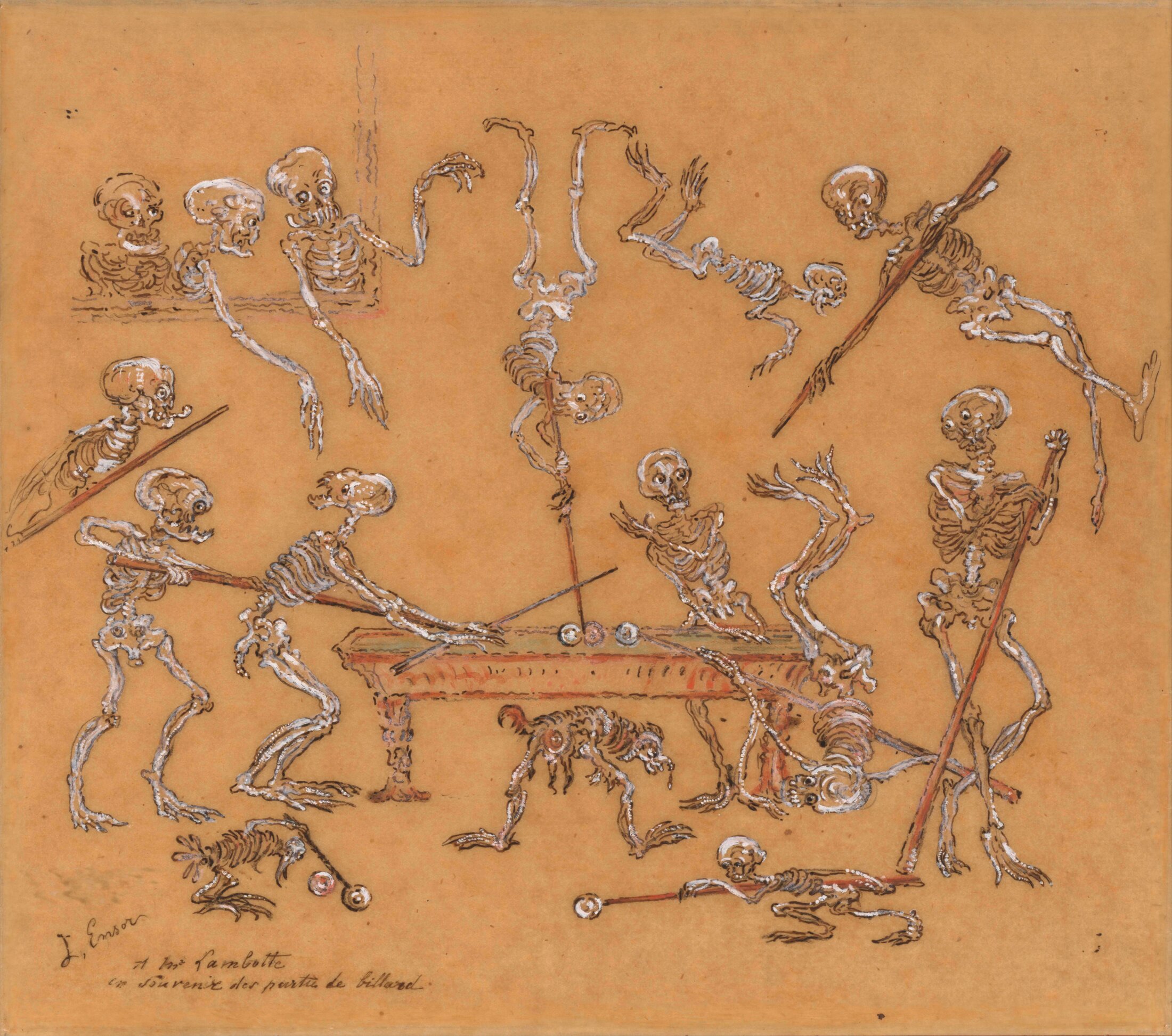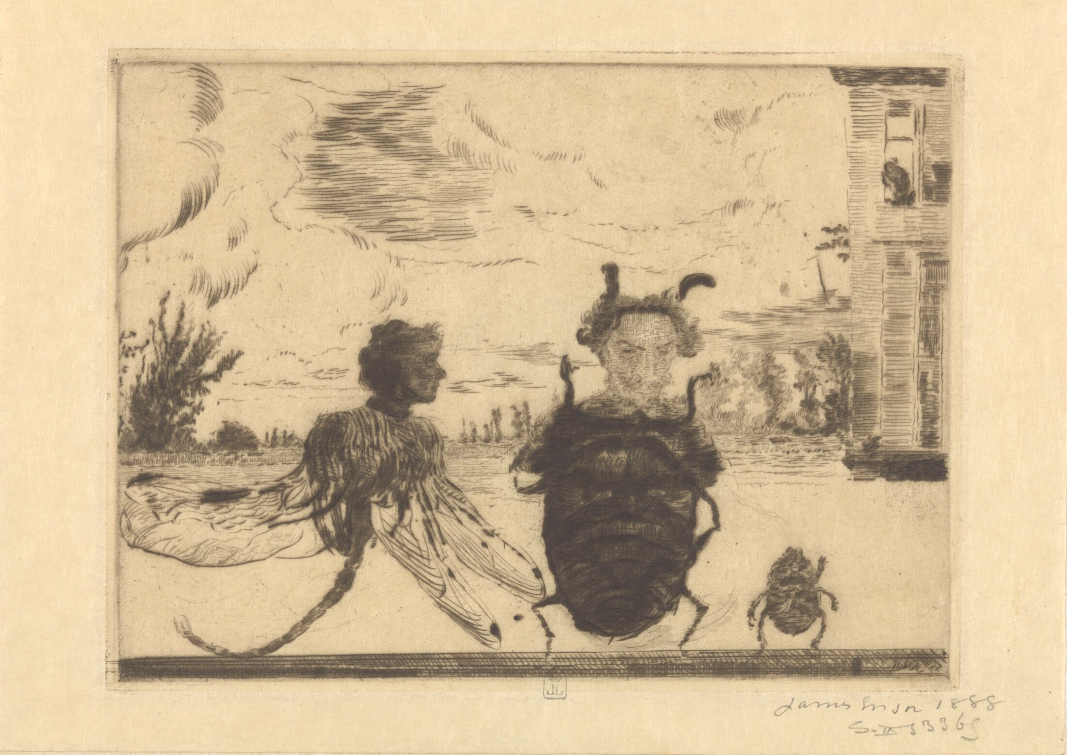 L’image est mise en regard avec son portrait squelettisé (1889) dans lequel il reprend la même pose. Comme sur la photographie, ses yeux fixent le visiteur. Au cours de sa vie, James Ensor réalise une centaine d’autoportraits, autant dire qu’il s’agit là d’un aspect essentiel de son œuvre. Ces représentations de soi en constituent le fil conducteur. Les squelettes font leur entrée dans son œuvre en 1887 et resteront un motif important, à l’image de « Squelettes se disputant un hareng saur » (v. 1891). L’évolution artistique d’Ensor se caractérise par une propension de plus en plus marquée au « spectacle ». Cette même année 1887, même s’il va demeurer fasciné par les effets multiples de la lumière, il abandonne définitivement sa facture du début des années 1880 au profit d’une transfiguration grotesque de la réalité qui va devenir sa signature et qui annonce déjà le Surréalisme. Ensor considère les Rousseau comme sa famille bruxelloise, le couple lui ayant, en outre, acheté de nombreuses œuvres de jeunesse, devenant son premier mécène. Il entretient une relation particulière avec Mariette. Bien qu’il ait déclaré que cette rencontre a été la plus importante de sa vie, nous ne saurons sans doute jamais s’il était amoureux d’elle en secret. Une pointe sèche de 1888, intitulée « Insectes singuliers », illustre néanmoins cette intense amitié. Ensor se représente en scarabée alors que Mariette est figurée en libellule regardant le scarabée. Le peintre fait référence à un passage du poème « Die Launen der Verliebten » de Henrich Heine, dans lequel un scarabée est amoureux d'une mouche. Dans un article[7] publié dans la revue La Plume en 1898, Blanche Rousseau, une cousine de la famille, raconte une rencontre chez les Rousseau, au cours de laquelle Ernest Rousseau junior a lu un passage du poème de Heine en présence d'Ensor : « Un souvenir heureux me ressuscite certain après-midi d’été où, sous l’ombrage d’un grand chêne de la forêt de Soignes, nous écoutâmes ensemble du Henri [sic] Heine. C’était avec mon cousin E[rnest Rousseau jr]. Je me souviens que nous avions couru comme des enfants, parié à qui arriverait le premier au bout du chemin. James avait improvisé brillamment un de ses contes vagues et décousus où les géants et les abbesses s’agitent fantastiquement dans un bruit de lances et l’éblouissement des dorures et des pierreries. [...] Mon cousin lisait haut les Caprices des amoureux : « Un scarabée se tenait sur une haie, triste et pensif ; il est devenu amoureux d’une mouche : ‘Ô mouche de mon âme, sois l’épouse de mon choix ! Épouse-moi, ne rejette pas mon amour, j’ai un ventre tout d’or’. Je me souviens du rire silencieux d’Ensor [...] d’une soudaine expression de joie moqueuse et satanique avec laquelle il soulignait le sens caché des phrases drôles d’une amère ironie ».