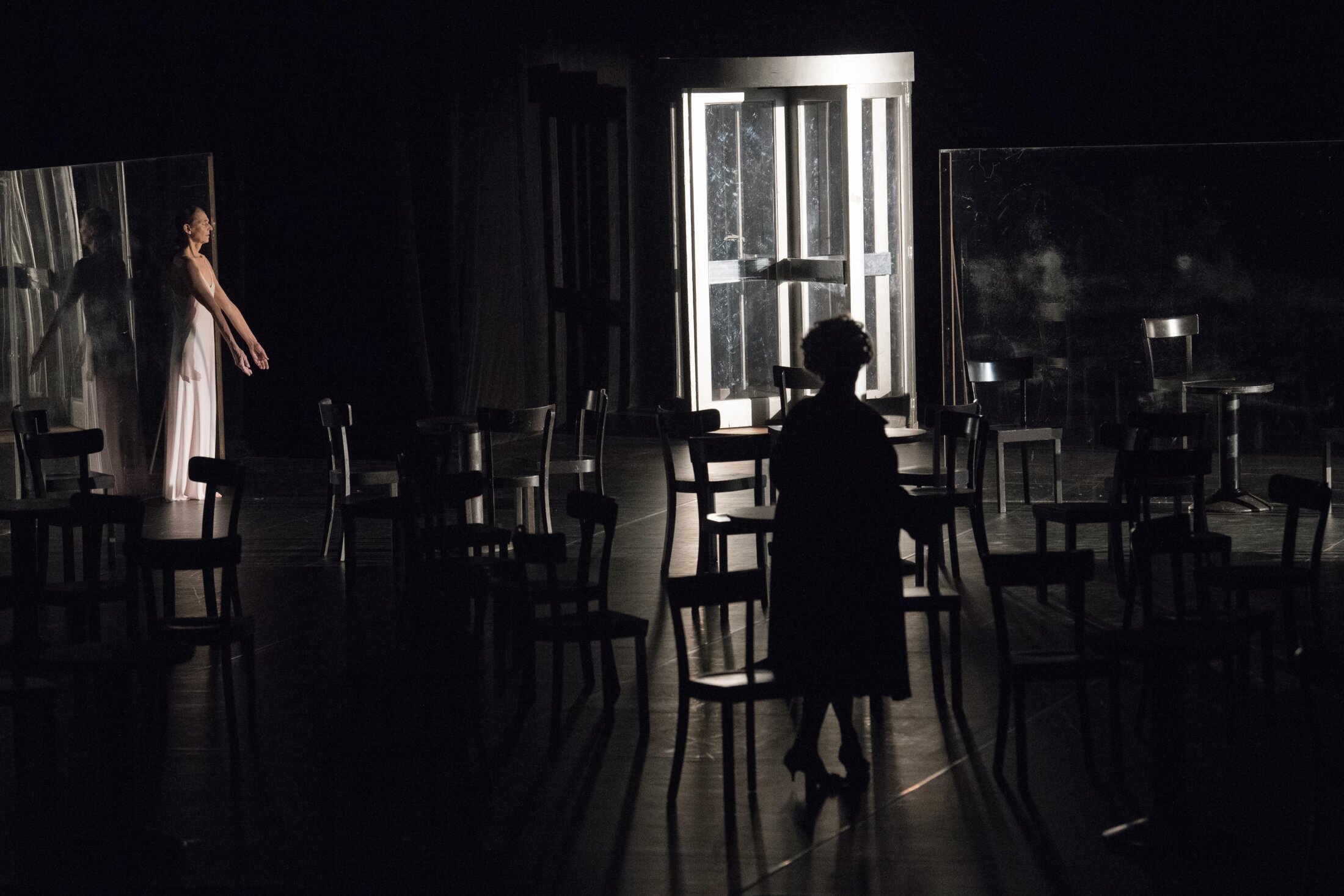 Des chaises, sur le plateau de la Grande Halle de La Villette, partout des chaises. Disposées autour de tables guéridons, elles saturent l’espace, lui donnant des allures de café-bar dans lequel on entre en tournant une porte-tambour. Trois grands murs de verre dans lesquels les interprètes vont bientôt se refléter, séparent l’intérieur de l’extérieur et viennent compléter le décor. Ils et elles sont déjà là lorsque le public prend place. On les devine debout sur les côtés ou bien assis en fond de scène, discrets, attendant. Au fond, côté jardin, les yeux fermés, la première esquisse quelques gestes, quelques mouvements dans le silence et la pénombre. Elle restera cantonnée à cet espace tout au long du spectacle. Puis, entre la deuxième, yeux clos également, bras tendus en avant du corps. Elle avance telle une somnambule, se cogne aux chaises, tombe, se relève, continue sa marche, traverse tant bien que mal le plateau, la salle du bar. Enfin, une troisième fait son entrée par la porte tambour. Les yeux sont bien ouverts cette fois. Cheveux courts roux, elle traverse la scène sur des escarpins roses. Sa façon d’avancer « au trot » trahit une certaine intranquillité. Elle tourne la tête à chaque instant, scrutant le moindre recoin, ce qui a pour effet de renforcer ce sentiment d’inquiétude. Lorsqu’elle quitte la scène retentit la musique d’Henry Purcell dont les Arias teintent d’emblée le spectacle d’une douce mélancolie. Un homme rejoint la deuxième, détourne les objets qui se trouvent sur son chemin, lui évitant chutes et chocs, prend soin. Peine perdue, elle ne le voit pas. Il sera supplanté par un autre sur lequel elle butera. Avec la complicité d’un troisième qui placera les bras de la jeune femme dormant autour du cou de l’obstacle devenu amant, lèvres contre lèvres, elle s’allongera dans ses bras d’où elle tombera inéluctablement avant de revenir l’embrasser, la scène se jouant et se rejouant de plus en plus vite comme si la chute devait être infinie, si la relation était impossible. On les reverra plus tard, couple passionnel se poussant à tour de rôle contre la paroi vitrée sur laquelle ils se fracassent, recommençant de plus en plus fort. Ni avec toi ni sans toi. Peut-on mourir d’aimer ?