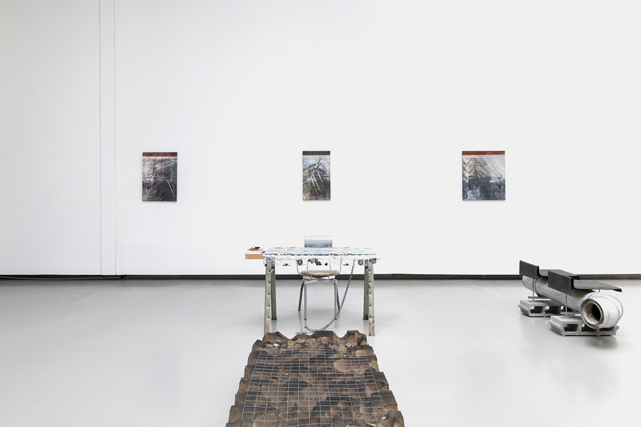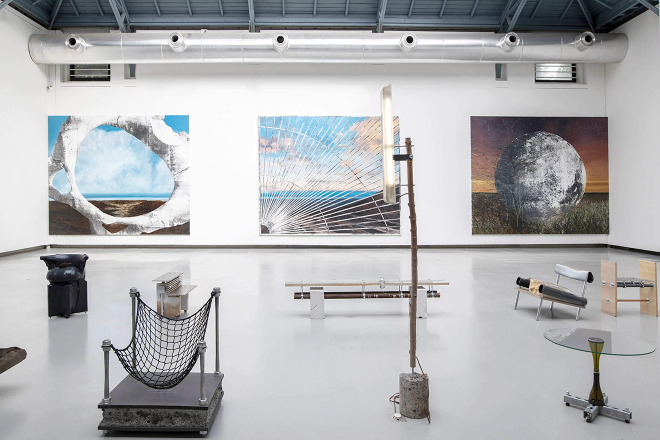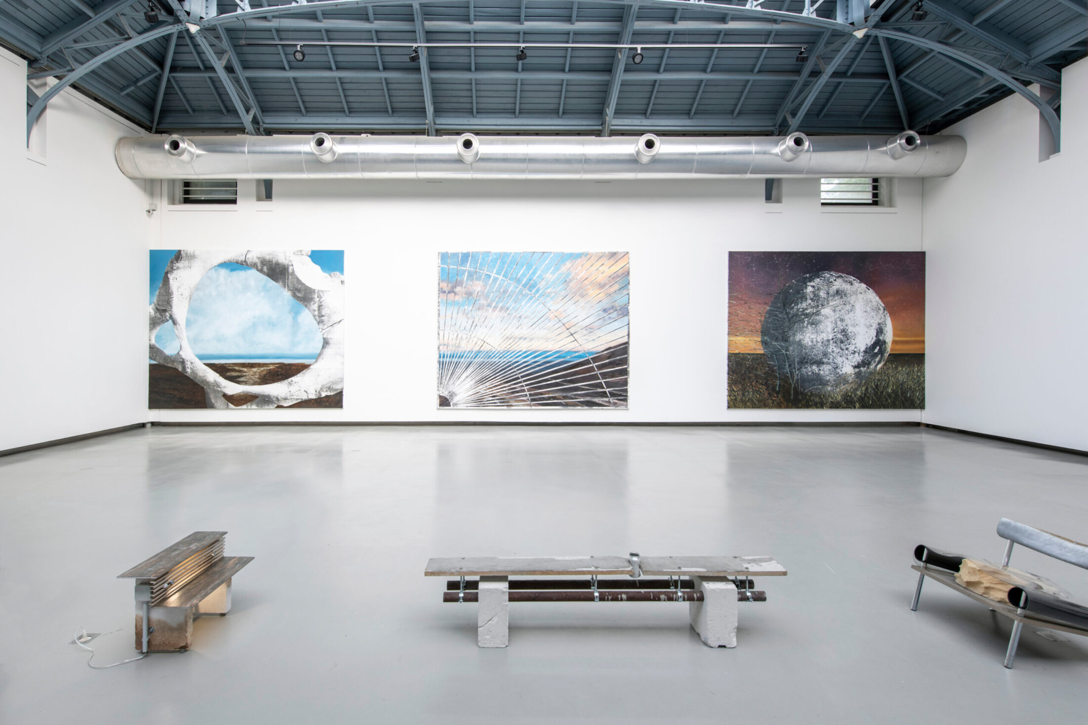 Joël Riff, fidèle à son concept de « solo show augmenté », enrichit l’exposition en plaçant les œuvres d’Eva Nielsen en dialogue avec trois contributions complémentaires. Une sculpture minimaliste de Charlotte Posenenske (1930-1985), composée de modules évoquant des éléments d’aération, introduit une réflexion sur la standardisation et la modularité, en écho aux questionnements de Nielsen sur la structure des espaces représentés. Le designer belge Arnaud Eubelen, quant à lui, apporte une dimension matérielle avec ses assises et ses luminaires fabriqués à partir de rebuts urbains – vieux matelas, grilles, tuyaux d’aération. Ces objets, à la fois fonctionnels et sculpturaux, résonnent avec les toiles d’Eva Nielsen par leur capacité à transformer le rebut en poésie et à faire des marges un lieu de création. Enfin, un texte commandé à l’agence de paysage Établissement, fondée par Annabelle Blin, invite à repenser notre rapport aux territoires, en écho à la fascination de Nielsen pour les espaces périphériques. Ce dialogue interdisciplinaire, loin d’être anecdotique, amplifie la portée des œuvres d’Eva Nielsen. La sculpture de Posenenske, avec sa rigueur géométrique, contraste avec la fluidité des toiles, tandis que les objets d’Eubelen, par leur matérialité brute, font écho à la physicalité des paysages peints. Le texte d’Établissement, quant à lui, agit comme un contrepoint conceptuel, proposant une lecture écologique et philosophique des territoires représentés. Ensemble, ces contributions créent un écosystème visuel et intellectuel qui invite le visiteur à questionner sa propre perception du monde.
