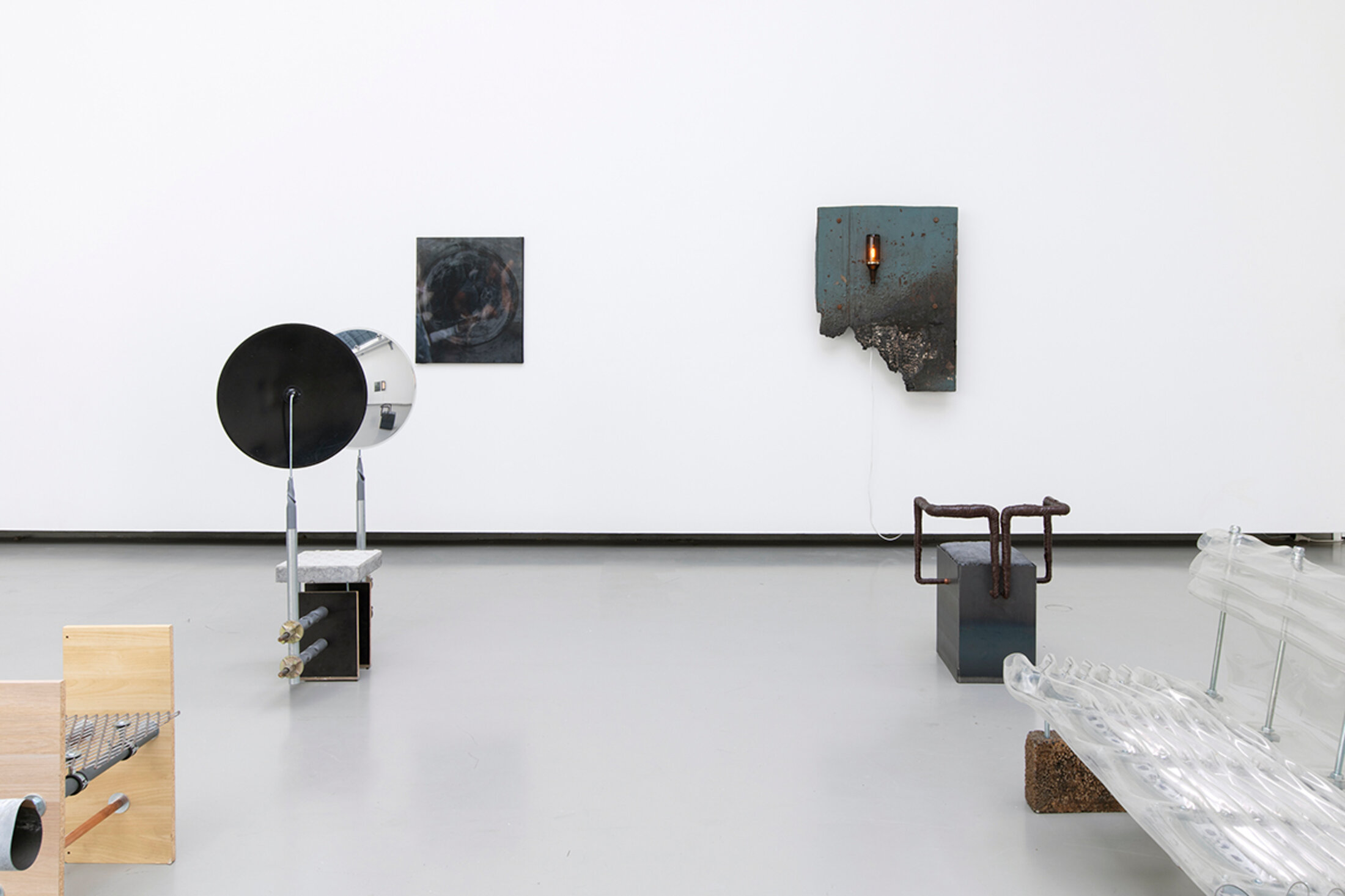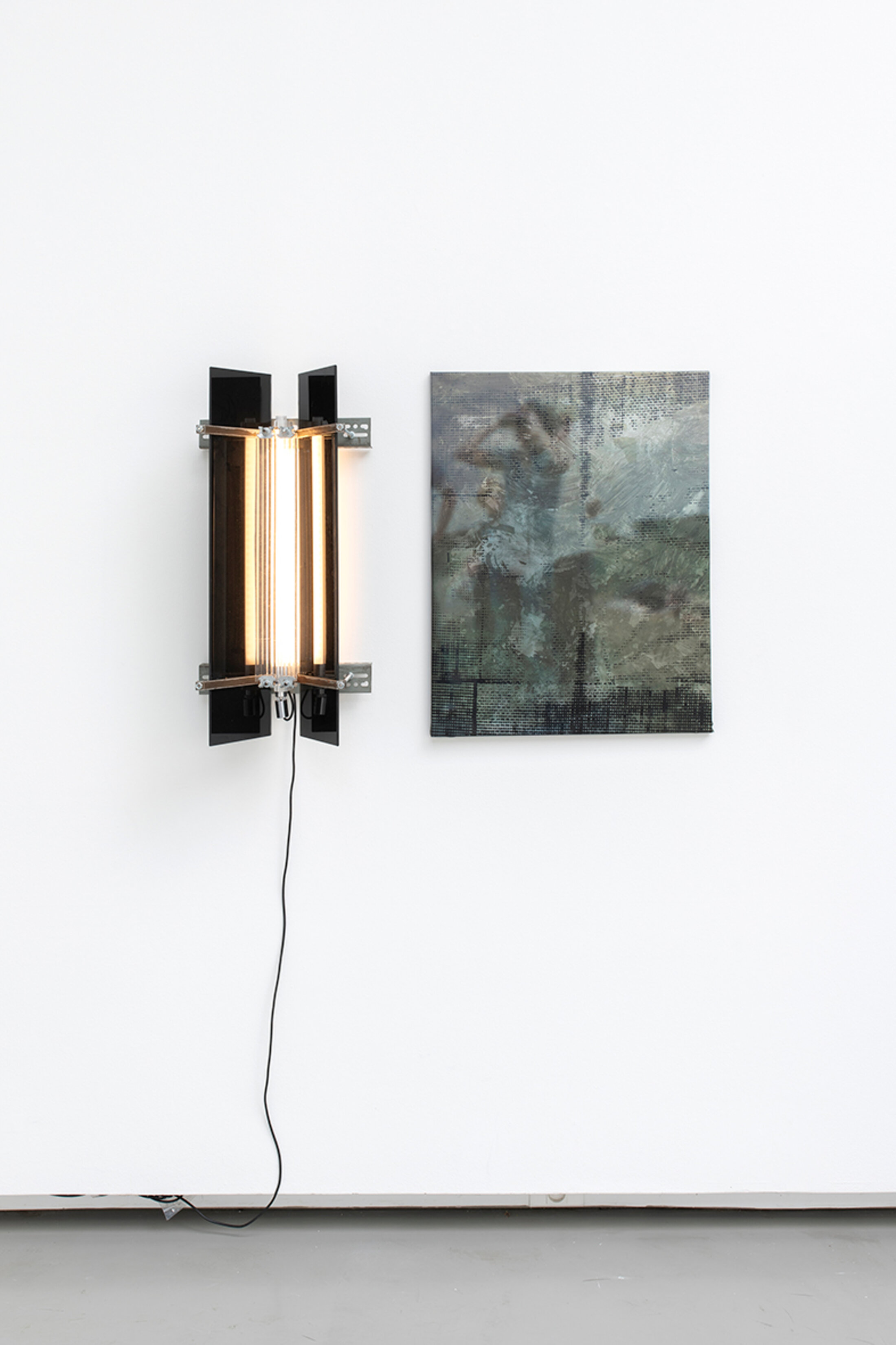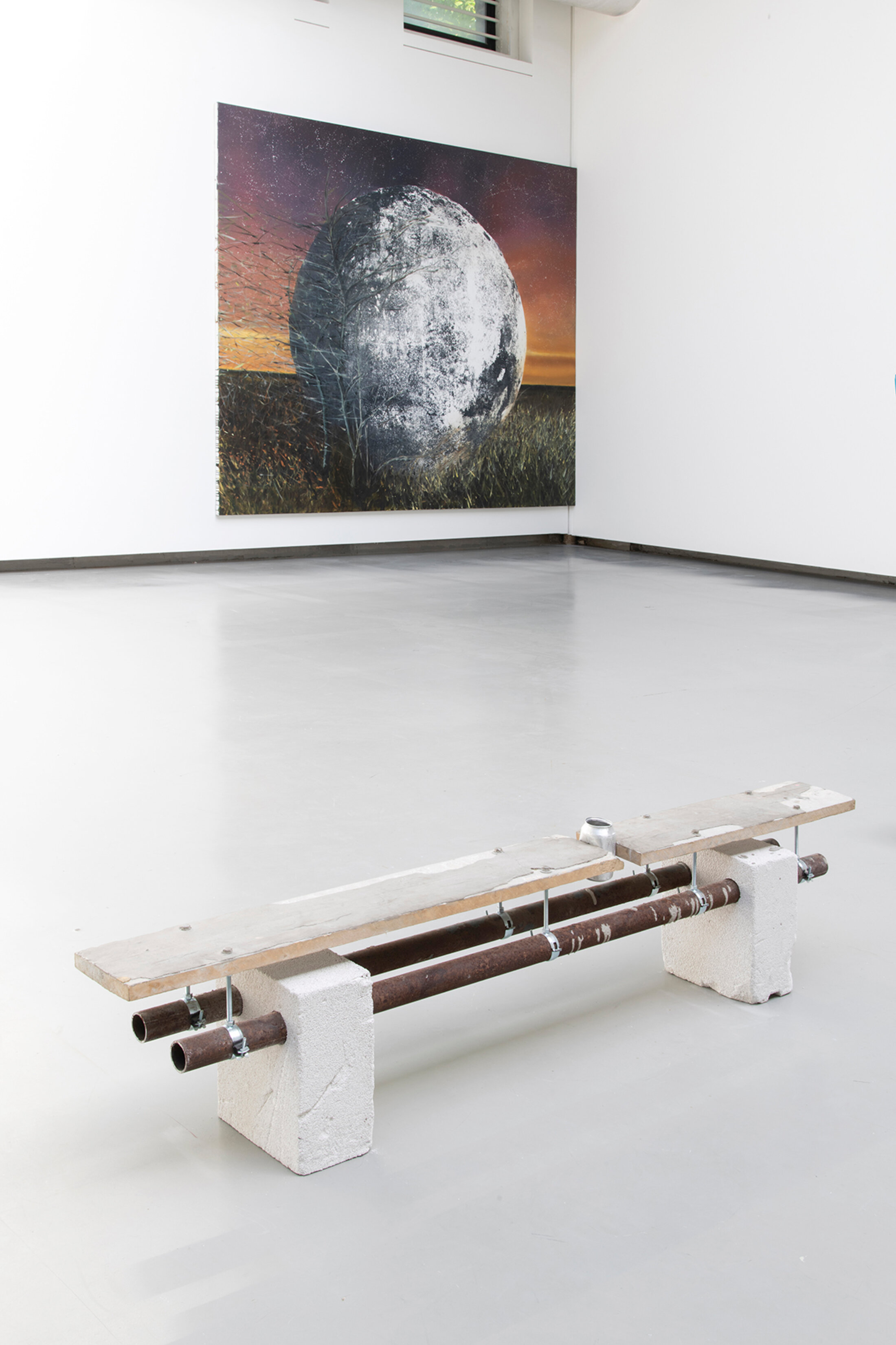 Joël Riff, fidèle à son concept de « solo show augmenté », enrichit l’exposition en plaçant les œuvres d’Eva Nielsen en dialogue avec trois contributions complémentaires. Une sculpture minimaliste de Charlotte Posenenske (1930-1985), composée de modules évoquant des éléments d’aération, introduit une réflexion sur la standardisation et la modularité, en écho aux questionnements de Nielsen sur la structure des espaces représentés. Le designer belge Arnaud Eubelen, quant à lui, apporte une dimension matérielle avec ses assises et ses luminaires fabriqués à partir de rebuts urbains – vieux matelas, grilles, tuyaux d’aération. Ces objets, à la fois fonctionnels et sculpturaux, résonnent avec les toiles d’Eva Nielsen par leur capacité à transformer le rebut en poésie et à faire des marges un lieu de création. Enfin, un texte commandé à l’agence de paysage Établissement, fondée par Annabelle Blin, invite à repenser notre rapport aux territoires, en écho à la fascination de Nielsen pour les espaces périphériques. Ce dialogue interdisciplinaire, loin d’être anecdotique, amplifie la portée des œuvres d’Eva Nielsen. La sculpture de Posenenske, avec sa rigueur géométrique, contraste avec la fluidité des toiles, tandis que les objets d’Eubelen, par leur matérialité brute, font écho à la physicalité des paysages peints. Le texte d’Établissement, quant à lui, agit comme un contrepoint conceptuel, proposant une lecture écologique et philosophique des territoires représentés. Ensemble, ces contributions créent un écosystème visuel et intellectuel qui invite le visiteur à questionner sa propre perception du monde.