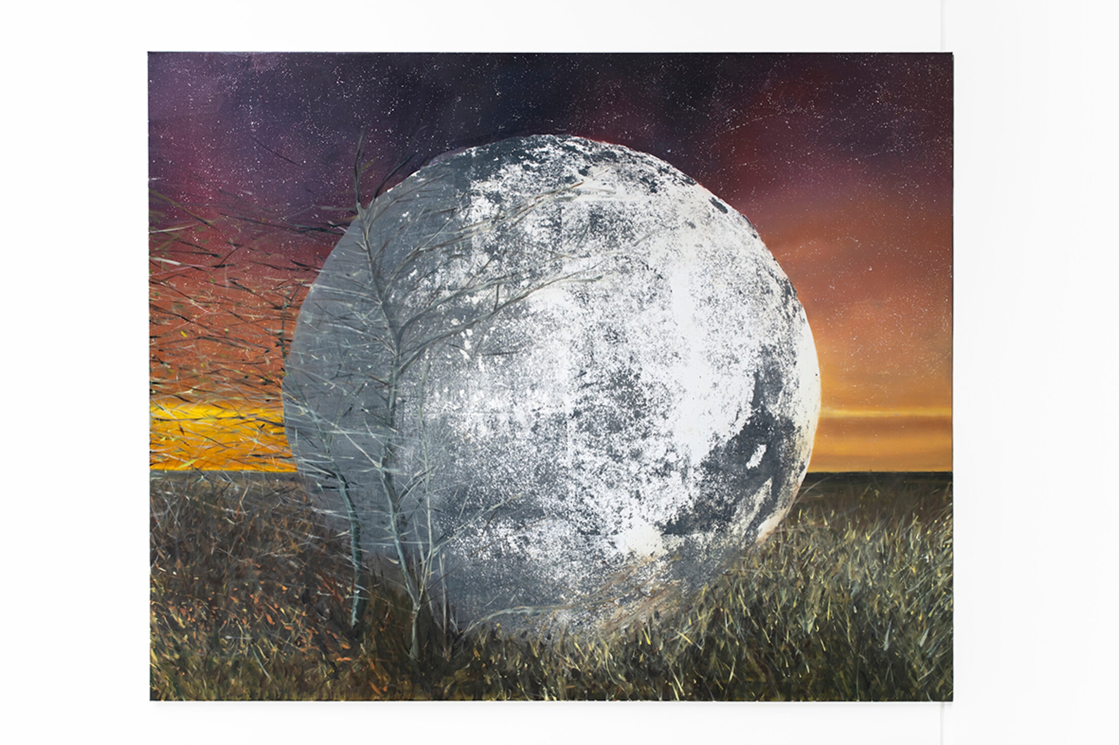 L’exposition propose une réflexion sur le trouble, l’érosion et la mémoire. Les toiles de Nielsen, avec leurs tonalités parfois apocalyptiques, interrogent la coexistence entre l’humain et le vivant. Les petites peintures, montrant des chaises comme englouties dans des eaux stagnantes, évoquent une fragilité du quotidien, écho aux souvenirs intimes qui s’effacent sous l’effet du temps. Cette dimension mémorielle, que l’on retrouve également dans son exposition « Alluvion[2] » bientôt à l’Abbaye de Fontevraud, témoigne de l’engagement de Nielsen à tisser des liens entre le présent et le passé, entre la perception et la projection. Le titre « Aster »,avec ses connotations d’éblouissement et de paysage fantasmé, traduit parfaitement cette ambition. Comme l’explique l’artiste, il s’agit de suggérer « un éblouissement dans le sens visuel, une persistance rétinienne », mais aussi un paysage intérieur, métaphysique, qui échappe aux catégories de la dystopie. Cette idée de persistance rétinienne, héritée de la photographie, trouve un écho dans la manière dont les toiles d’Eva Nielsen s’impriment dans l’esprit du spectateur, laissant une trace durable, émotionnelle.