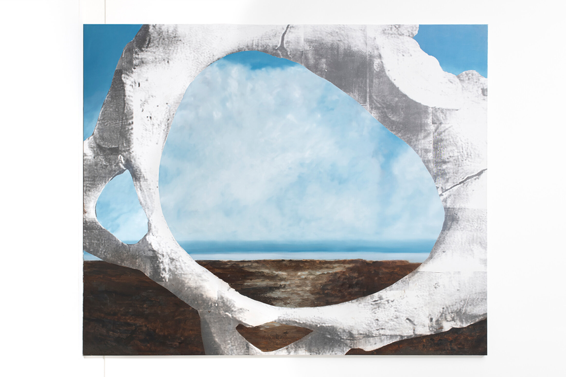 Les toiles exposées ici se distinguent par leur capacité à troubler le visiteur. Les paysages représentés, souvent inspirés de zones marginales comme les friches industrielles ou les marais de Camargue, ne se livrent pas immédiatement. Ils oscillent entre le familier et l’étrange, entre le tangible et l’onirique. Cette ambiguïté est renforcée par des superpositions de trames et de textures, dans lesquelles la photographie, agrandie ou masquée par des rubans adhésifs, dialogue avec des aplats de peinture en gris et blanc. L’œuvre semble ainsi à la fois émerger et se dissoudre, comme si le paysage était saisi dans un état de mutation perpétuelle. Cette approche évoque les expérimentations de Sigmar Polke, que Nielsen cite comme une influence, mais aussi l’immersion sensorielle des paysages d’Edvard Munch ou la sensibilité photographique de Georgia O’Keeffe.