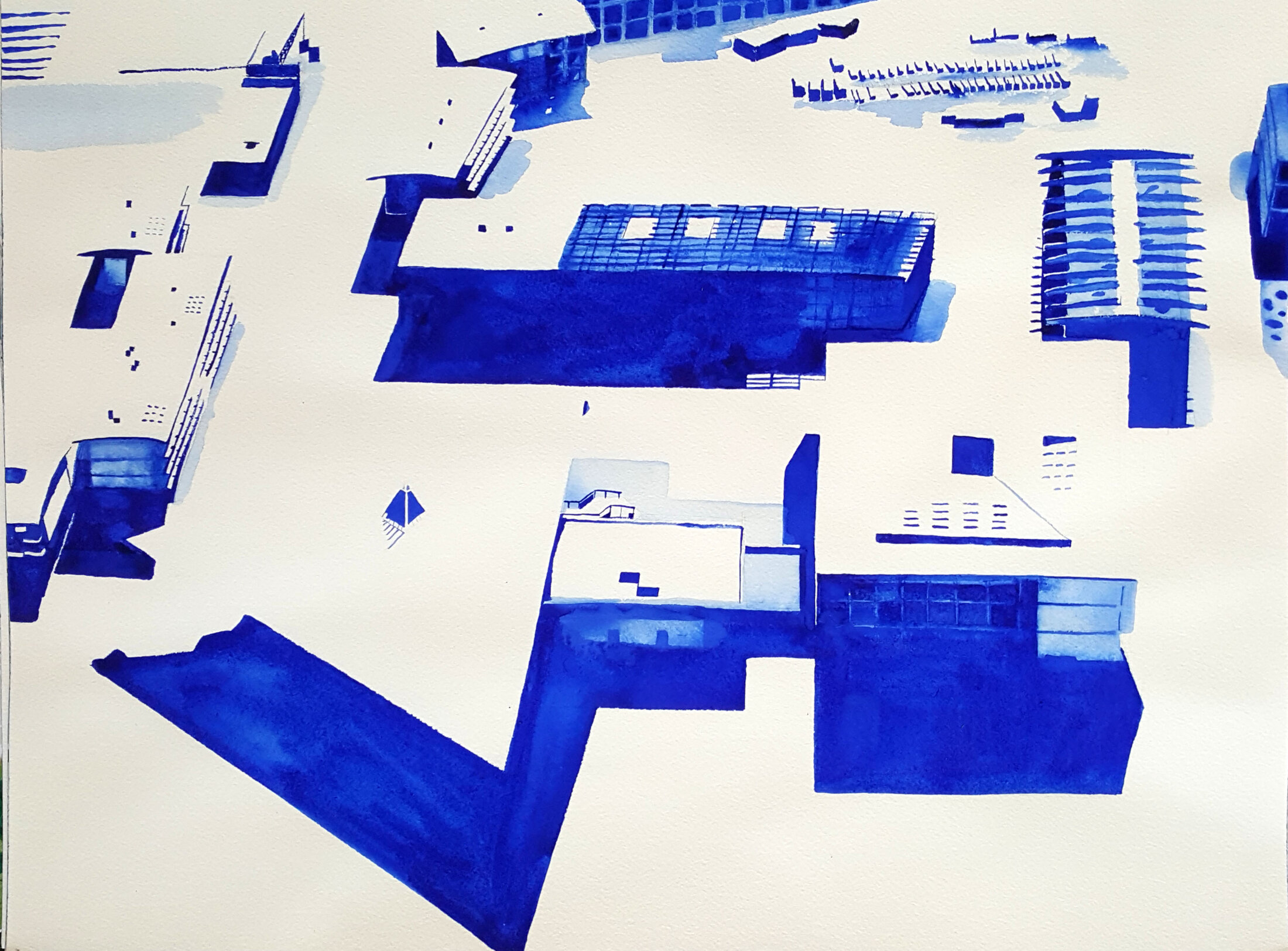 La série d’aquarelles réalisées par Erwan Venn est le résultat de ces mois de résidence. L’artiste travaille sur les documents qui l’ont fait réagir. Le choix pour la tonalité de la sérié du blanc et d’un bleu proche du bleu Klein, « Ultramarine Deep », renvoyant à un futur radieux, s’est imposé à lui à partir de « Zone de vie avril 1966 », aquarelle dans laquelle il applique ce bleu en délimitant de vastes espaces blancs pour les toitures. Auparavant, les images d’archives le renvoyaient invariablement au passé colonial de la France. À partir de 1966, le programme spatial propose d’oublier le passé pour se tourner résolument vers l’avenir, même si l’existence même du territoire de Guyane incarne un fantôme colonial. Il va jusqu’à reprendre les aquarelles déjà réalisées pour les retravailler dans cette tonalité. « Dans ma série, le bleu désigne moins l'Espace, qui est noir, que le programme spatial lui-même, qui colonise progressivement les couleurs originelles du territoire guyanais. Ainsi, la nature est figurée en vert au début de la série, le chantier, en jaune[7] » précise-t-il. La technique de l’aquarelle est quant à elle retenue dès le départ tant elle s’oppose, par son trait tremblant, sa matérialité d’eau, sa lenteur, sa fragilité, à la toute-puissance du sujet qu’elle représente. Les archives, dont il prend connaissance au fur et à mesure, sont elles-mêmes sous-tendues par un récit, celui de l’invention du CSG, le début de la construction de l’infrastructure. L’histoire de Kourou est ici traversée par le regard de l’artiste.