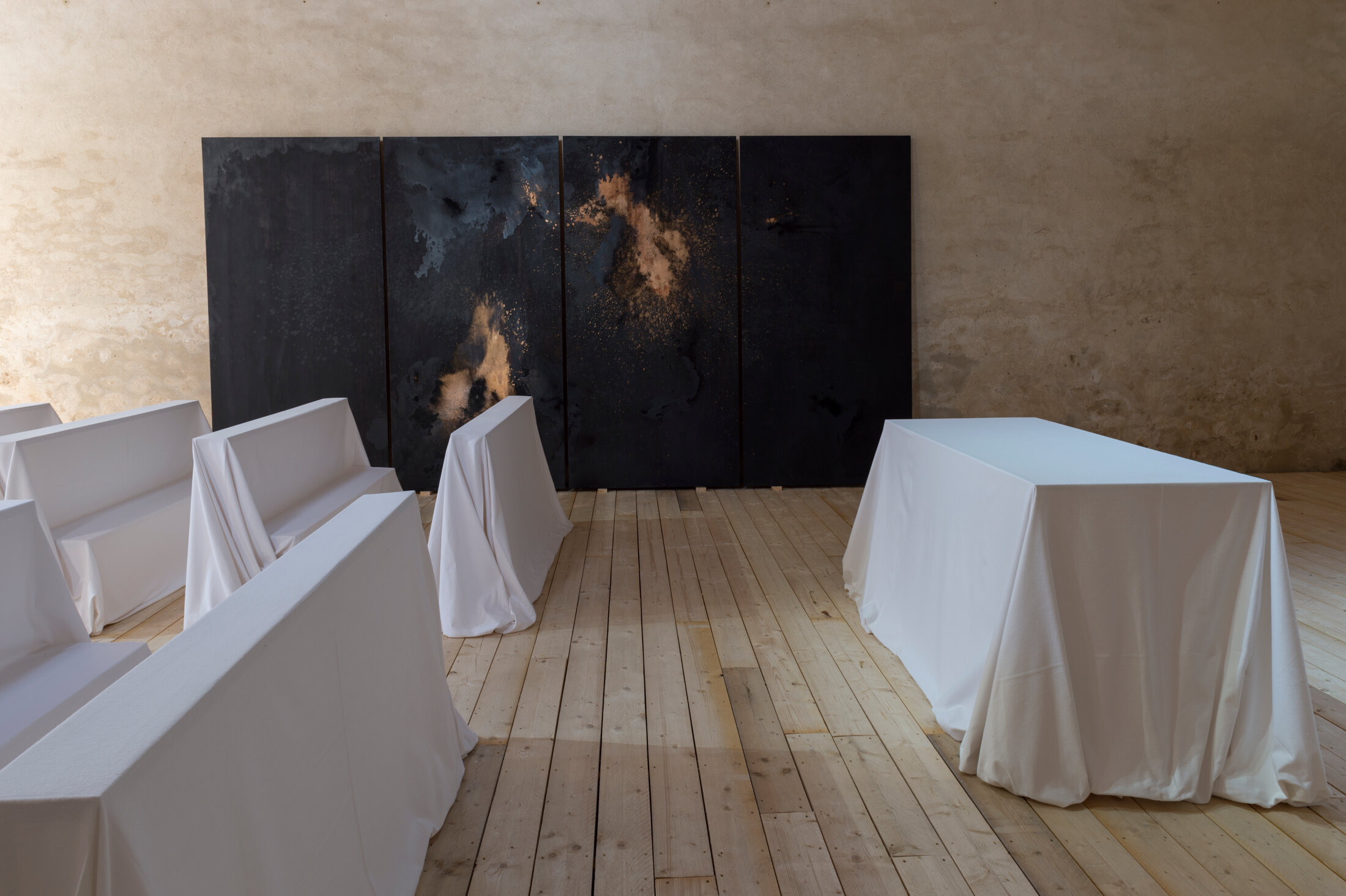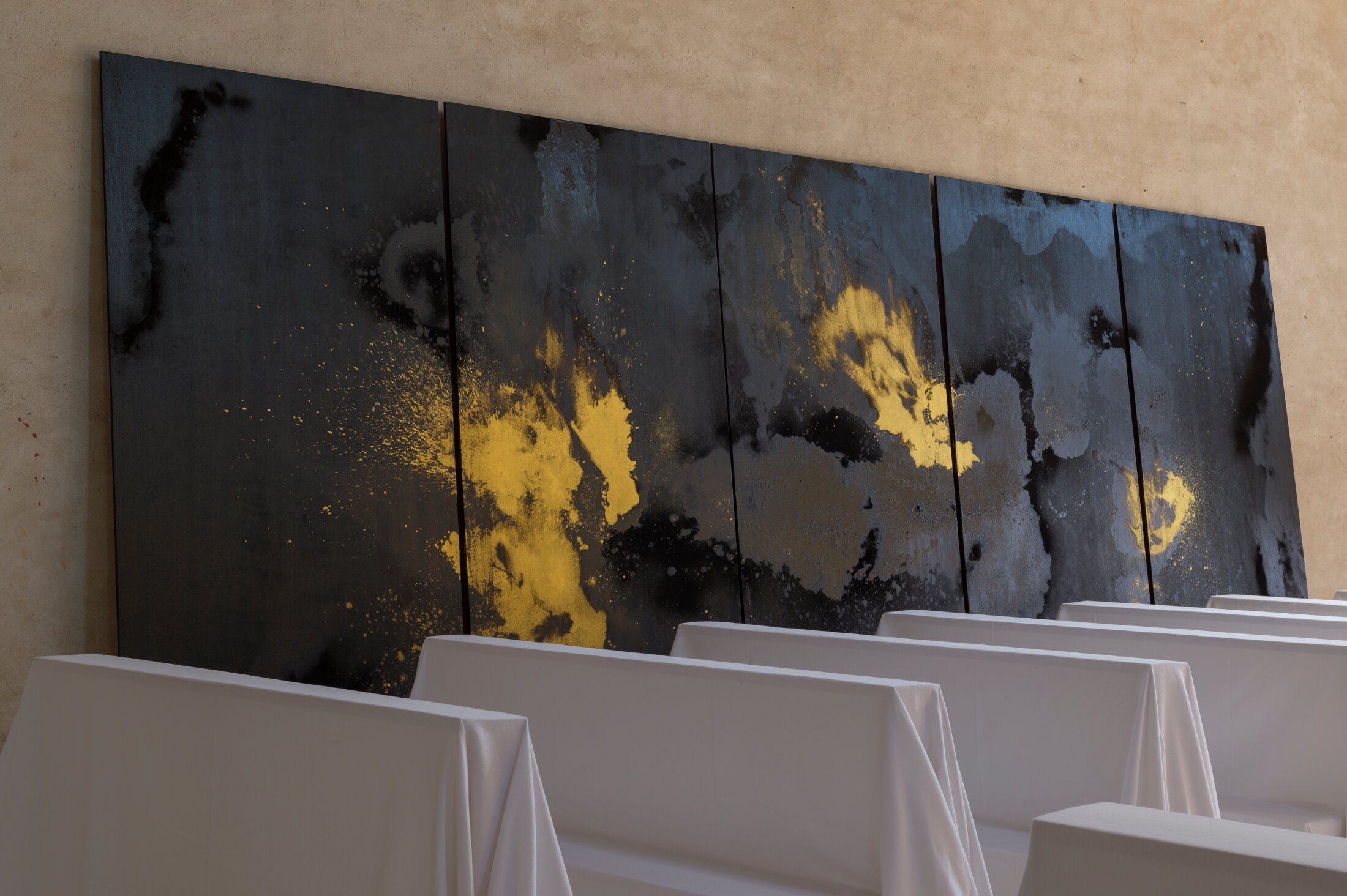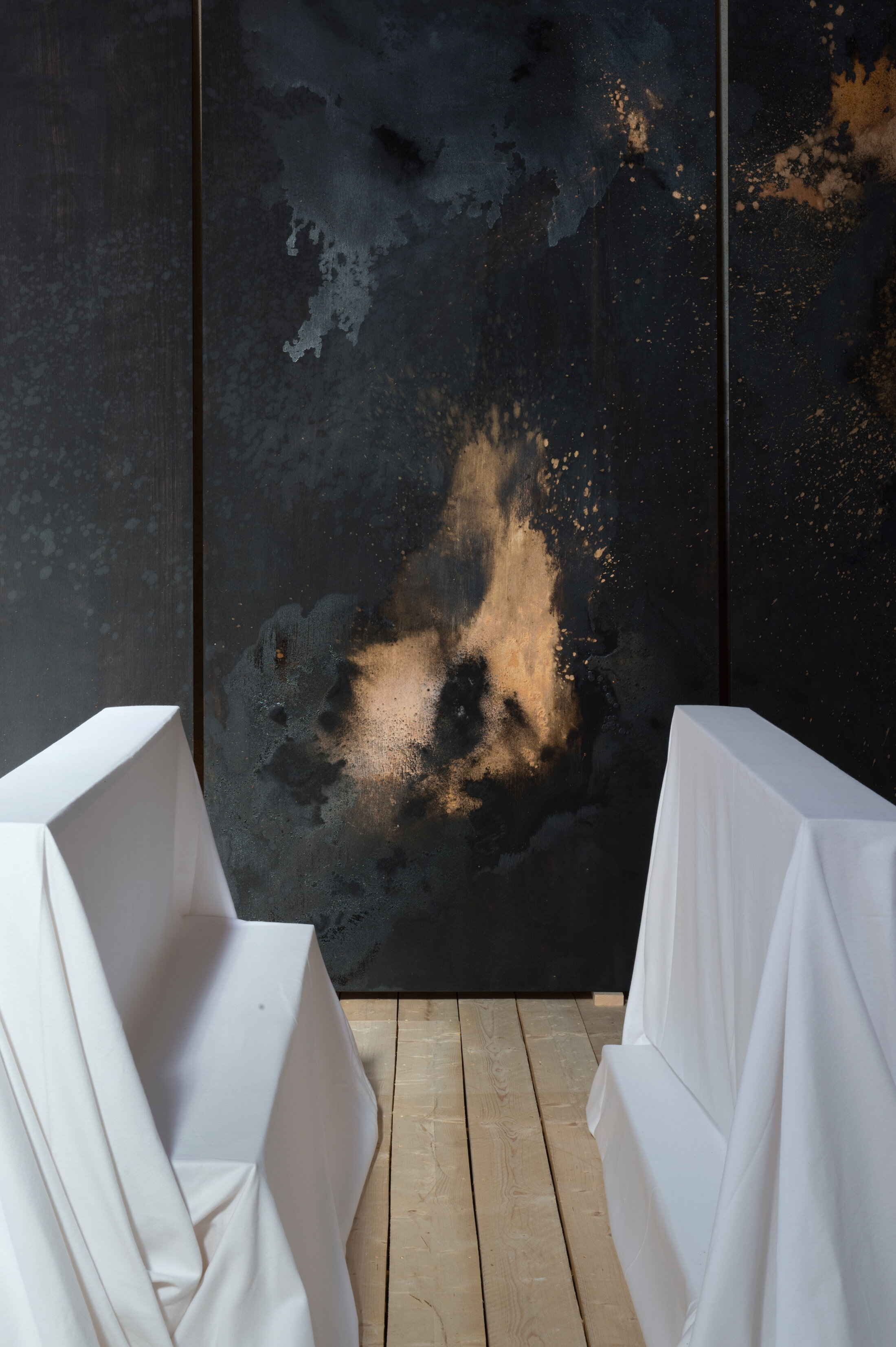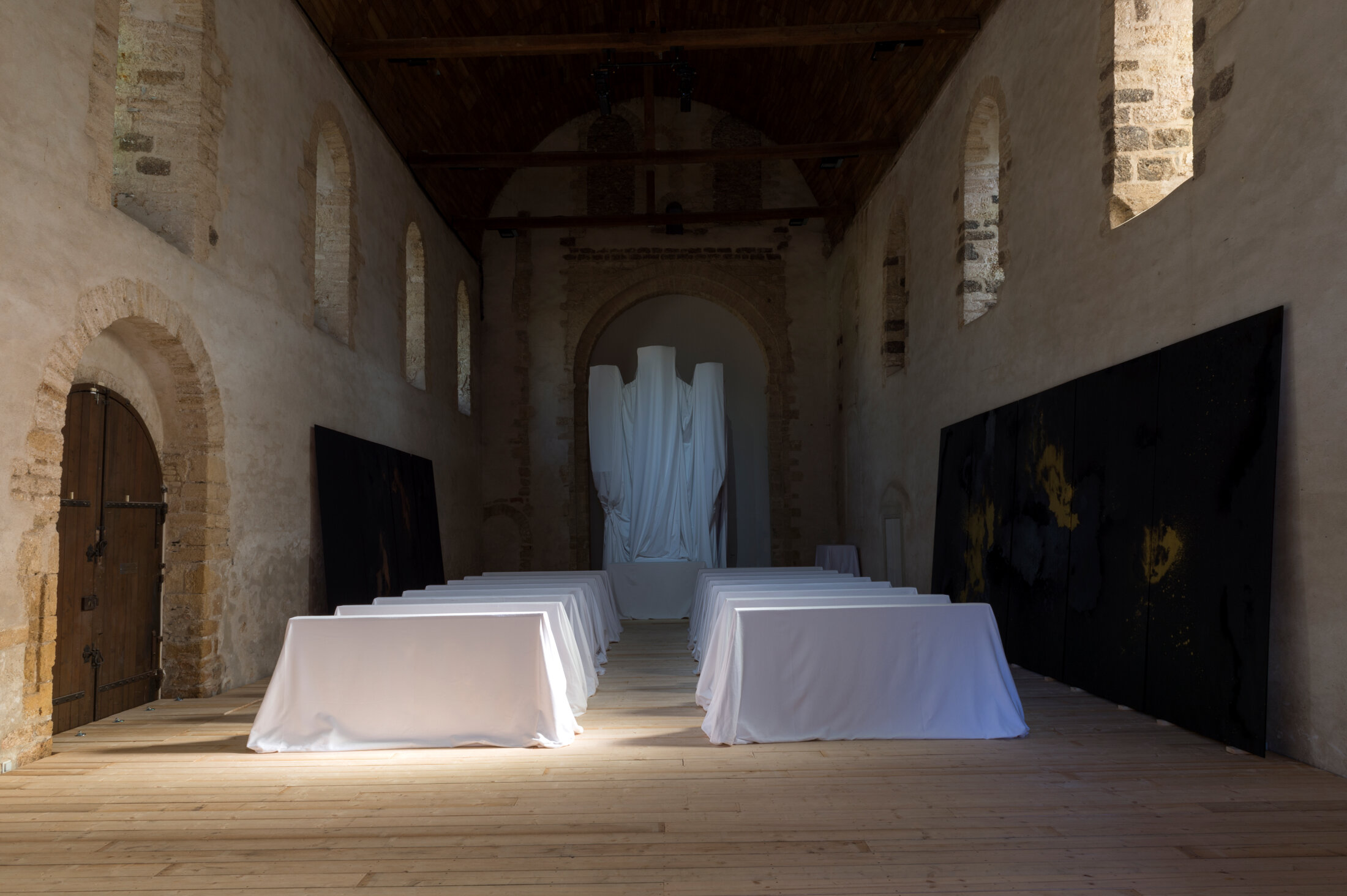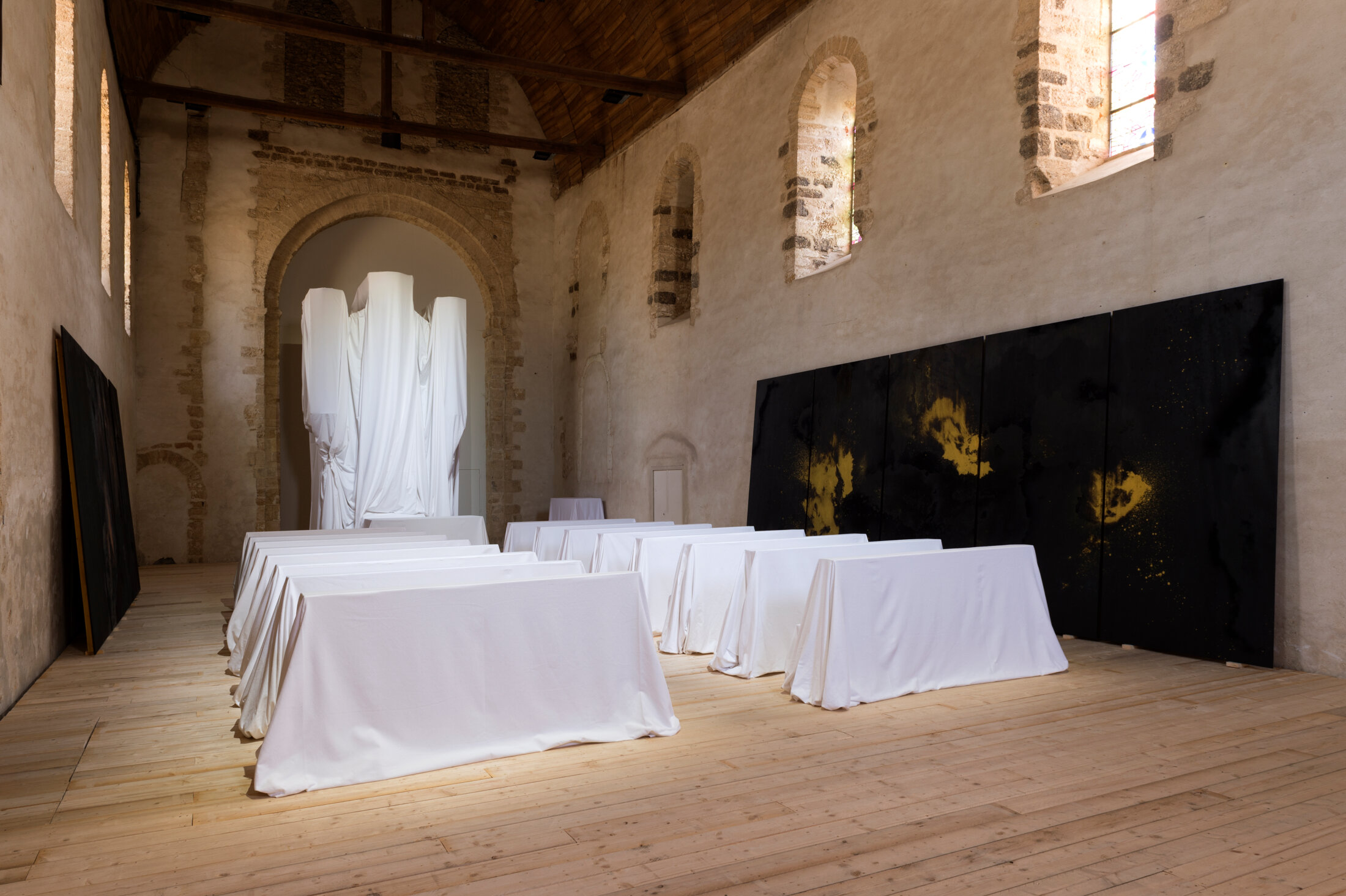 L'une des fonctions premières de l'orgue est de ramener de la verticalité dans une composition dominée par l'horizontalité des bancs et des toiles qui leur sont perpendiculaires. De part et d'autre des murs latéraux, de grandes peintures à l'huile sur panneaux de peuplier dévoilent leur côté fantomatique qui renforce un peu plus encore l'atmosphère onirique dans laquelle est précipité le visiteur. Dominique Blais joue sur la circulation intérieure de la chapelle, en inventant une nouvelle déambulation, contrainte par le simulacre de mobilier, afin que le visiteur éprouve physiquement sa présence, le rendant ainsi tangible. Il suscite l'illusion collective en donnant une forme rien qu'avec les drapés qui se révèlent leurres. Les deux peintures sont composées de plusieurs panneaux, références explicites aux polyptyques que l'on trouve dans les églises chrétiennes (catholiques après le Concile de Trente). Elles sont exécutées à l'huile et font partie de la série intitulée "la dynamique des fluides" que l'artiste débute en 2018 en s'attachant à reproduire un principe de tâches aléatoires, reprenant le concept des flaques d'huile que l'on trouve dans la rue. Elles sous-tendent l'idée d'une temporalité incomplètement maitrisée. Dominique Blais utilise de l'essence de térébenthine qui, amalgamée à du bitume de Judée, donne un noir assez profond, citation directe aux peintures de Delacroix ou de Courbet. Les célèbres artistes utilisaient ce même procédé, qui, avec le temps, vient altérer les autres pigments, en ternit la couleur. Il est ici appliqué au pinceau, avant que ne soit versé l'huile de lin et l'essence de térébenthine, pigments traditionnels de la peinture à l'huile. L'artiste questionne le hasard. Comment la peinture va-t-elle émerger ? C'est précisément l'idée de la dynamique des fluides : la fluidité de la matière qui va se répandre en différents paramètres, renvoyant à une dimension cosmique, à l'infiniment grand. Les toiles ne reçoivent pas d'éclairage direct. L'artiste a privilégié le jeu de la lumière naturelle à travers les vitraux. La perception visuelle varie donc en fonction des variations climatiques extérieures et des heures du jour. Un côté spectral émerge des parties plus diffuses. La peinture à l'huile est travaillée assez vite, alors que traditionnellement elle demande un temps bien plus long.