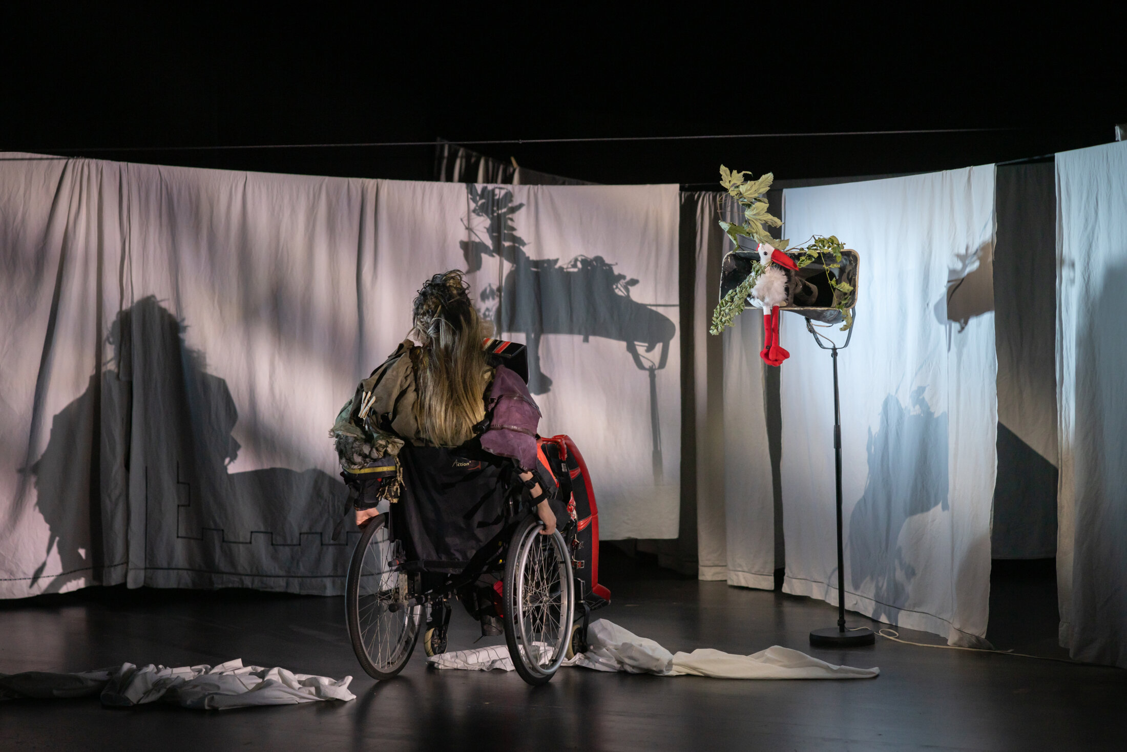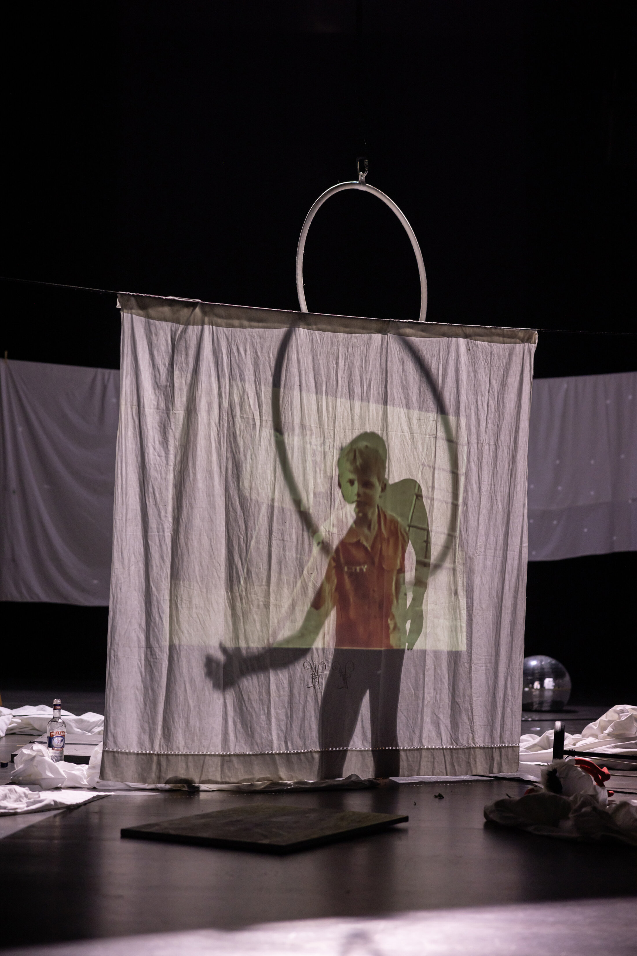Partout, de grands draps blancs suspendus à des cordes à linge. Ils servent de toile de fond multifonctionnelle à ce qui vient, évoquant à la fois la banalité domestique d’une maison familiale et les voiles de la mémoire, le linge qui sèche et les fantômes cachés derrière. Plus tard, il se feront écrans de projection, passeurs d’ombres. Pour l’instant, ils cloisonnent l’espace scénique comme autant de murs qui séparent. Tout débute par la projection d’un film en Super 8[1] datant de 1979 et mettant en scène Dominique et Yannick Doré, les parents de Dimitri Doré. Ce film muet capture, dans une esthétique amateure et un brin nostalgique, une journée ordinaire dans la vie d’un jeune couple dans les années soixante-dix. Visuellement, les images granuleuses aux couleurs fanées envahissent les draps, créant une atmosphère vintage intime, comme un souvenir familial exhumé d’un grenier. La scène est ponctuée d’un monologue ironique narré par une cigogne – cette figure mythique des naissances et des adoptions –, qui interroge avec humour la notion de parentalité. Des réflexions absurdes sur le rôle des oiseaux dans la livraison des bébés servent de métaphore légère mais grinçante pour introduire le thème de l’adoption. Dans la semi-obscurité, deux voix off émergent, celles d’un homme et d’une femme qui dialoguent, celles d’un couple que l’on ne verra pas, les parents de Dimitri. Ils remplissent un dossier d’adoption, répondant aux questions autant qu’ils les commentent. Ce qu’il faut dire et ne faut pas dire. Une conversation pleine d’incongruités bureaucratiques qui soulignent l’absurdité de la procédure administrative face à la réalité de la vie quotidienne. À la question : « Êtes-vous prêts à adopter un enfant à problèmes ? » Ils balbutient, laissant échapper leurs hésitations comiques sur les cases à cocher, les motivations profondes et les craintes sous-jacentes.