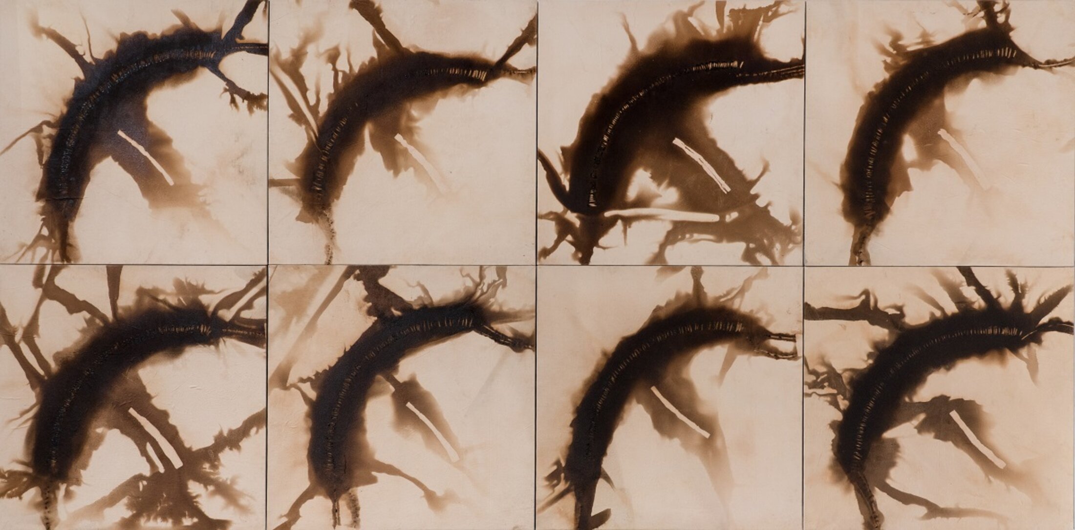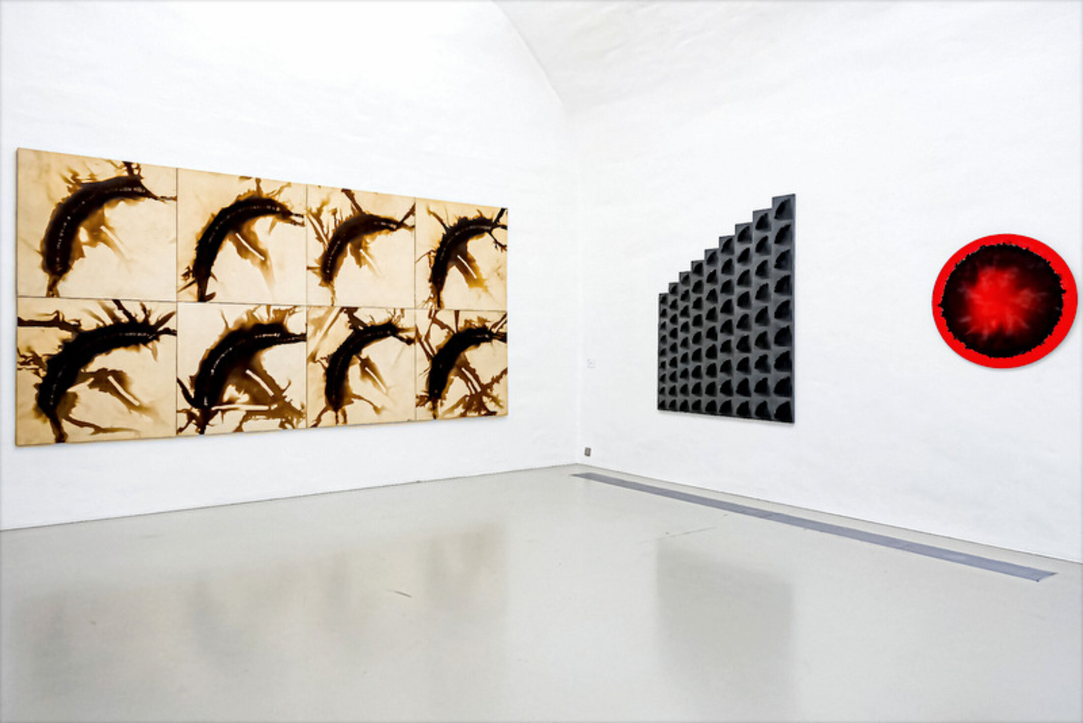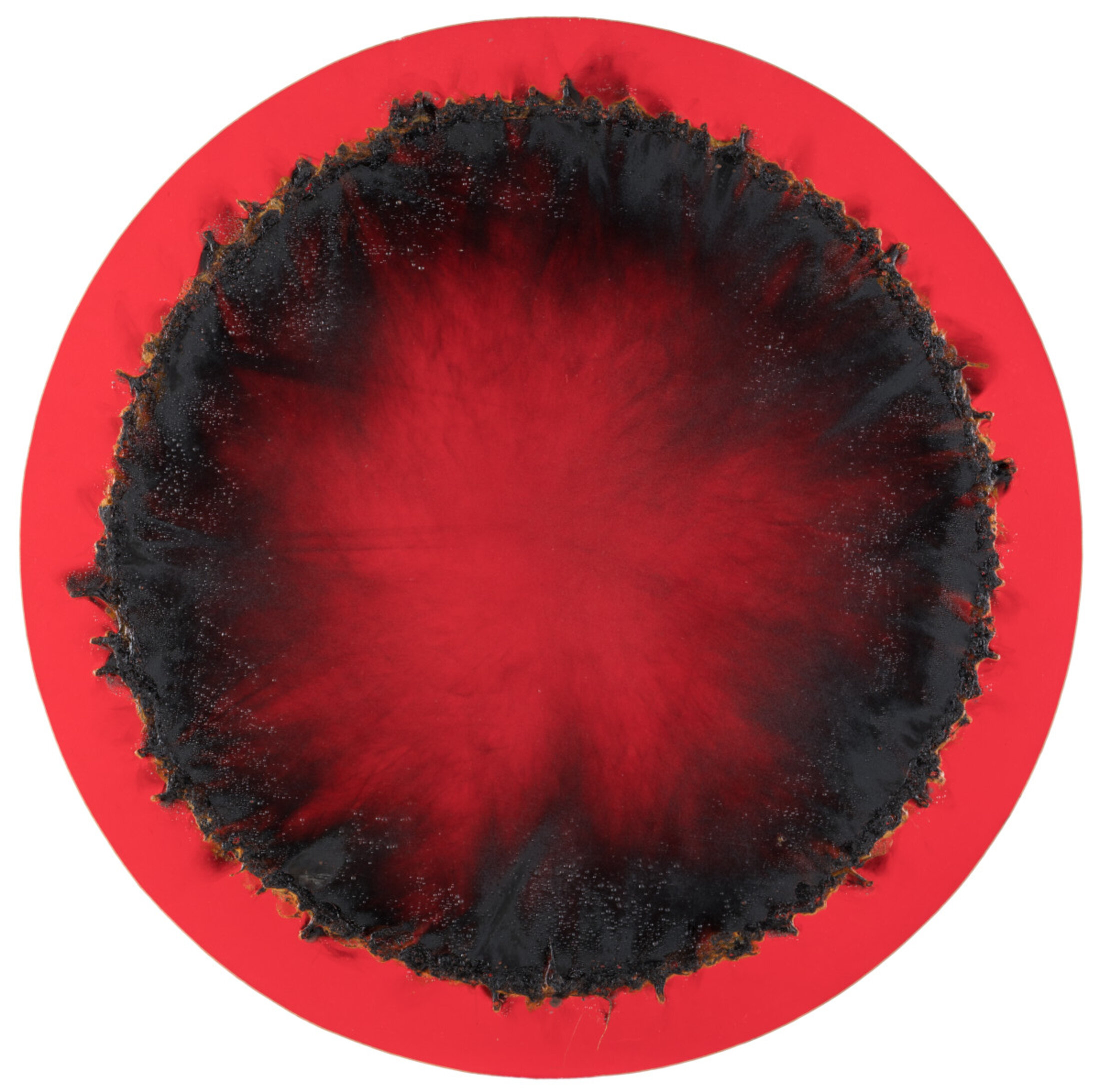 La salle suivante présente un ensemble de polyptyques, datés des années quatre-vingt et quatre-vingt-dix, dans lesquels l’artiste reproduit le même geste, le même protocole, sur chacun des panneaux, qu’il use de gel thermique – résine très inflammable – ou de la mèche lente. La répétition des modules semble à la fois identique et différente. En 1984, lors d’un séjour en Italie, Christian Jaccard entame une série autour de ce qu’il appelle le « Rouge émis » en référence à une éruption volcanique du Vésuve, d’où est issu le « Tondo BRN 04 » (1991). Par sa forme et sa couleur, le tableau associe la combustion à des évocations symboliques. Très en vogue à la Renaissance, les tondi sont associés au concept de perfection totalisante, faisant aussi référence aux miniatures et aux camés. Christian Jaccard a de plus en plus recours au gel thermique, désormais disponible en tube, surlignant par l’épaisseur du produit brûlé la précision de la ligne de ce tondo iconoclaste. « Depuis cinquante ans, Christian Jaccard s’obstine à creuser le problème de la combustion à l’aide du feu retard ». La chaleur et la vapeur d’eau provoquent une oxydation, c’est-à-dire des rouilles que l’artiste fixe pour créer un effet de matière à l’image du « Polyptyque » de 1994. Christian Jaccard ne s’est jamais considéré comme un artiste de l’explosion. Il est un peintre sans peinture.