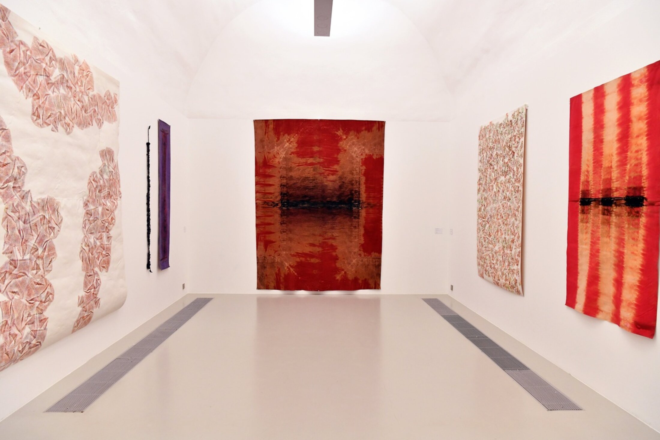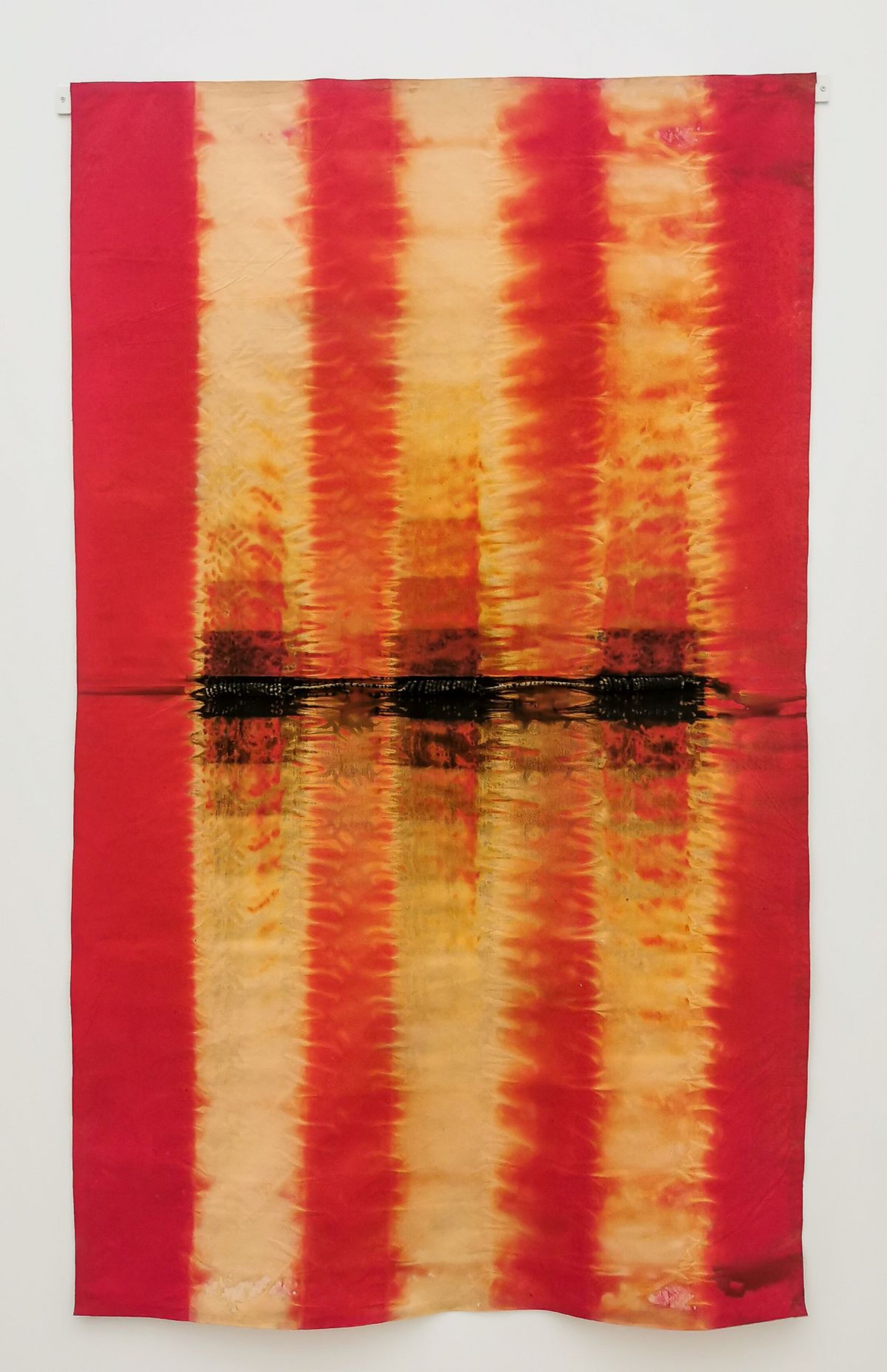 En parallèle, l’artiste questionne le couple toile/outil en l’associant. Il ne s’agit pas de destruction, il la dégrade seulement. Le pigment est coloré de façon à produire cette décoloration. Les effets sont très différents selon les pliures de la toile. Il en résulte des toiles ficelées, contrepliées, calcinées. À l’étage, la première salle expose les œuvres les plus anciennes de la donation. Elles sont datées du début des années soixante-dix, à l’image de deux « empreintes », tissus imprimés d’encre. Souvent, la toile est associée à l’outil qui lui révèle son empreinte. Deux œuvres, datées de 1972 et 1975, témoignent de cette recherche. L’artiste développe une pratique de vidéo-combustion, comme le montre le film « Grands Bois » tourné en 2007 à la Réunion, et dans lequel il met le feu à l’usine sucrière désaffectée de Grands Bois à Saint-Pierre en douze étapes qui sont autant de tableaux éphémères.