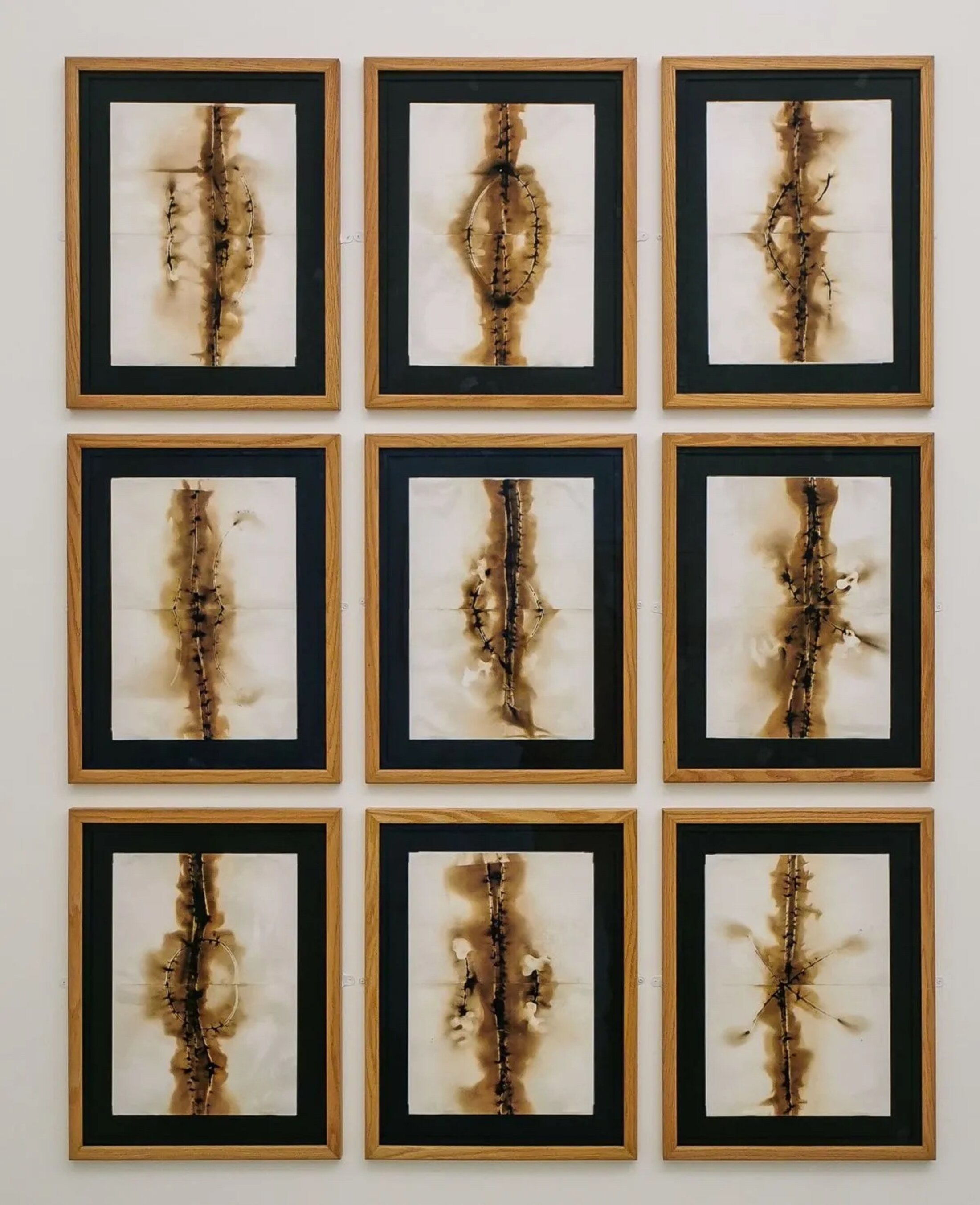 La collection d’œuvres sur papier présente un ensemble de vingt-quatre dessins. Bien que les œuvres graphiques accompagnent toutes les périodes de création de l’artiste, celles de la donation sont issues du procédé de combustion par mèche lente. En raison de la fragilité même du medium, ces dessins sont bien plus déformés encore que les toiles et présentent toute une gamme colorée, conséquence du brunissement graduel de la feuille sous l’effet du feu. Certains conservent une odeur persistante, celle du souvenir de la combustion une fois celle-ci achevée. De ce paradoxe que représente le face-à-face entre la fragilité du papier et l’explosif, il reste la trace, parfois le stigmate, jamais la blessure.