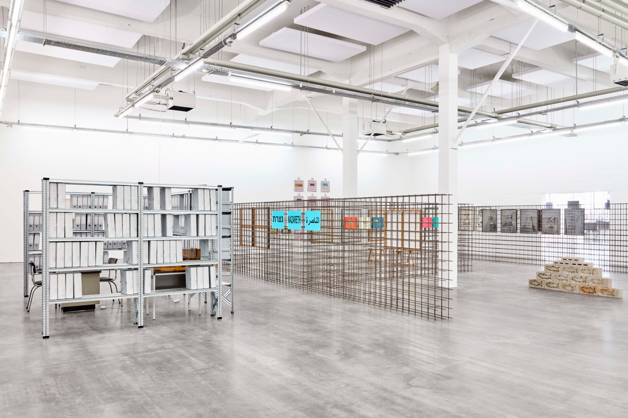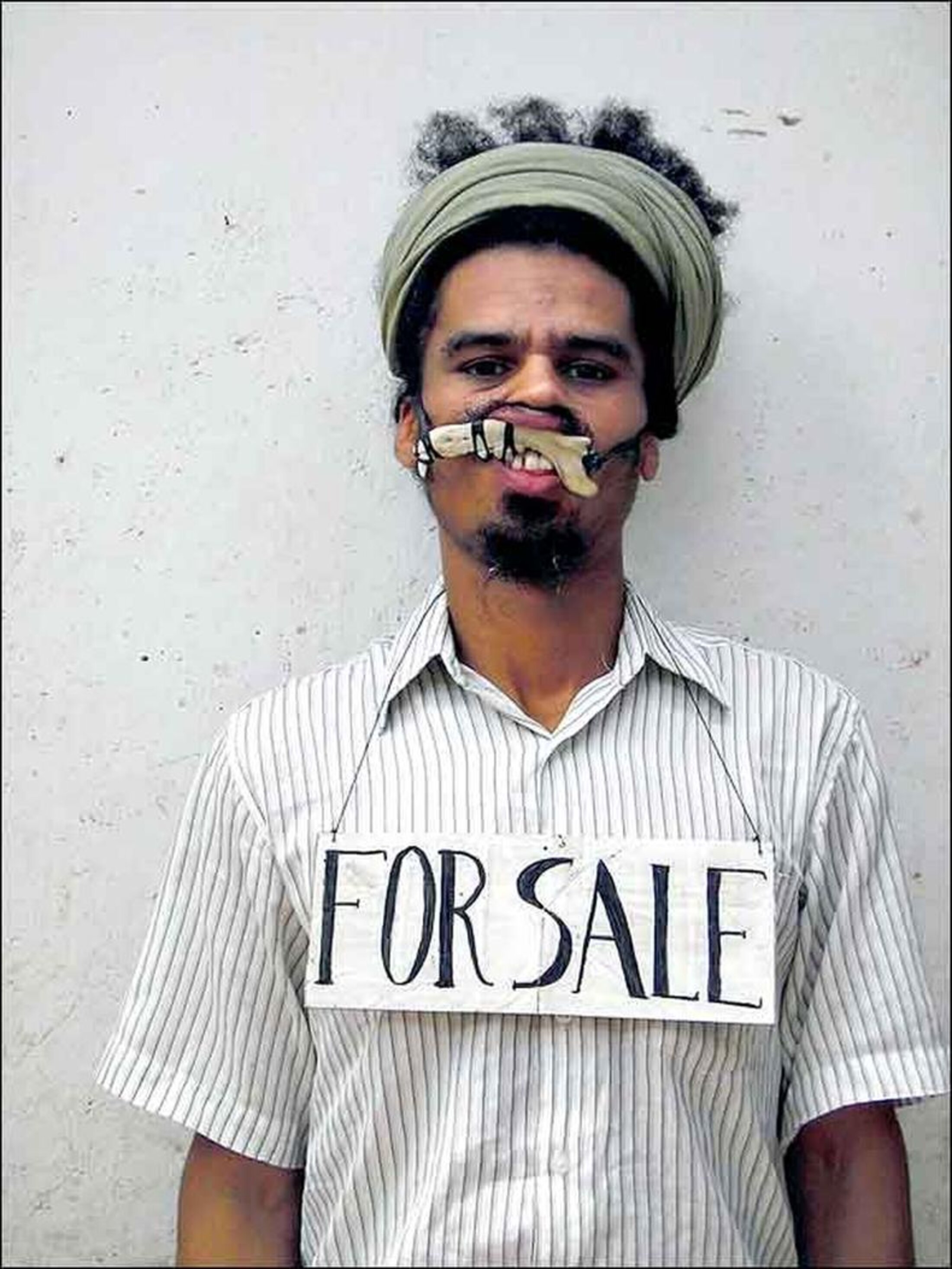 Ce concept d’archive vivante s’exprime pleinement dans la « CAM (The immigration cooperative) », projet qui ouvre le parcours de l’exposition belge, et qui part à la rencontre de travailleurs immigrés africains aux prises avec le système d’immigration opaque de Bruxelles, et dont les histoires sont tissées dans l’œuvre à travers leurs expériences. Les boites d’archives et les dossiers quittent alors leur fonction bureaucratique pour devenir des réserves de luttes partagées. Tout à la fois installation, performance et projet en cours, cette archive grandit avec le temps. Ces récits personnels de migration s’incarnent collectivement dans l’immense structure métallique qui occupe la première salle de l’exposition, renvoyant aux chantiers de construction, aux camps de migrants, figure à la fois de division et d’abri précaires. Sur ces fausses grilles caddies sont disposées plusieurs œuvres qui font de la structure un espace de résistance. Parmi celles-ci, des clichés extraits de la série photographique « Para Venda » (2011) forment une critique virulente du regard colonial. Ils mettent en scène l’artiste en « homme exotique », qu’il se présente de face la mâchoire inférieure d’un petit animal fixée sur sa bouche, ou de profil la tête enfouie dans le crane d’un animal, à chaque fois affublé d’un bout de carton sur lequel est écrit : « À vendre », dans une langue différente sur chaque cliché, renvoyant aux histoires complexes de commerce et de colonisation. En utilisant le vocabulaire marchand, l’artiste dénonce la déshumanisation des corps indigènes et noirs tels qu’ils ont été vus et vendus pendant plusieurs siècles. Ce corpus fait également référence aux zoos humains[6]. Symboles oubliés de l'époque coloniale, totalement refoulés de notre mémoire collective, ils sont présentés dans les métropoles occidentales, du XIXème siècle[7]jusqu’à la Seconde Guerre mondiale[8], comme des expositions d'ethnographie coloniale ou des villages indigènes. En rendant l’exotisme de son identité exclusivement transactionnel, Paulo Nazareth subvertit le récit attendu pour en faire un outil de résistance.